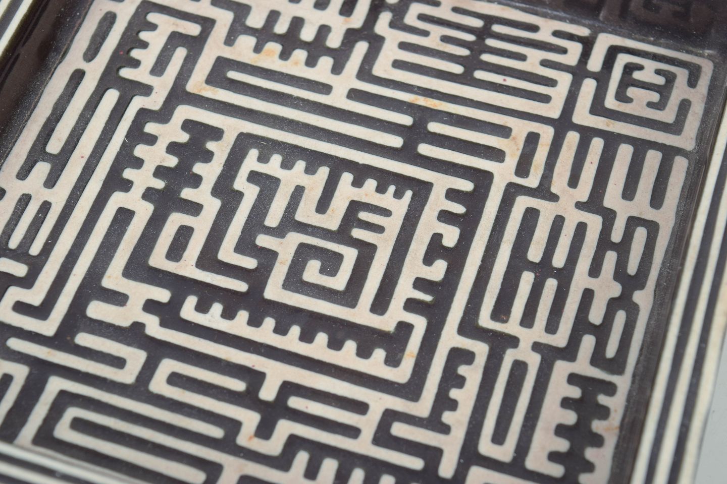 Kvadratisk fad i stentøj dekoreret med det karakteristiske Domino-mønster i sort på lys bund med grafisk labyrintlignende ornamentik. Model Domino.