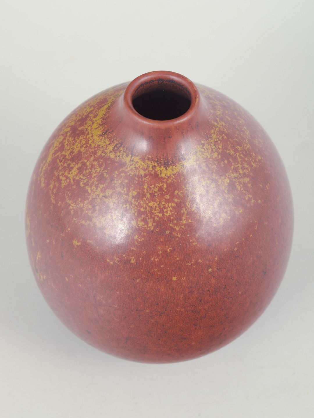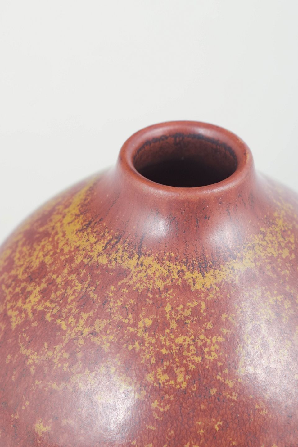 Eva Stæhr Nielsen for Saxbo, vase.Organisk formet vase i stentøj med rund korpus og smal hals, dekoreret med dyb rødbrun glasur med gyldne nuancer.