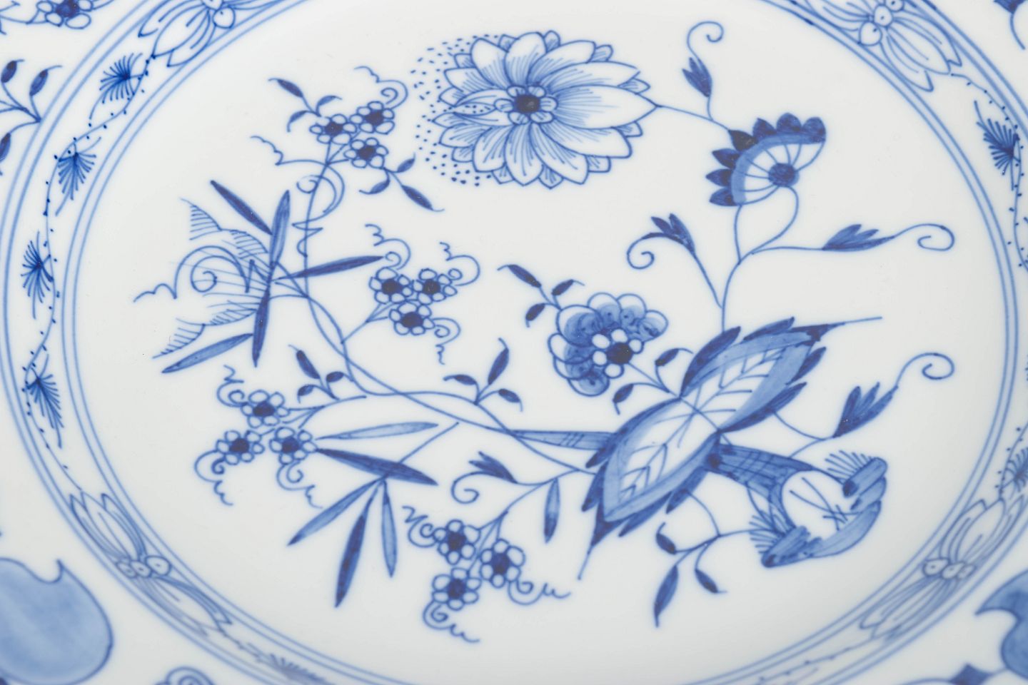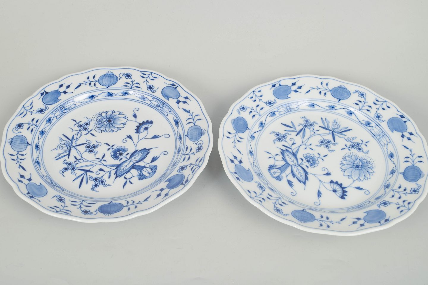 Meissen løgmønster, sæt af to middagstallerkener.To middagstallerkener i porcelæn med håndmalet blå dekoration i det klassiske løgmønster. 1. sortering, fabriksstemplet med Meissens krydssværd. Diameter 24 cm.