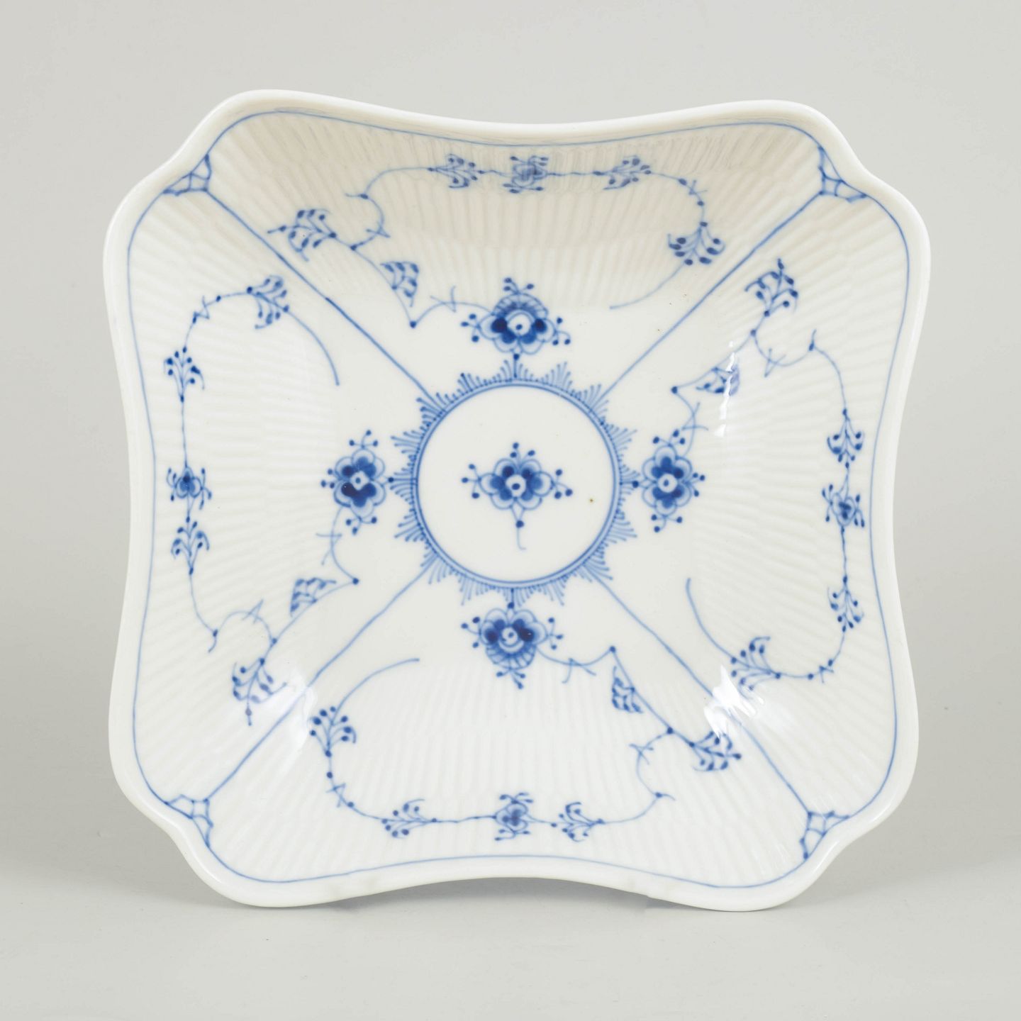 Royal Copenhagen, musselmalet riflet firkantet fad.Firkantet fad i porcelæn dekoreret i underglasur blå med klassisk musselmalet riflet mønster. Model 1/26, 1. sortering, dateret 1966.