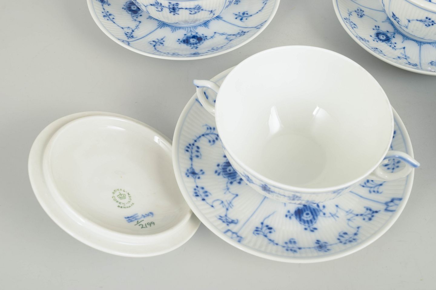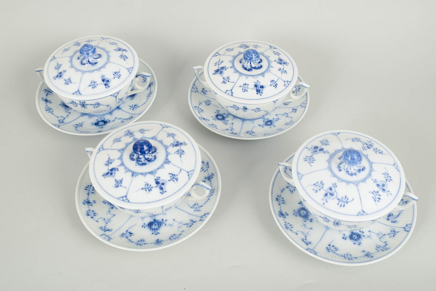 Royal Copenhagen, musselmalet riflet sæt af fire bouillonkopper med underkopper.Sæt af fire bouillonkopper i porcelæn med matchende underkopper, dekoreret i underglasur blå med klassisk musselmalet riflet mønster. Model 1/2199, 1. sortering, dateret 1966.