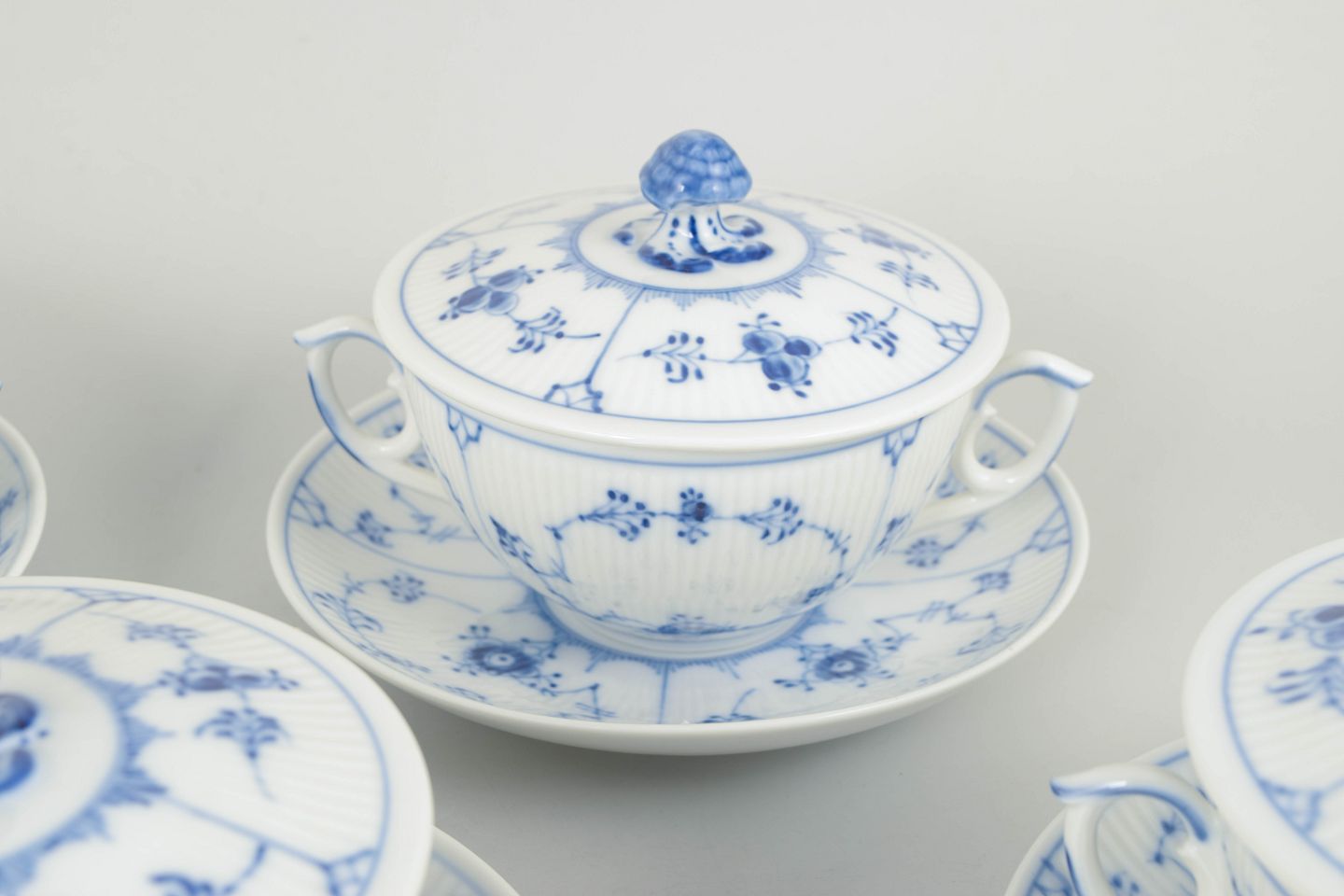 Royal Copenhagen blev grundlagt i 1775 og er en af Danmarks mest betydningsfulde porcelænsfabrikker. Fabrikken er særligt kendt for sine håndmalede dekorationer i underglasur blå, hvor Musselmalet Riflet er blandt de ældste og mest ikoniske stel. Hvert stykke er individuelt dekoreret af porcelænsmalere, hvilket gør hvert objekt unikt.