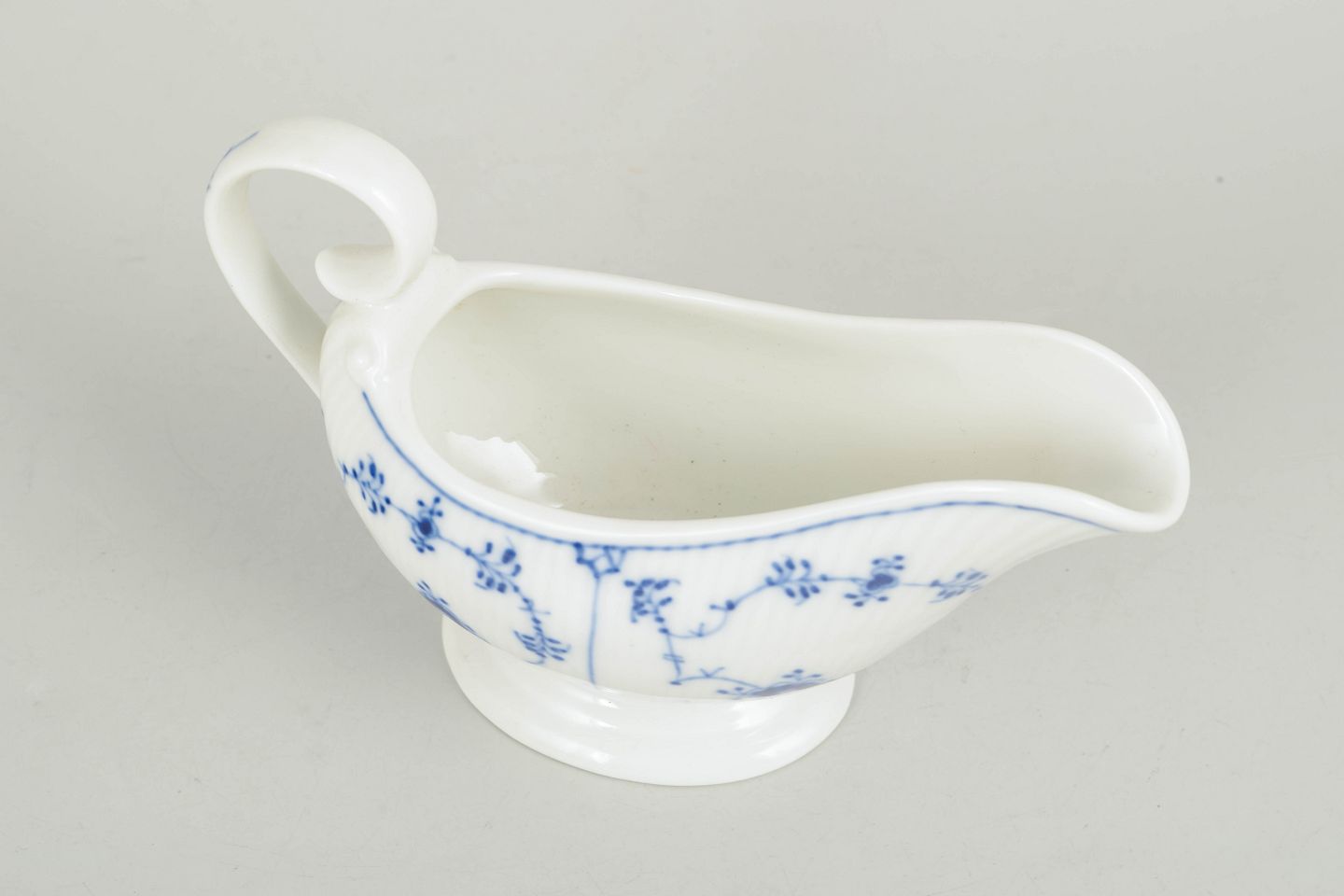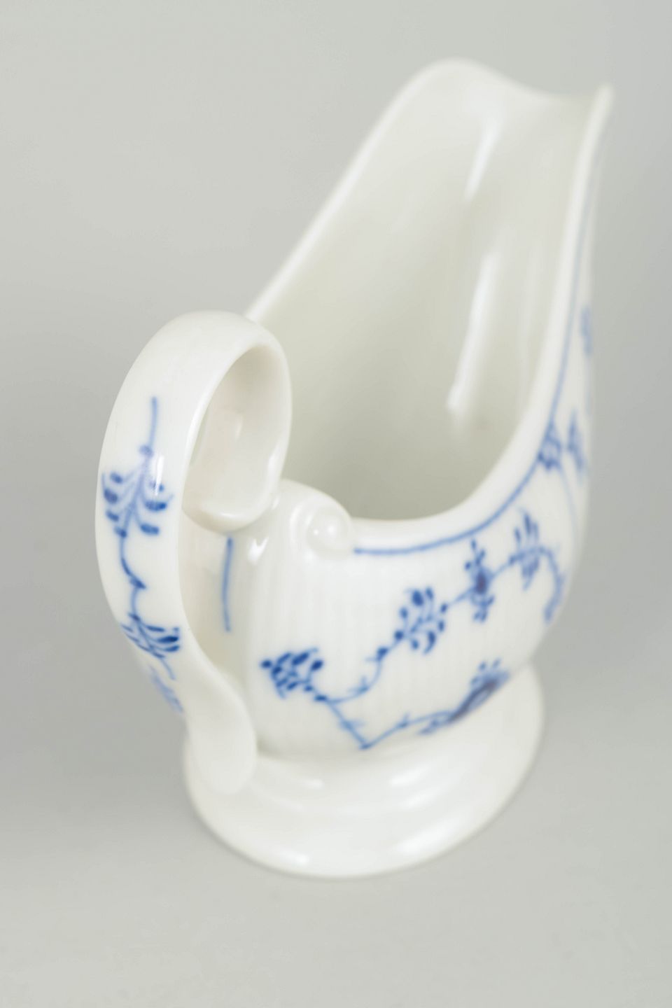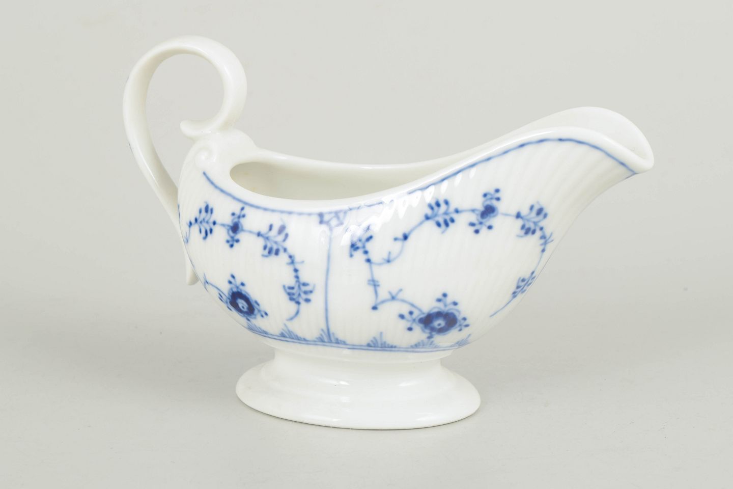 Royal Copenhagen, musselmalet riflet saucekande.Lille saucekande i porcelæn dekoreret i underglasur blå med klassisk musselmalet riflet mønster. Model 1/308, 1. sortering, dateret 1967.