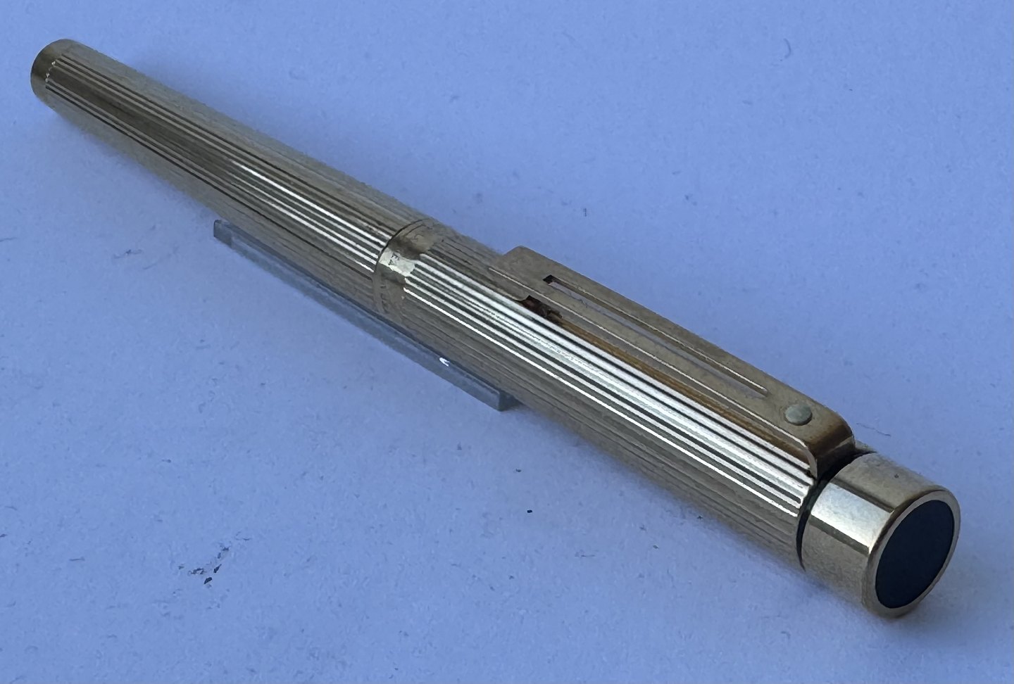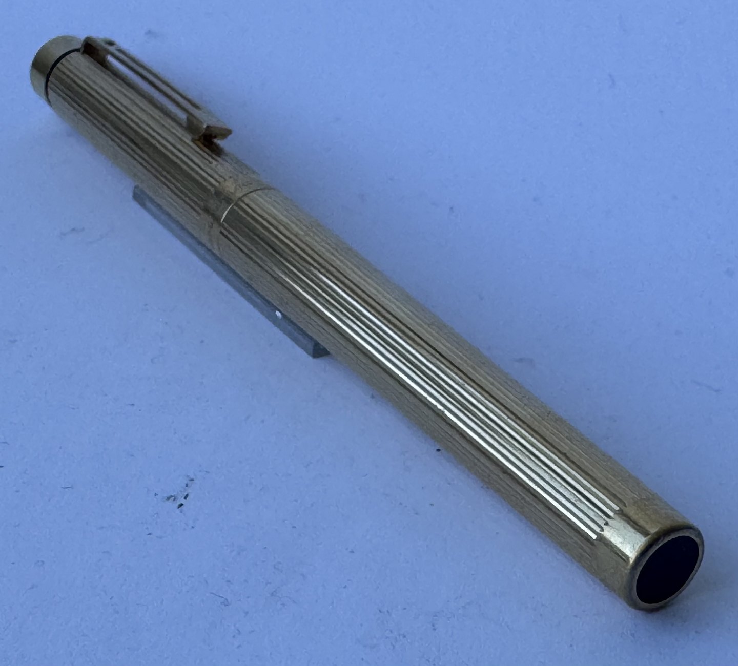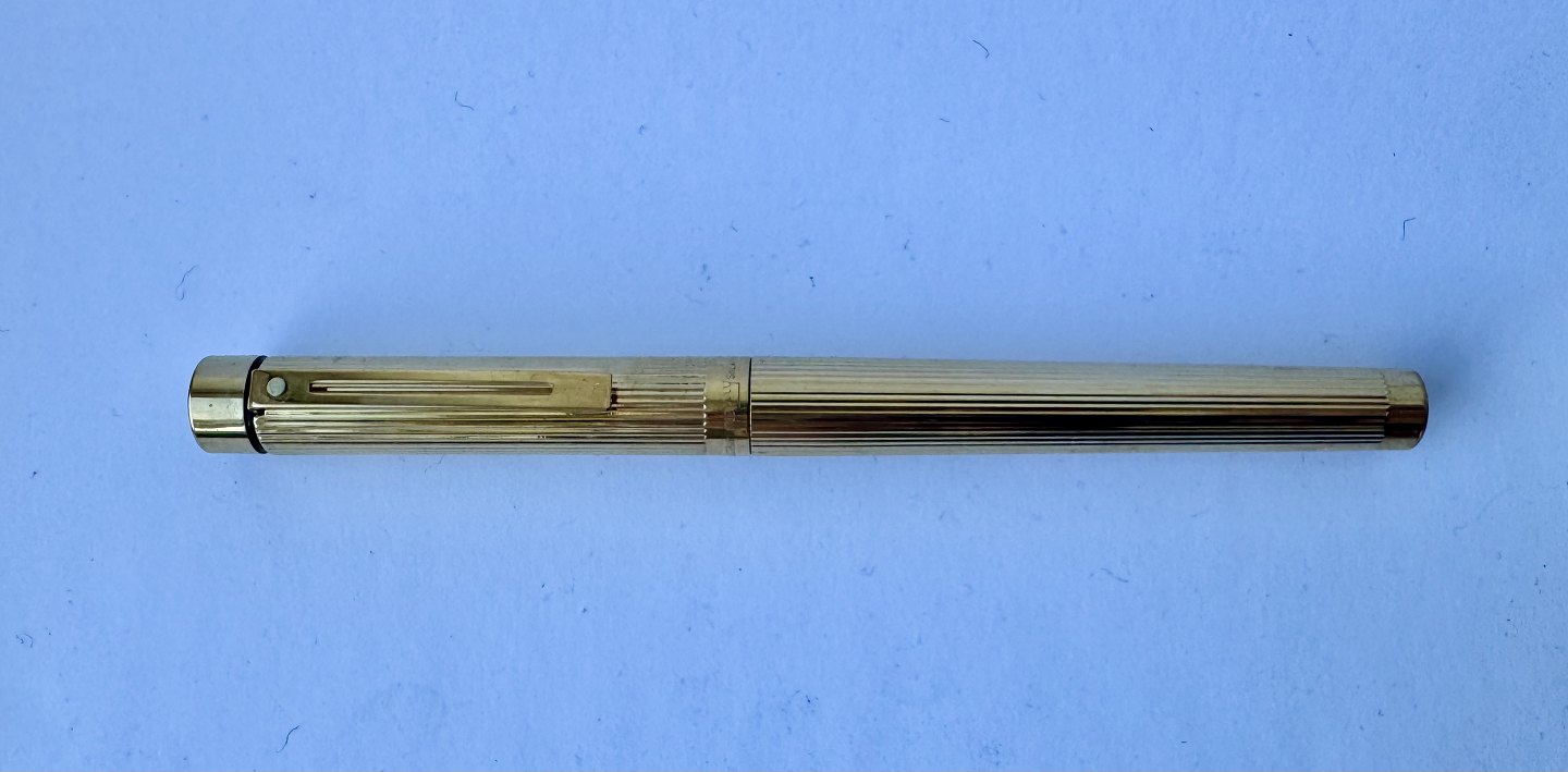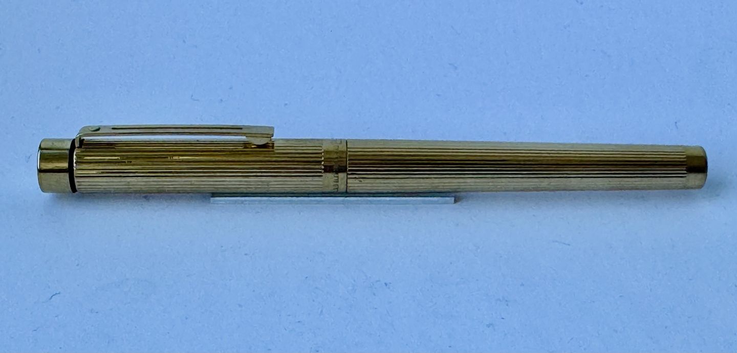 Sheaffer Targa fyldepen i forgyldt metal - “Gold Electeoplated”. 585 14 karat guldspids. Fremstillet i 1980’erne. Ny blæk-pateon skal indsættes før den igen kan skrive. Fremstår i god stand. Ingen skader eller reparationer. L. 14 cmv/ Jesper Reutemann
