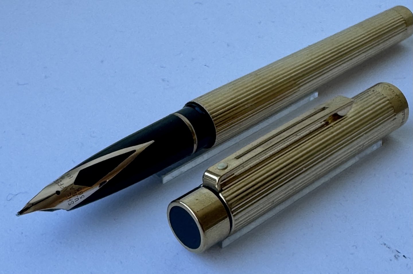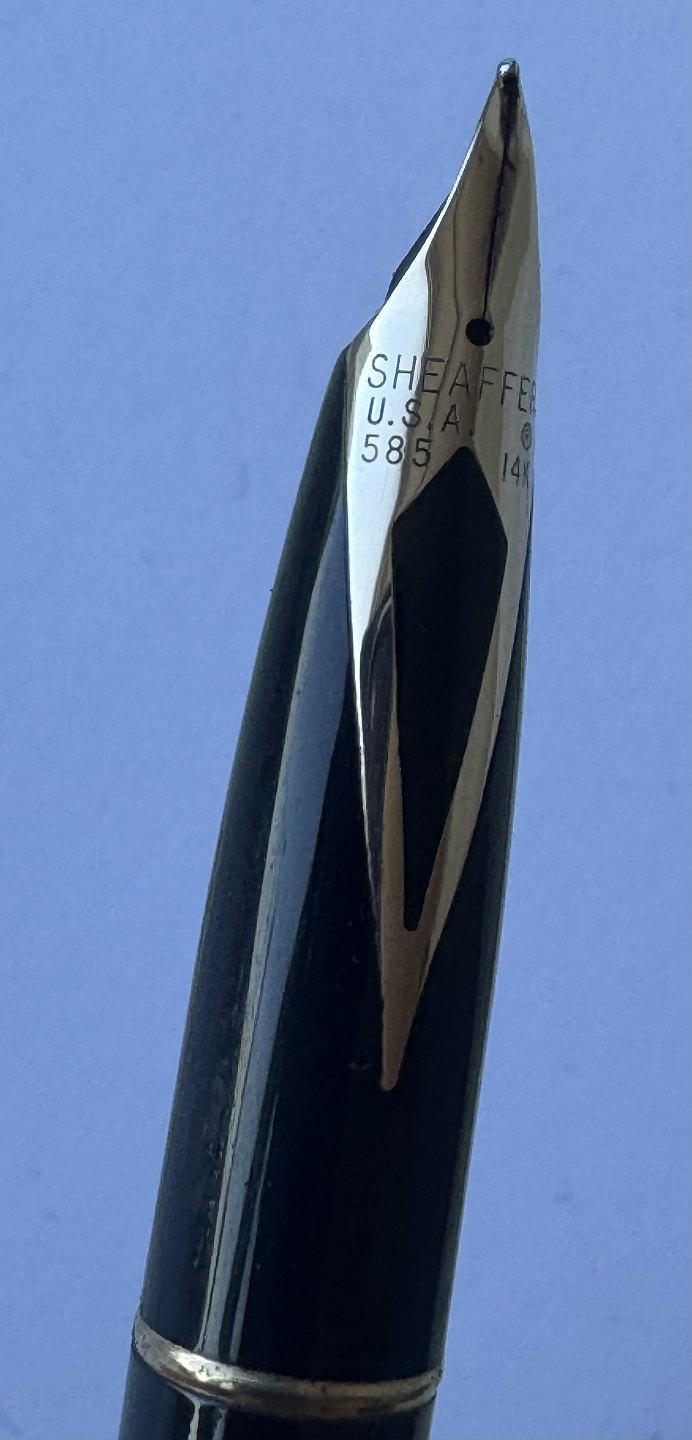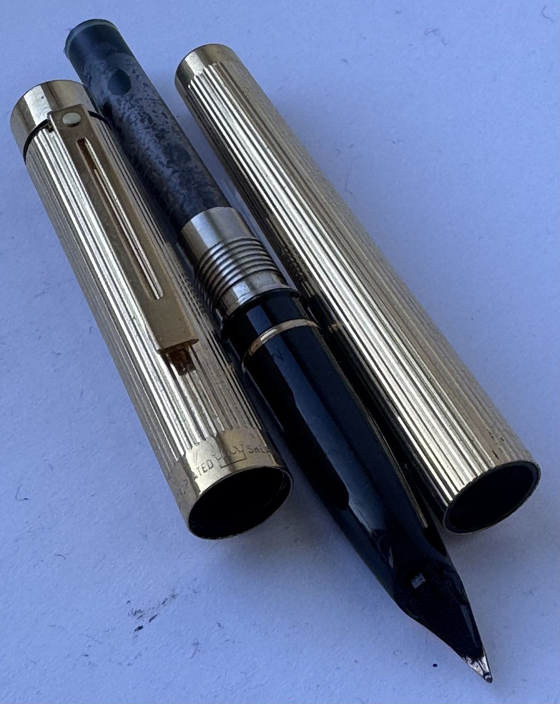 Sheaffer Targa fyldepen i forgyldt metal - “Gold Electeoplated”. 585 14 karat guldspids. Fremstillet i 1980’erne. Ny blæk-pateon skal indsættes før den igen kan skrive. Fremstår i god stand. Ingen skader eller reparationer. L. 14 cmv/ Jesper Reutemann