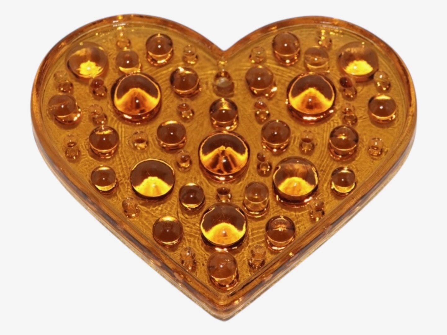 Glasværk fra Sverige, solfanger i form af karamelfarvet hjerte fra 1970'erne eller 1980'erne.Måler 11,0 x 9,5 cm.