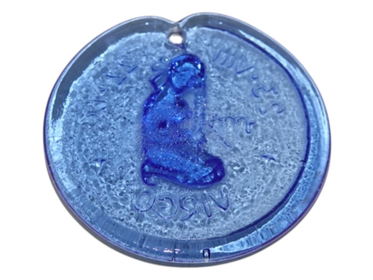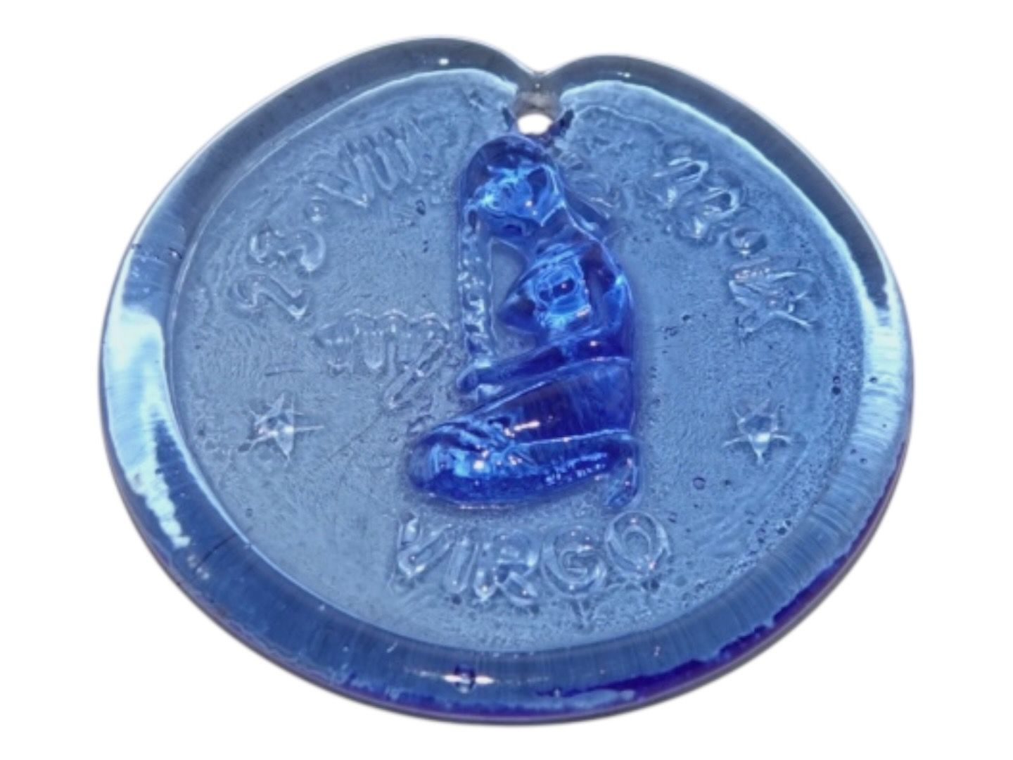 Holmegaard, lille blå solfanger med stjerneteget Virgo (Jomfru) fra 1970'erne.Diameter 5,5 cm.