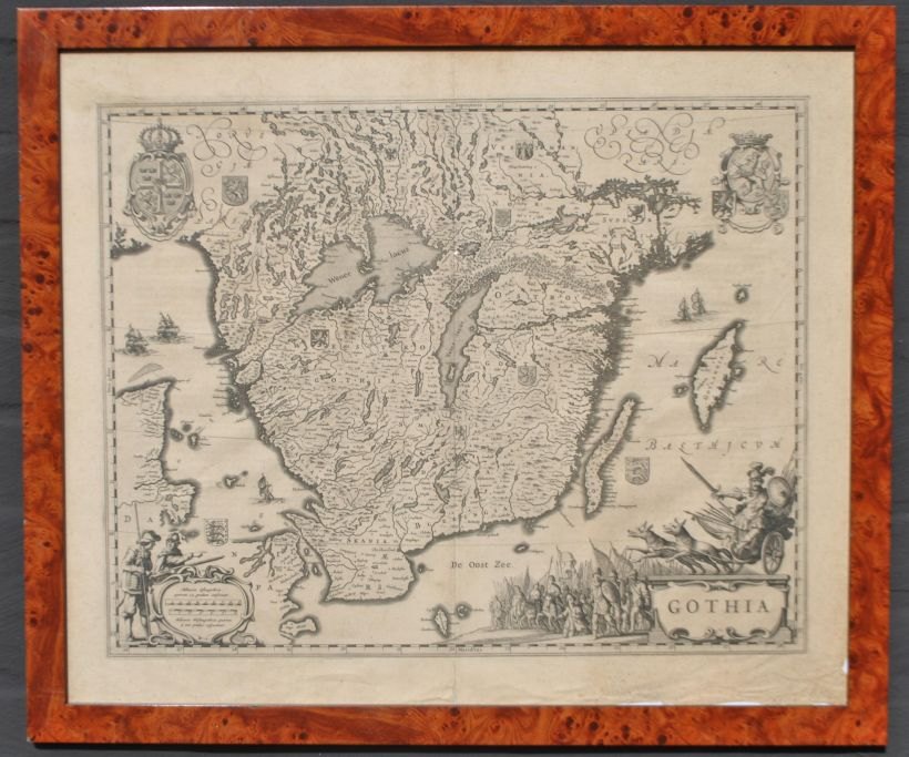 Van den Keere, Pieter (1571 – c. 1646) Holland: Kort over Sydsverige. ca. 1610. Kobberstik. Usigneret. Latinsk udgave. H: 41,5 cm. B: 53 cm.Indrammet: H: 55 cm. B: 65 cm.