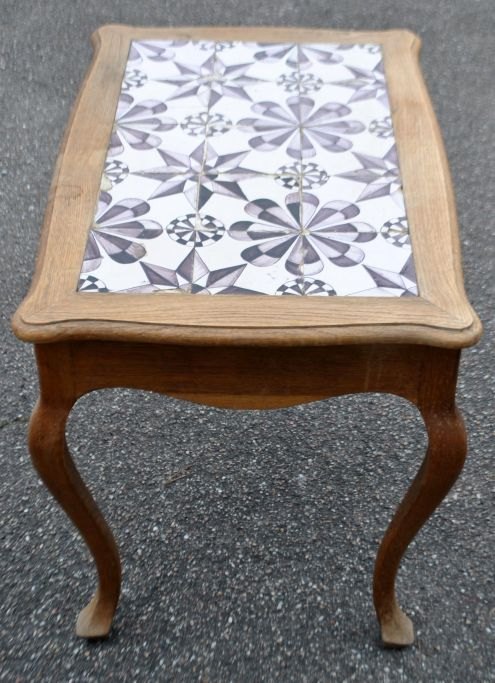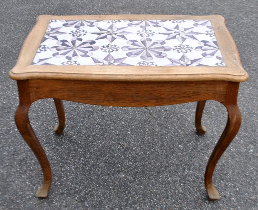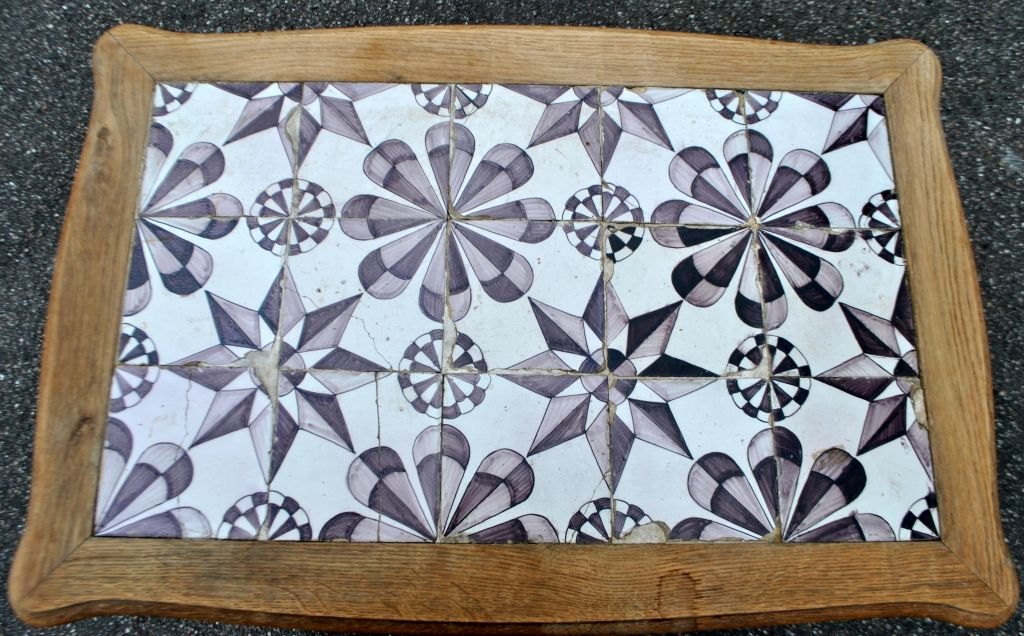 Flisebord i eg, barokstil, 20. årh. Danmark. H: 60 cm. L: 78 cm. B: 53 cm. Med 15 originale stjernefliser i mangan fra sidste del af 1700-tallet, Frisland. 13 x 13 cm.Emne nummer: 29125