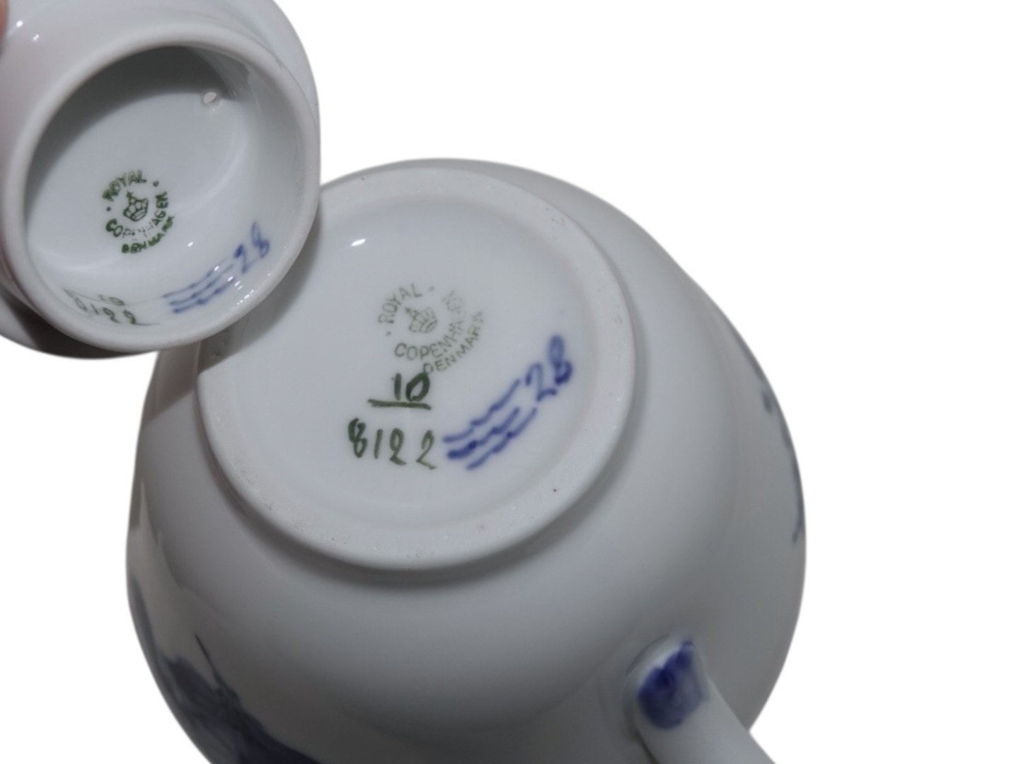 Royal Copenhagen Blå Blomst Flettet, lille tekande.Fabriksmærket viser, at denne er produceret i mellem 1923 og 1928.