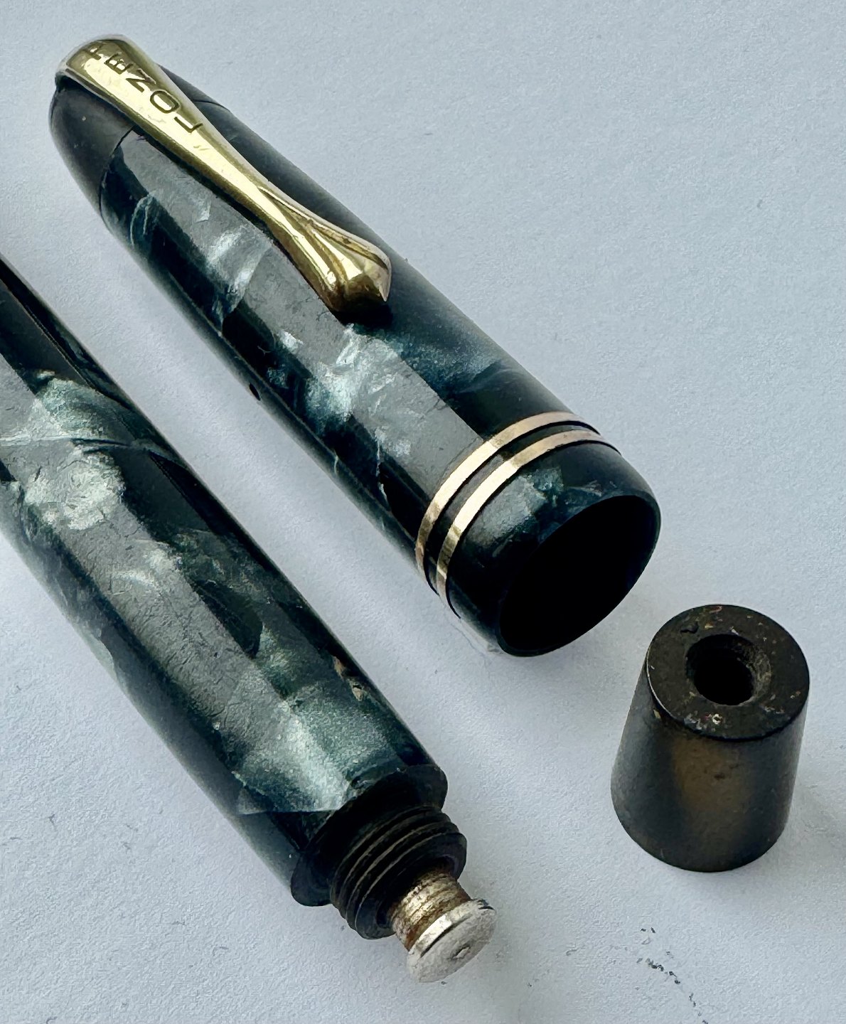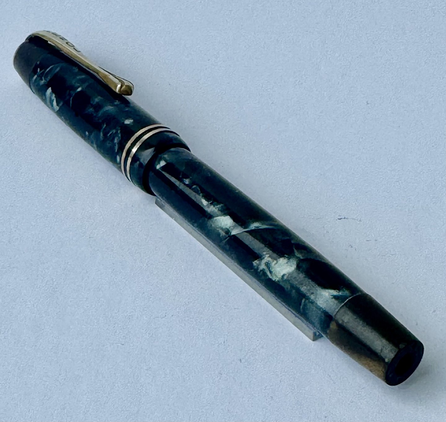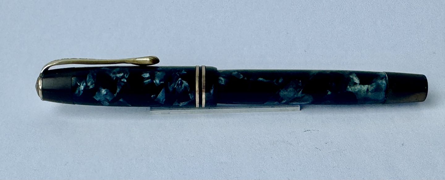 Blå marmoreret Penol Ambassador no. 5 fyldepen. Push button filler. Der skal indsættes en ny gummisæk før den igen kan optage blæk og skrive igen. Ny gummisæk kan indsættes for et tillæg på kr. 250,- Alle dele originale til denne model. Ingen skader eller reparationer. Dog mangler “knappen” på den lille korte bundskrue, hvorfor der er hul - se fotos. Længde 13 cmv/ Jesper Reutemann
