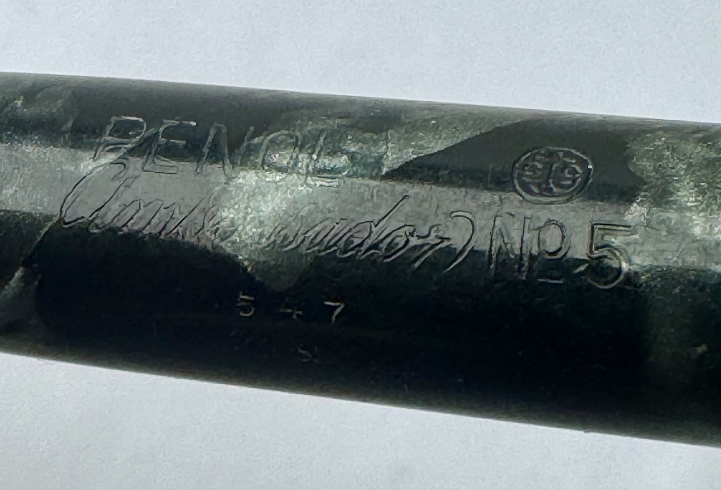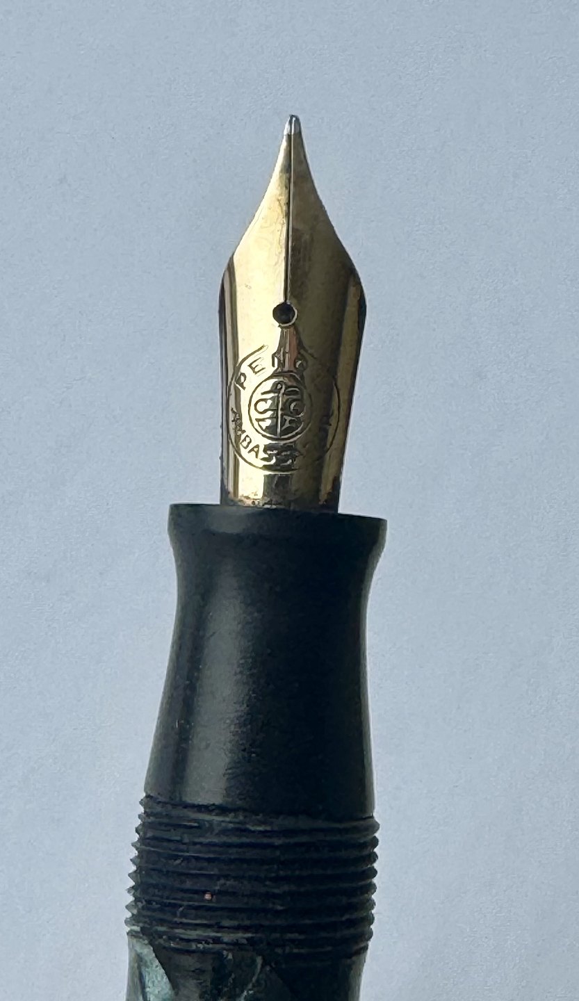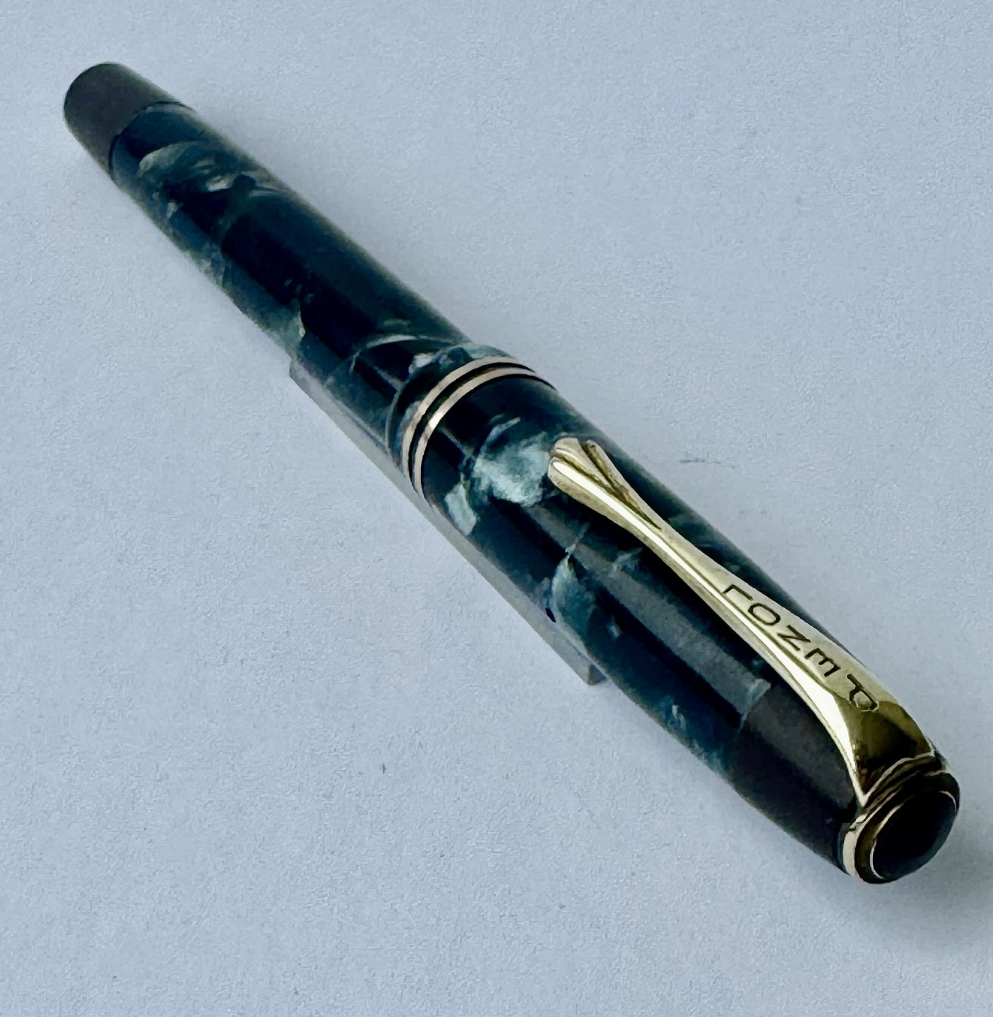 Blå marmoreret Penol Ambassador no. 5 fyldepen. Push button filler. Der skal indsættes en ny gummisæk før den igen kan optage blæk og skrive igen. Ny gummisæk kan indsættes for et tillæg på kr. 250,- Alle dele originale til denne model. Ingen skader eller reparationer. Dog mangler “knappen” på den lille korte bundskrue, hvorfor der er hul - se fotos. Længde 13 cmv/ Jesper Reutemann