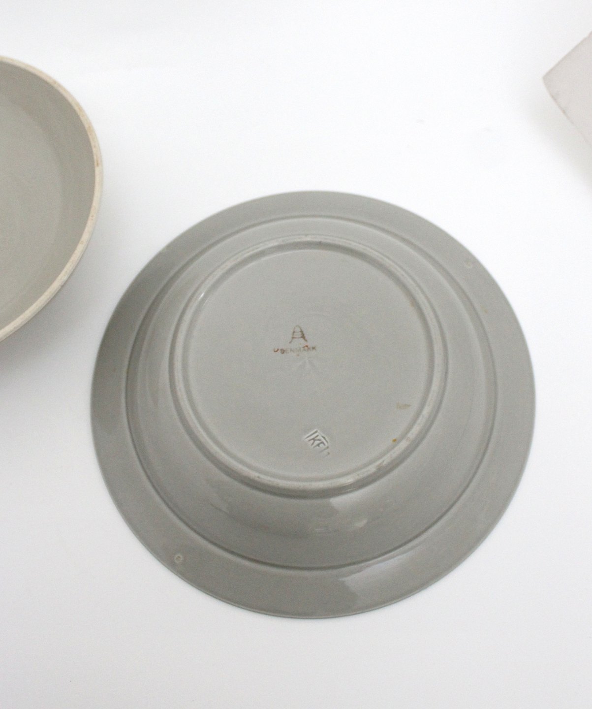 Aluminia, Tureby, grå fajance med orange fane samt guldkant. Designet af Nils Thorsson 1934-1968. Lågskål eller kompotskål, sjælden. Diameter 21 cm. Højde uden låg 4 cm. Med låg 11 cm. Fin stand. Pris: 350 kr. stk. Lager: 1 Udstiller