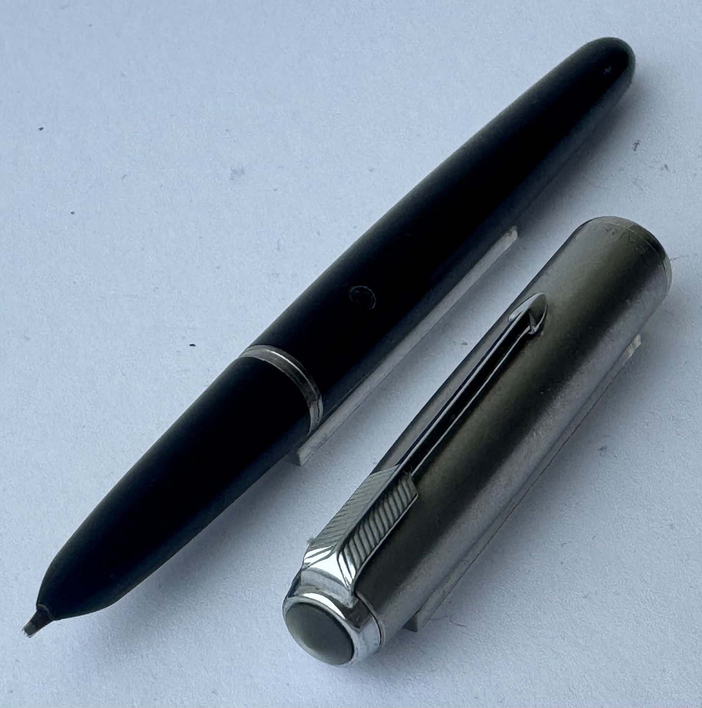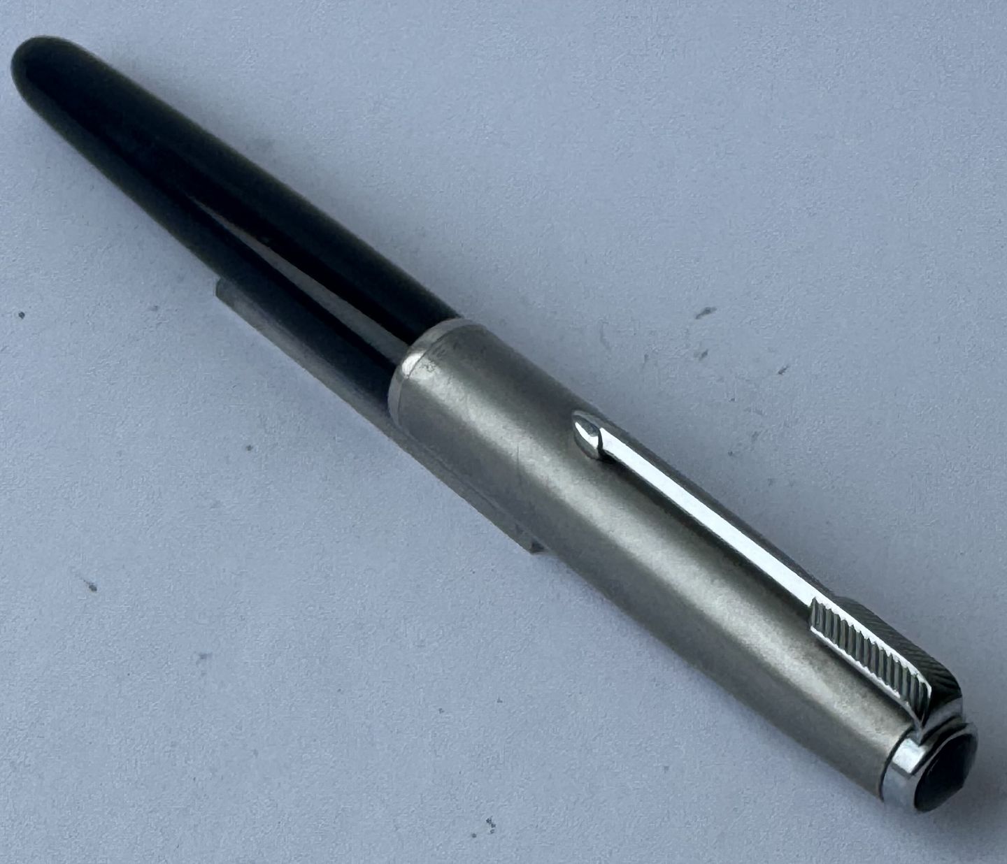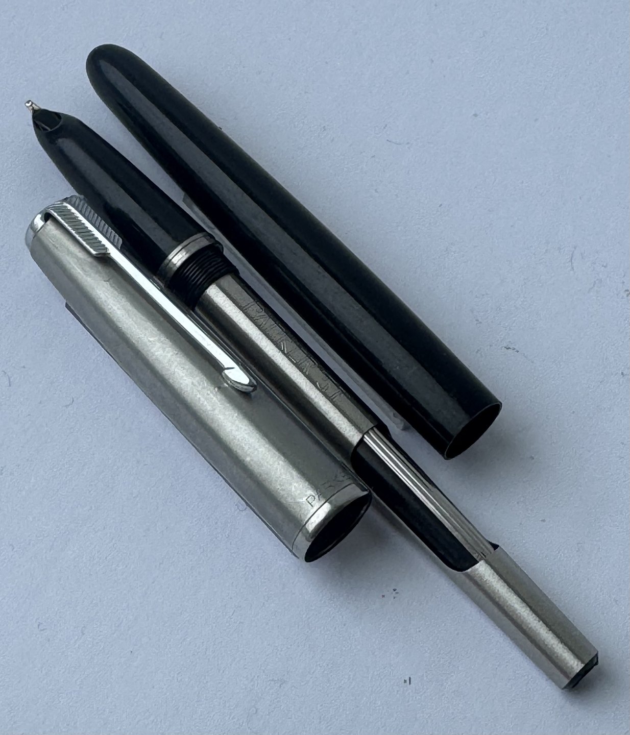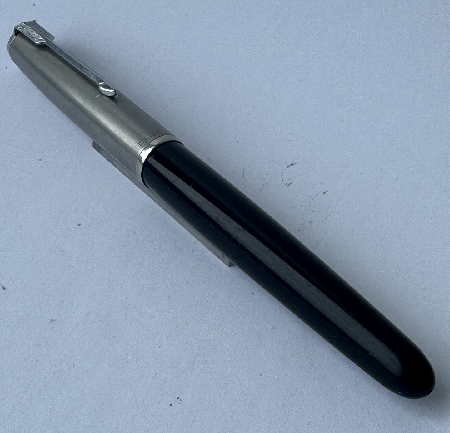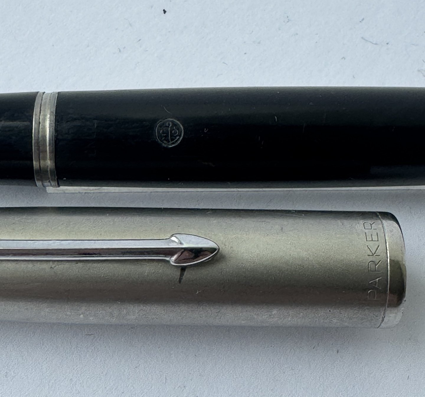 Sort Parker 51 fyldepen med hætte i stål fra 1950’erne. Fremstår i god og funktionsdygtig stand. Ingen fejl eller mangler at beskrive. På siden ses “the danish anchor”, som er fyldepenne producenten og forhandleren Christian Olsens firmalogo. Fyldepenne der var importeret til Chr. Olsens fabrikker blev stemplet med dette logo lige såvel som virksomhedens egne produkter, eksempelvis Penol.v/ Jesper Reutemann