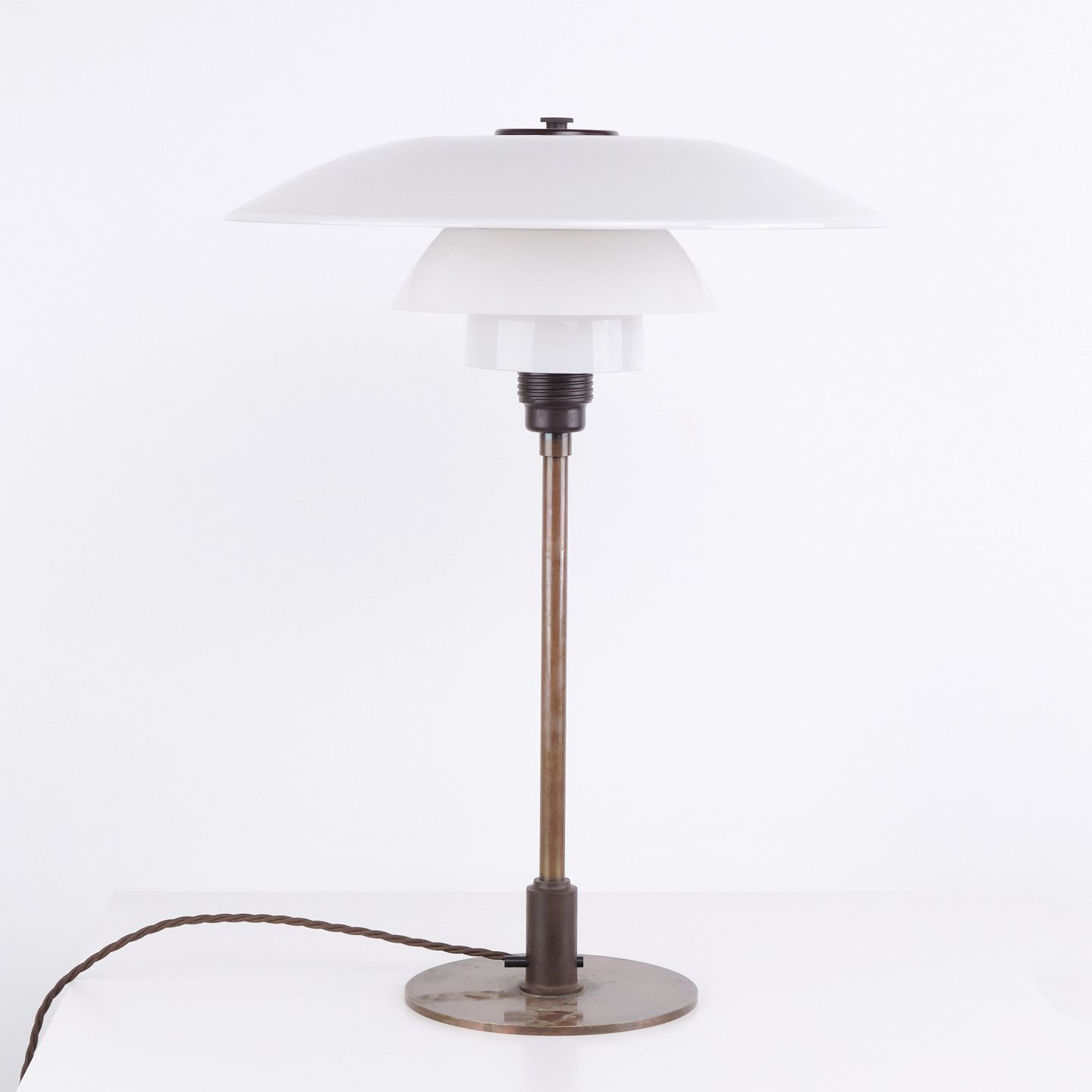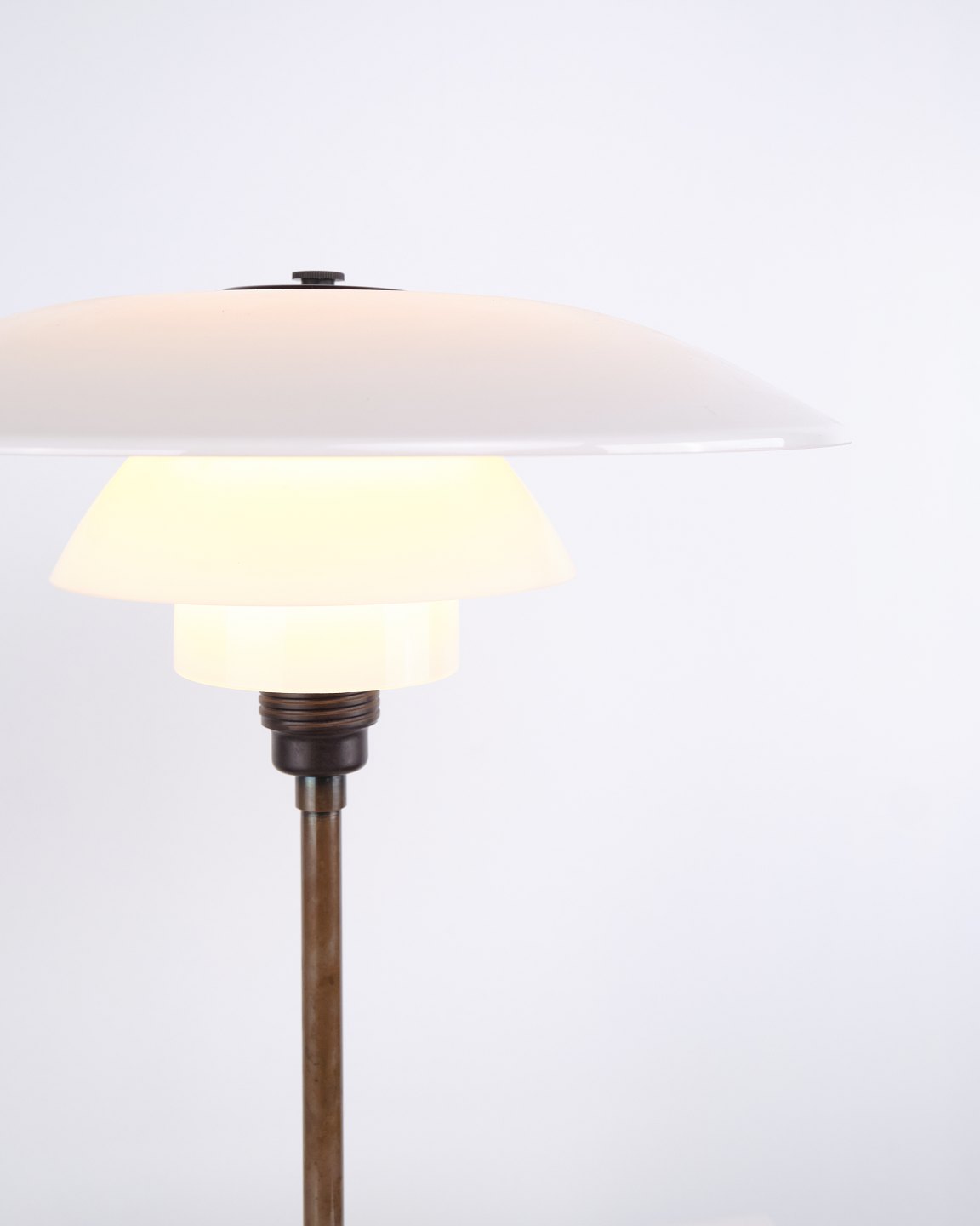 PH 4/3 bordlampe designet af Poul Henningsen og fremstillet af Louis Poulsen i 1930’erne. Lampen er udført i bruneret messing med skærme i hvidt opalglas, hvilket giver et varmt og afbalanceret lys. Det ikoniske flerskærmssystem er udviklet til at sikre blændfri belysning og optimal lysfordeling.— Oprindelse: Danmark