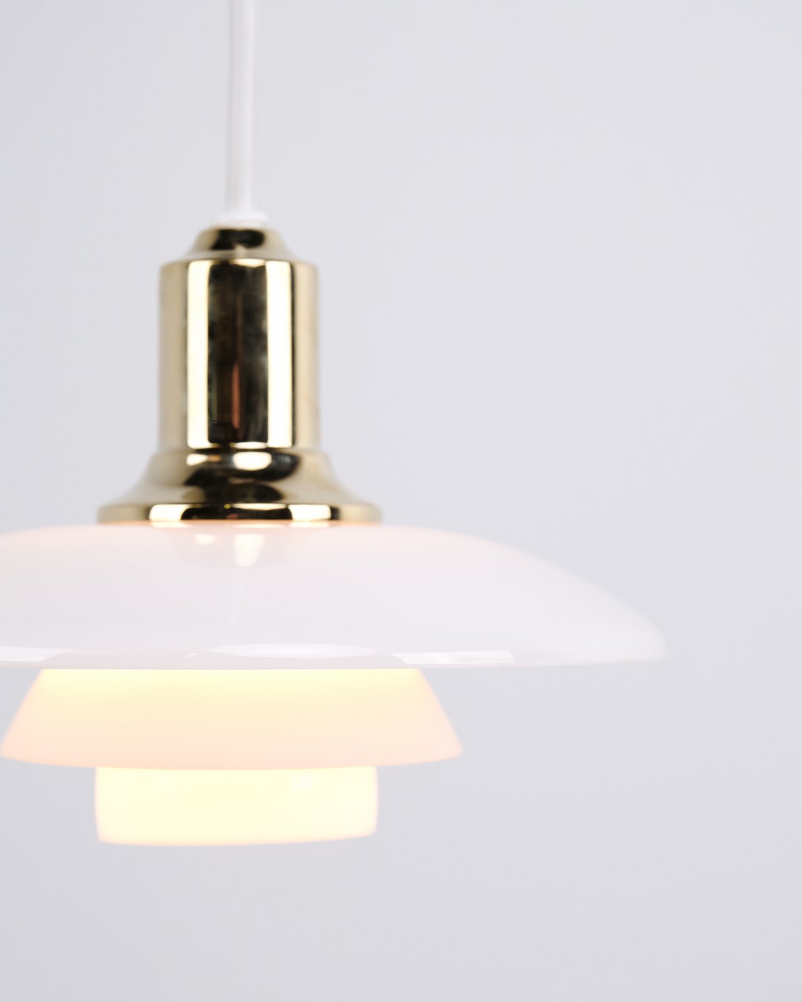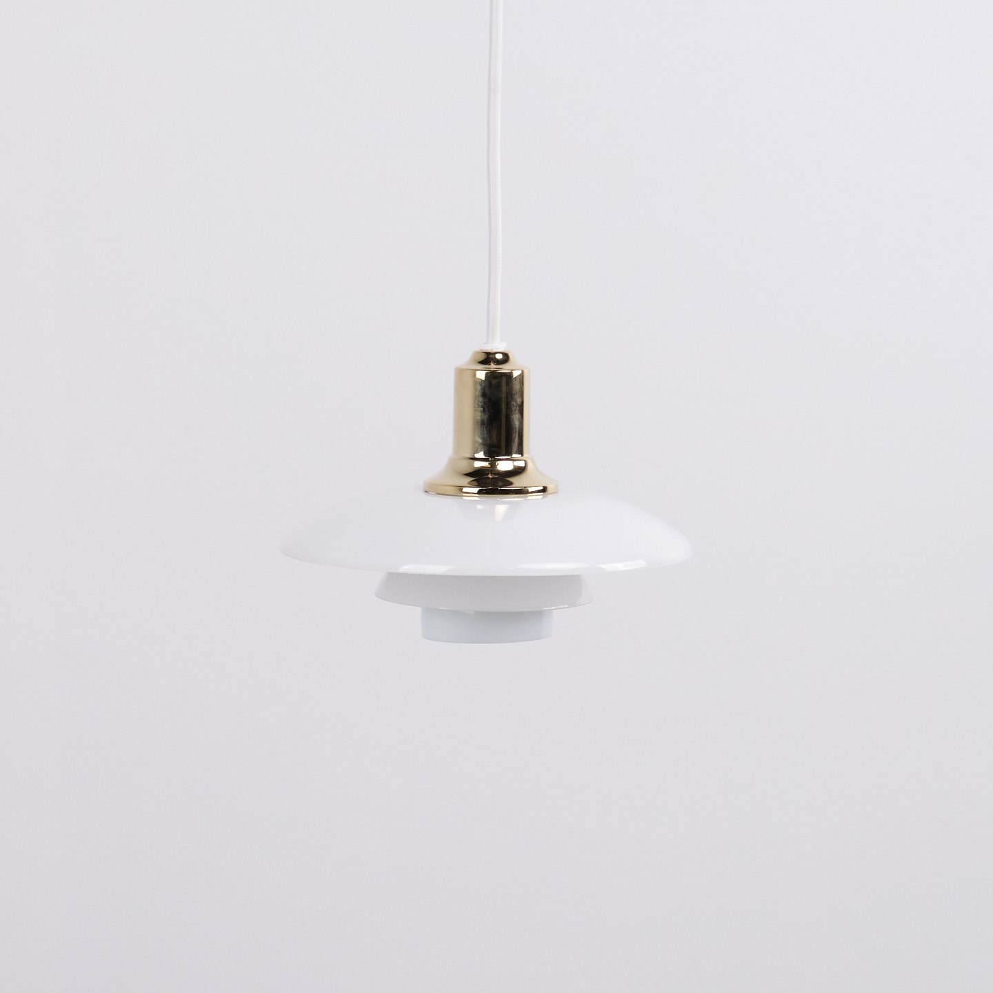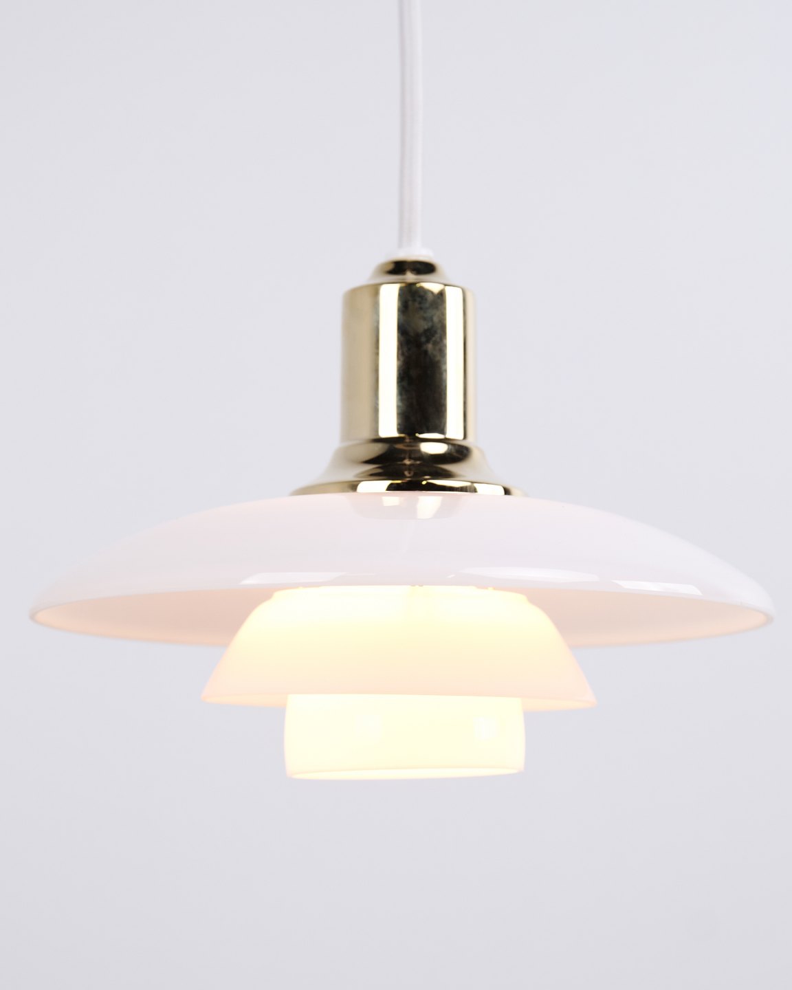 PH 2/1 pendel i messing med opalglas fra Louis Poulsen. Designet af Poul Henningsen med klassisk dansk lysdesign og blændfri belysning.— Oprindelse: Danmark