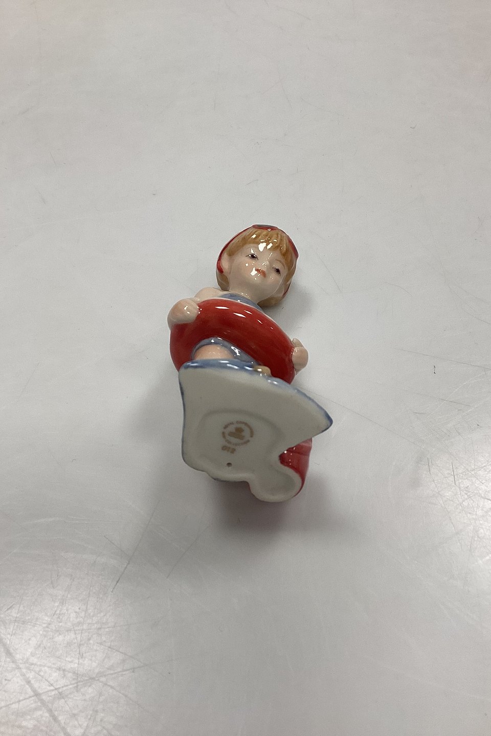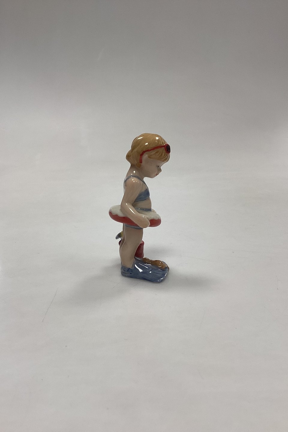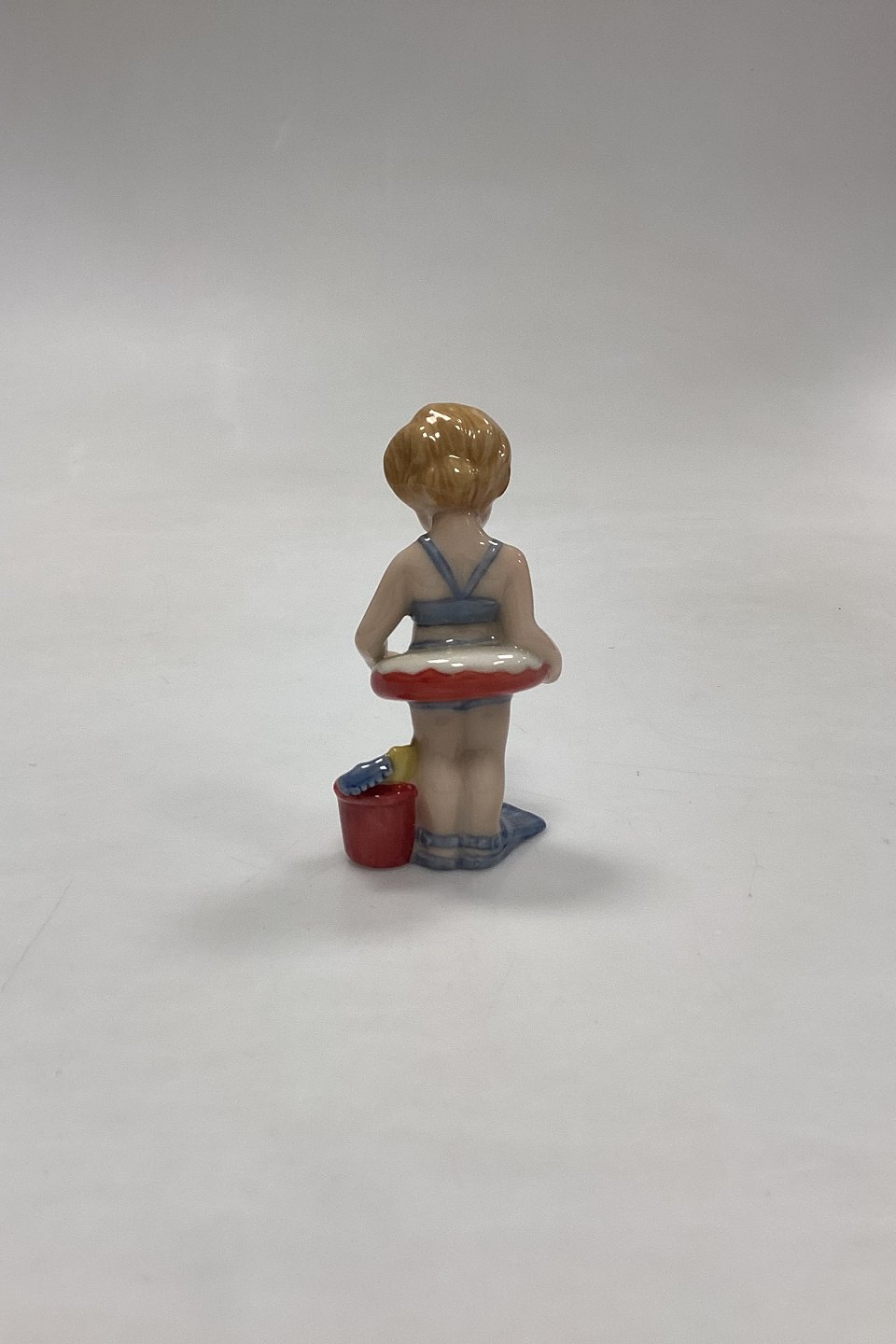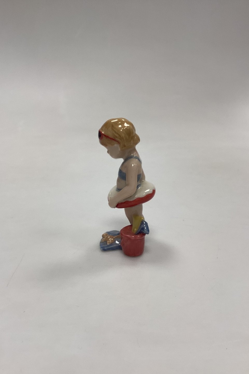 Royal Copenhagen Minibørn Figur - Christina No. 012. Pige med badering, spand og svømmefødder. Designet af Sven Vestergaard.Måler 9,5 cm / 3,74 in.