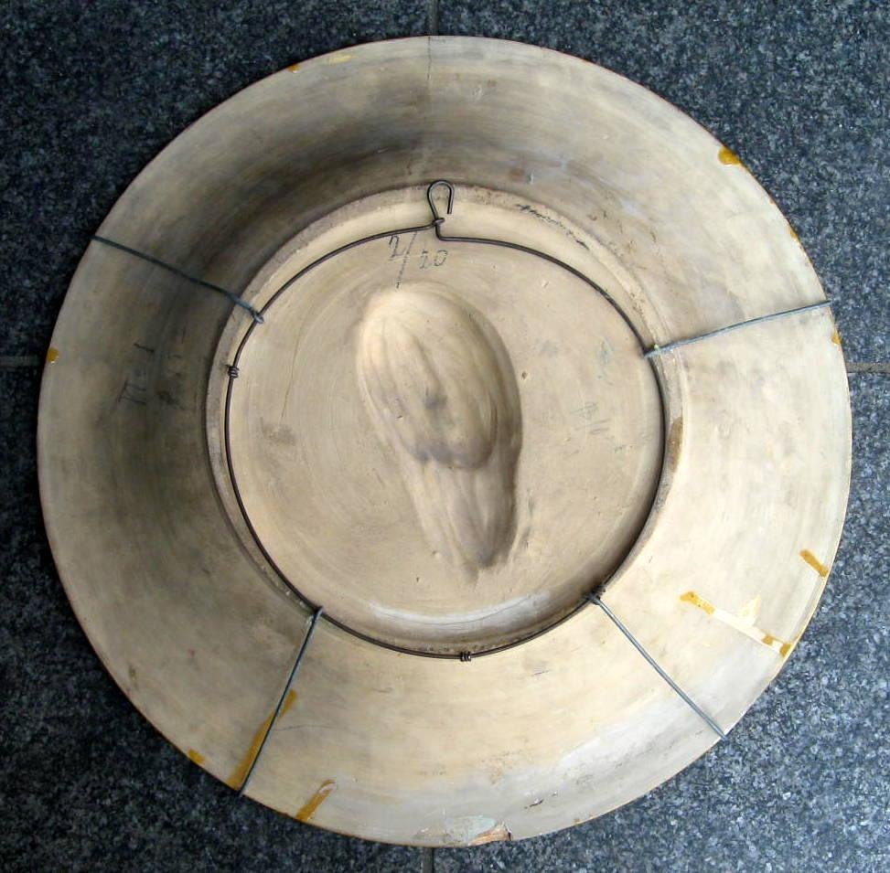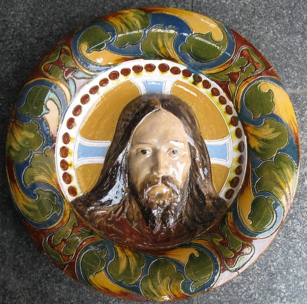 Dansk keramiker (19. årh.) Danmark: Kristus. Rødler med glasur. I farverne grøn, brun, blå, hvid og lyseblå. Ikke signeret. Dia.: 40 cm. På bagsiden forskellige blyantsantegninger, hvor der angives priser i dollars. Værket har antagelig været udstillet i USA. Med reparationer.Emne nummer: 7766