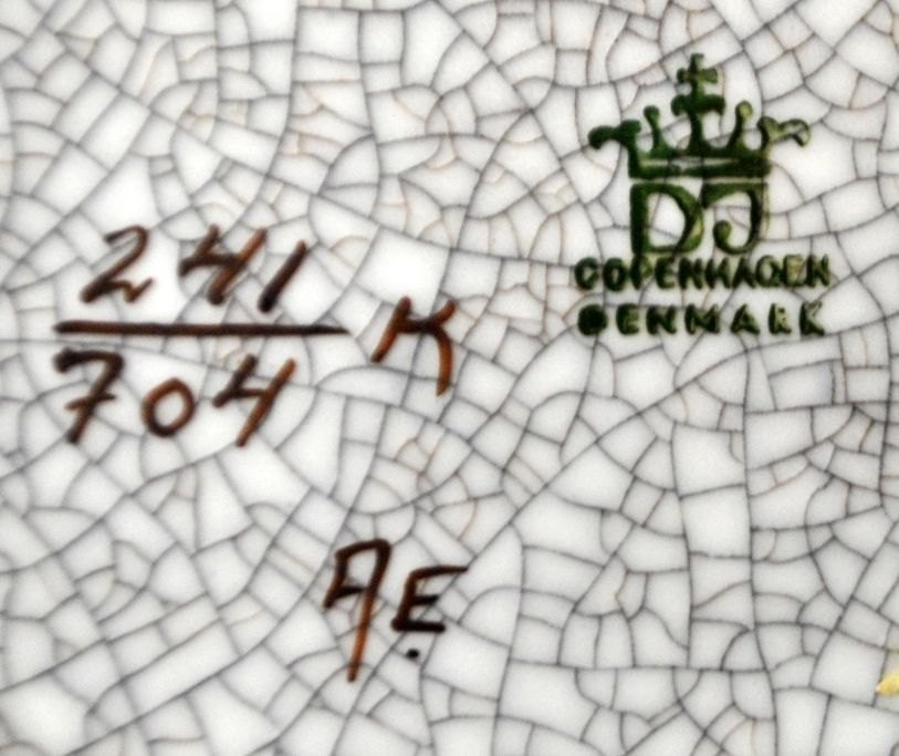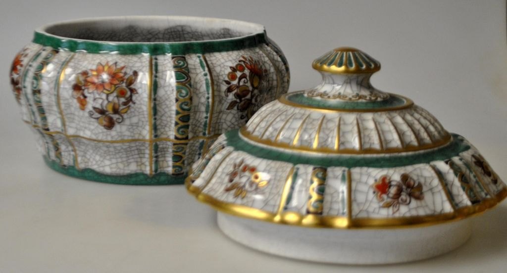 Dahl Jensen lågkrukke i craquelle, 241/704, 20. årh. København, Danmark. Håndmalede blomstermotiver, grønt og forgyldninger. H: 16 cm. Dia: 19 cm.Emne nummer: 29029