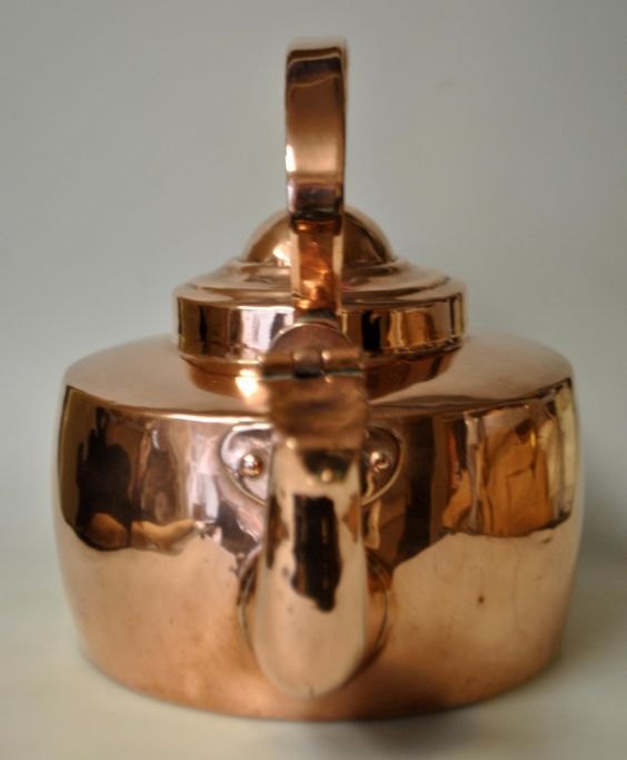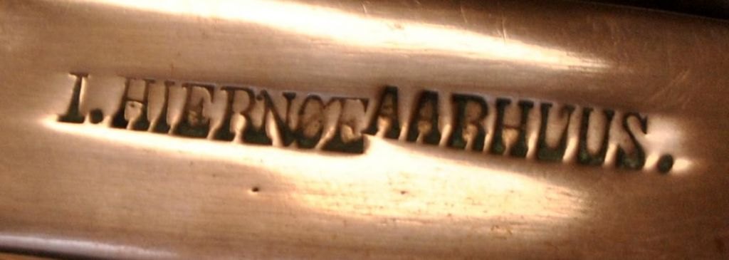 Kobber kedel, J. Hjernøe (1832-1871), Aarhus, Danmark. Stemplet. Med hank og tud. Låg med messing knop. Højde med hank: 22 cm.Emne nummer: 29031