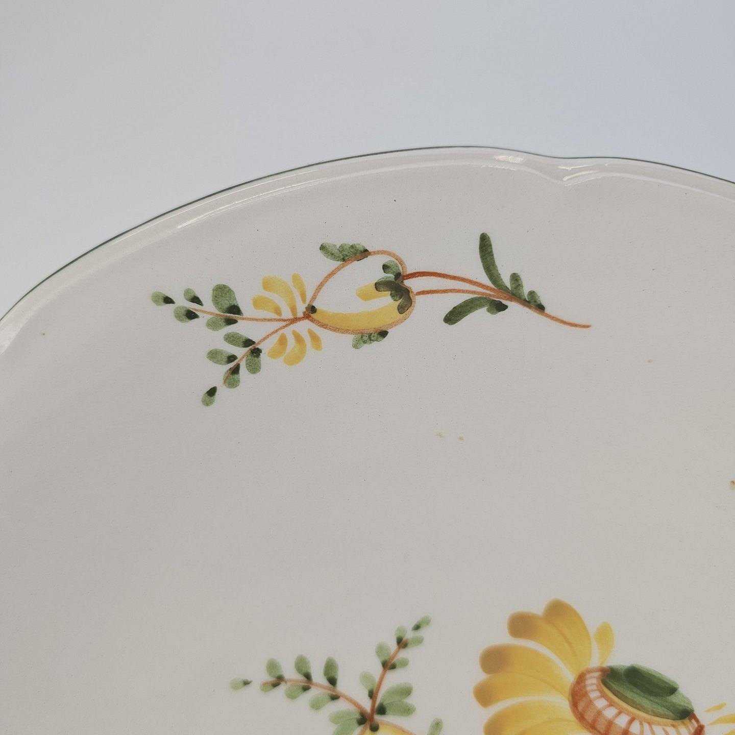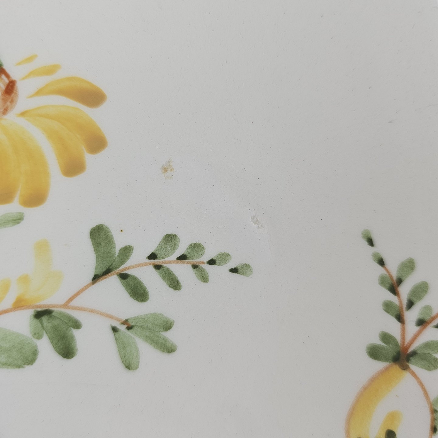 Hvidt fajancestel i stelform Feston/Alma med motiv af gule blomster og grønne blade.