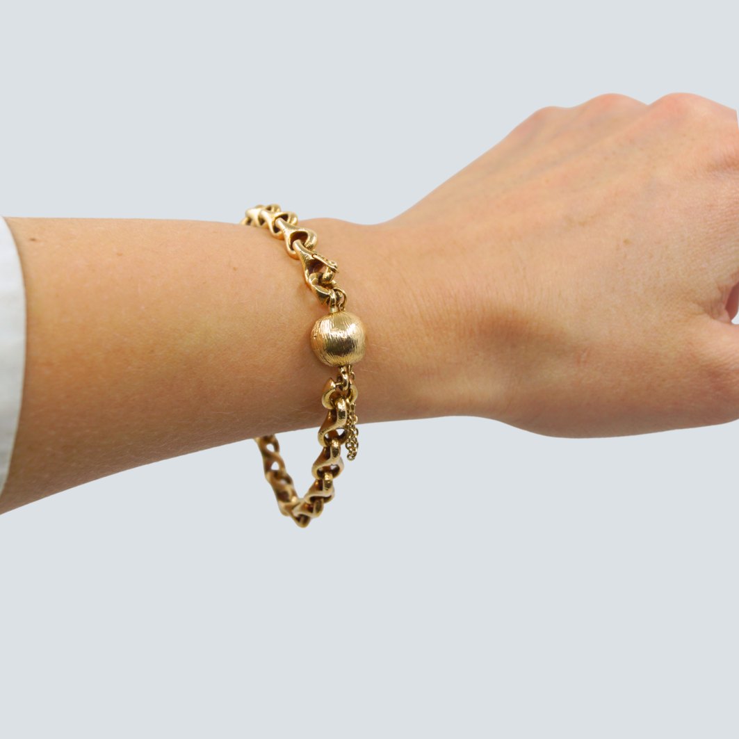 Ole Lynggaard guld smykke.Ole Lynggaard 8-tals armbånd af 14 kt. guld. Inklusiv kuglelås i 14 kt. guld. Armbåndet er med sikkerhedskæde.