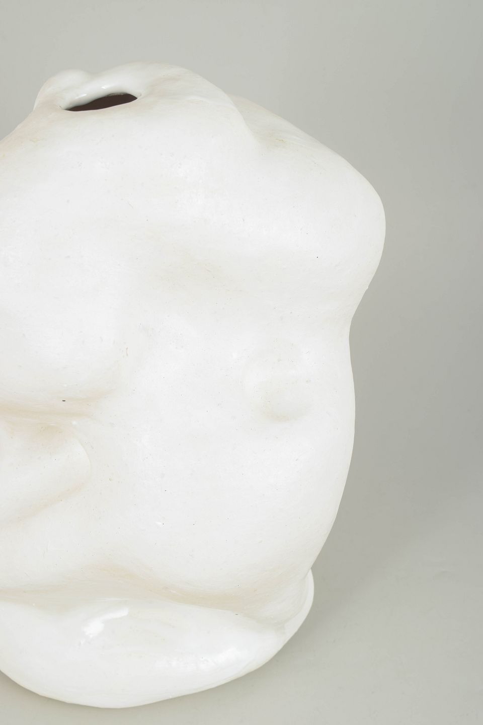 Unika stentøjsvase, organisk formet. Værket er dækket af et tyndt lag mat hvid porcelæn og pletvist penselglaseret med hvid, blank glasur.
