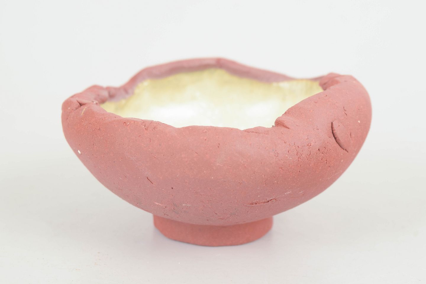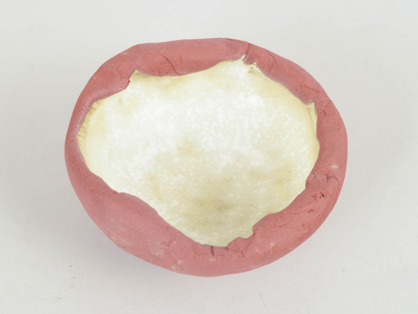 Christina Muff, dansk samtidskeramiker (f. 1971).Lille bitte unika skål i rødt stentøjsler på fod. Uglaseret på ydersiden fremstår den med det røde, varme ler som en kontrast til den cremehvide krystalglasur der optræder indvendigt.