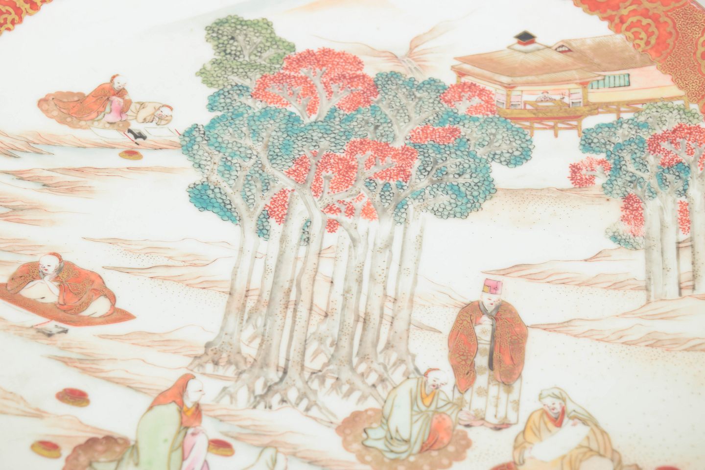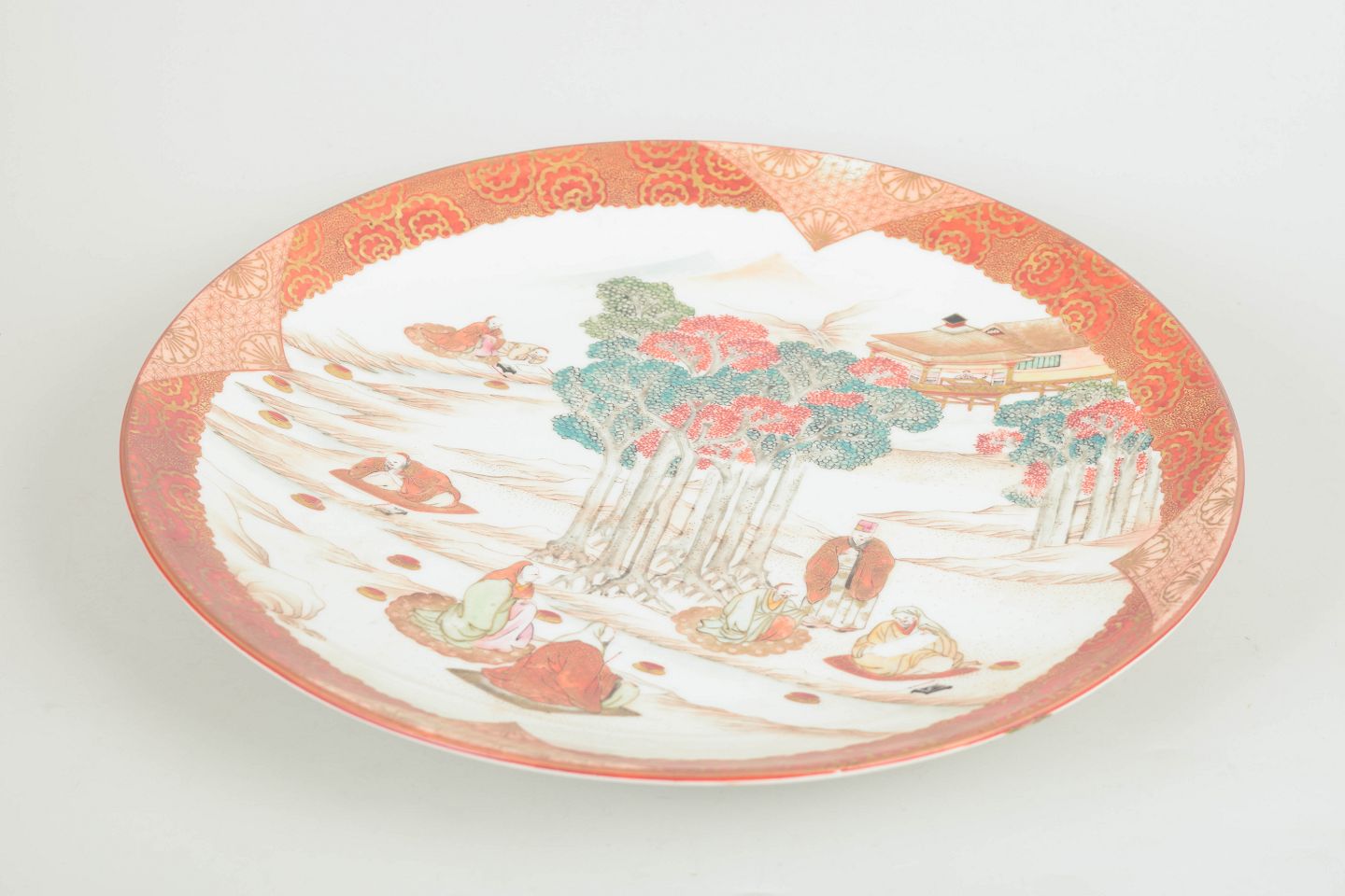 Kutani porcelænsfad i aka-e stil, stort fad.Stort rundt fad i porcelæn med håndmalet dekoration i rød, grøn og gylden farveholdning med figur- og landskabsmotiv. Signeret på undersiden.