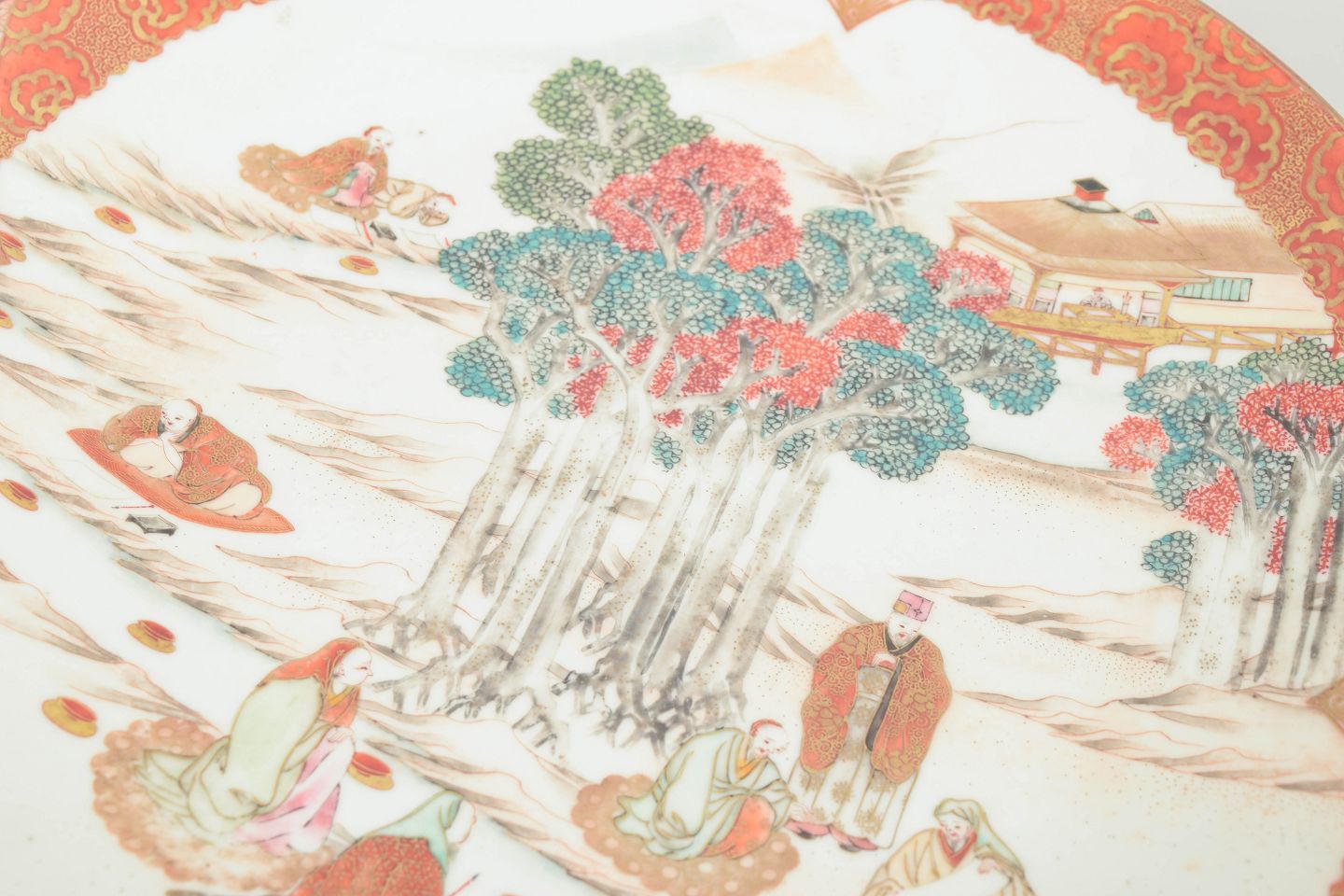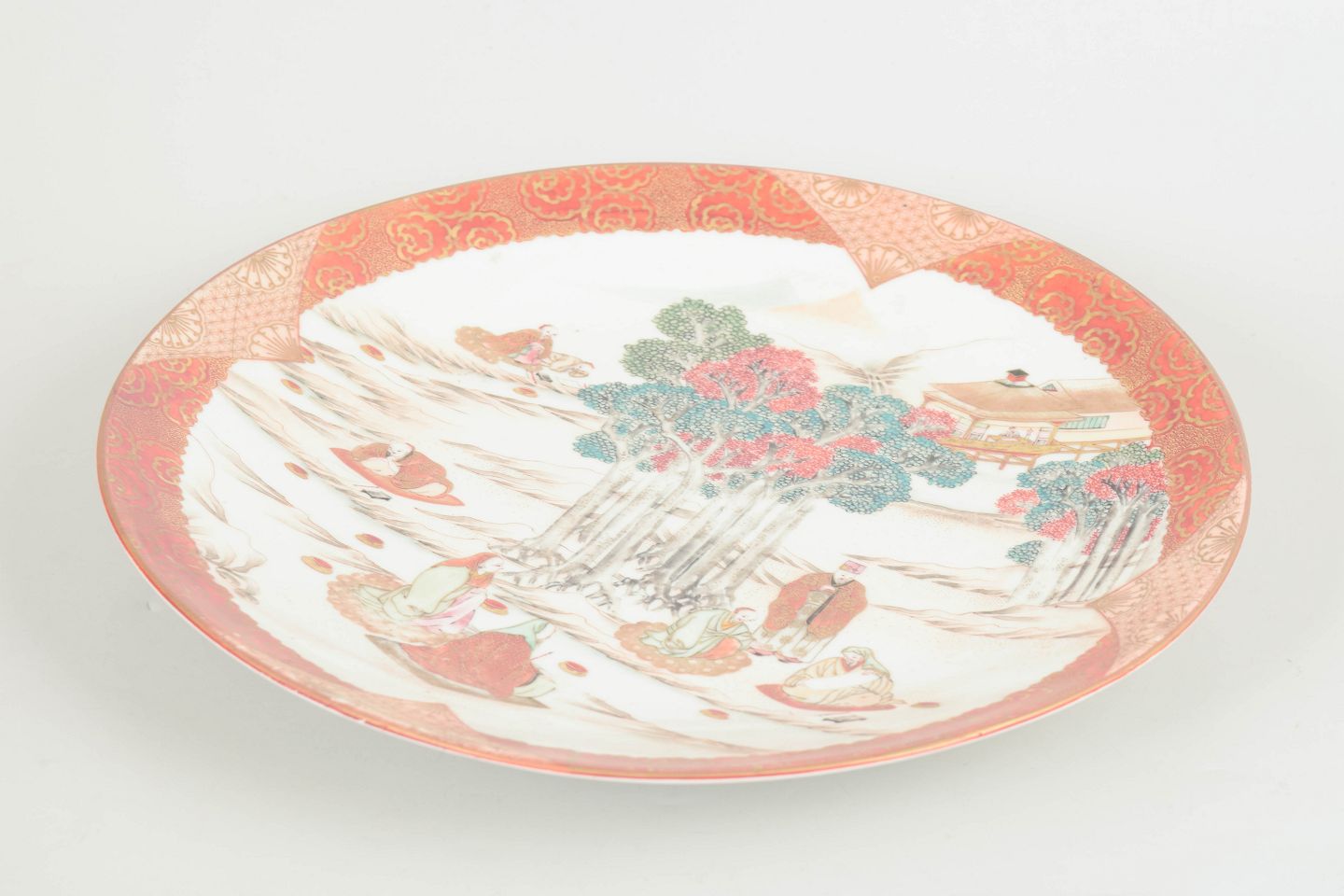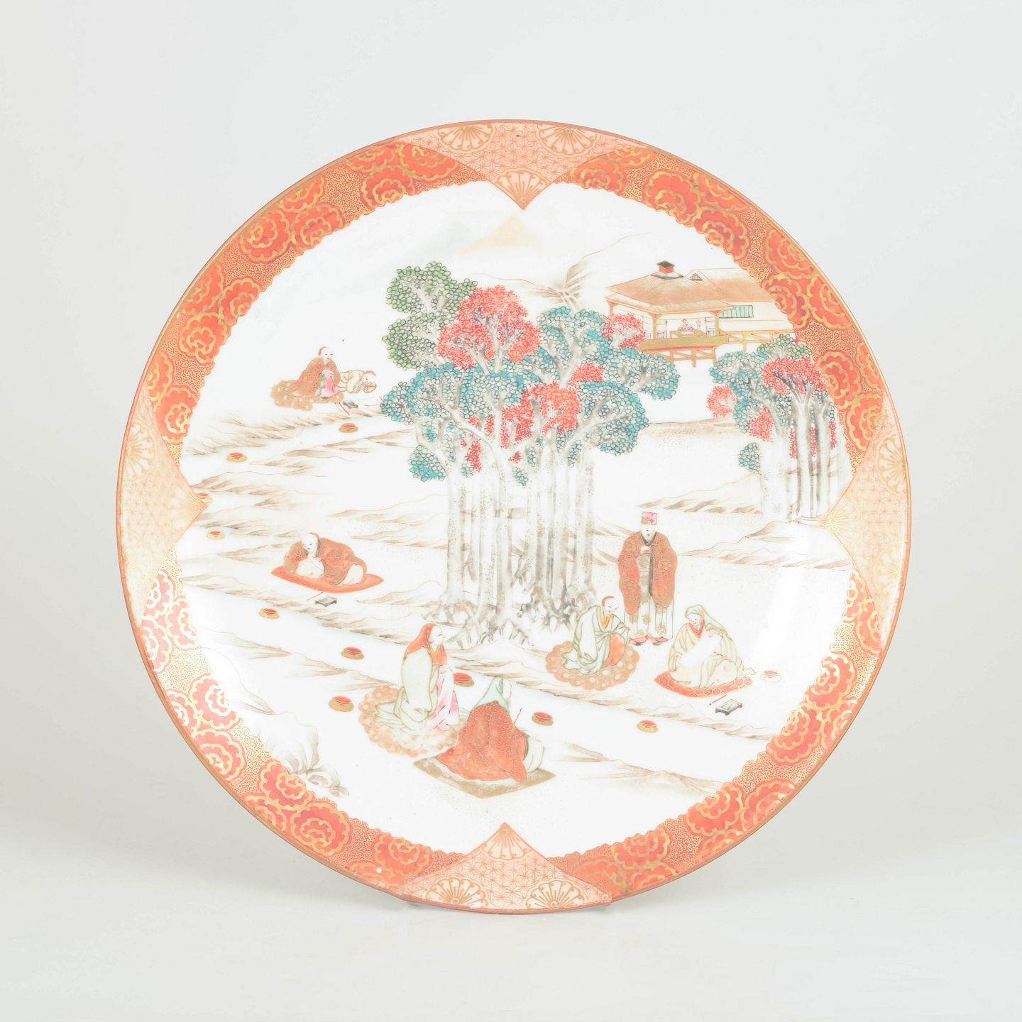 Kutani porcelænsfad i aka-e stil, stort fad.Stort rundt fad i porcelæn med håndmalet dekoration i rød, grøn og gylden farveholdning med figur- og landskabsmotiv. Klassisk japansk aka-e stil med detaljeret ornamentik og scenisk fremstilling.