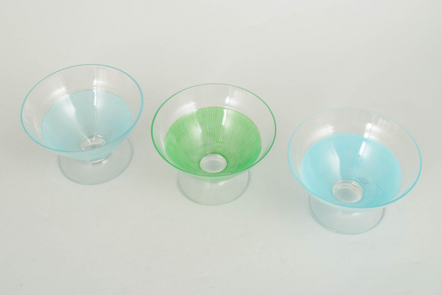 Kosta Boda, sæt af tre cocktailglas/dessertskåle.Elegante glas i klart glas med fine indfarvede ribbede strukturer i blå og grønne nuancer. Lette og dekorative former fra 1960’erne, velegnede som både cocktailglas og dessertskåle.