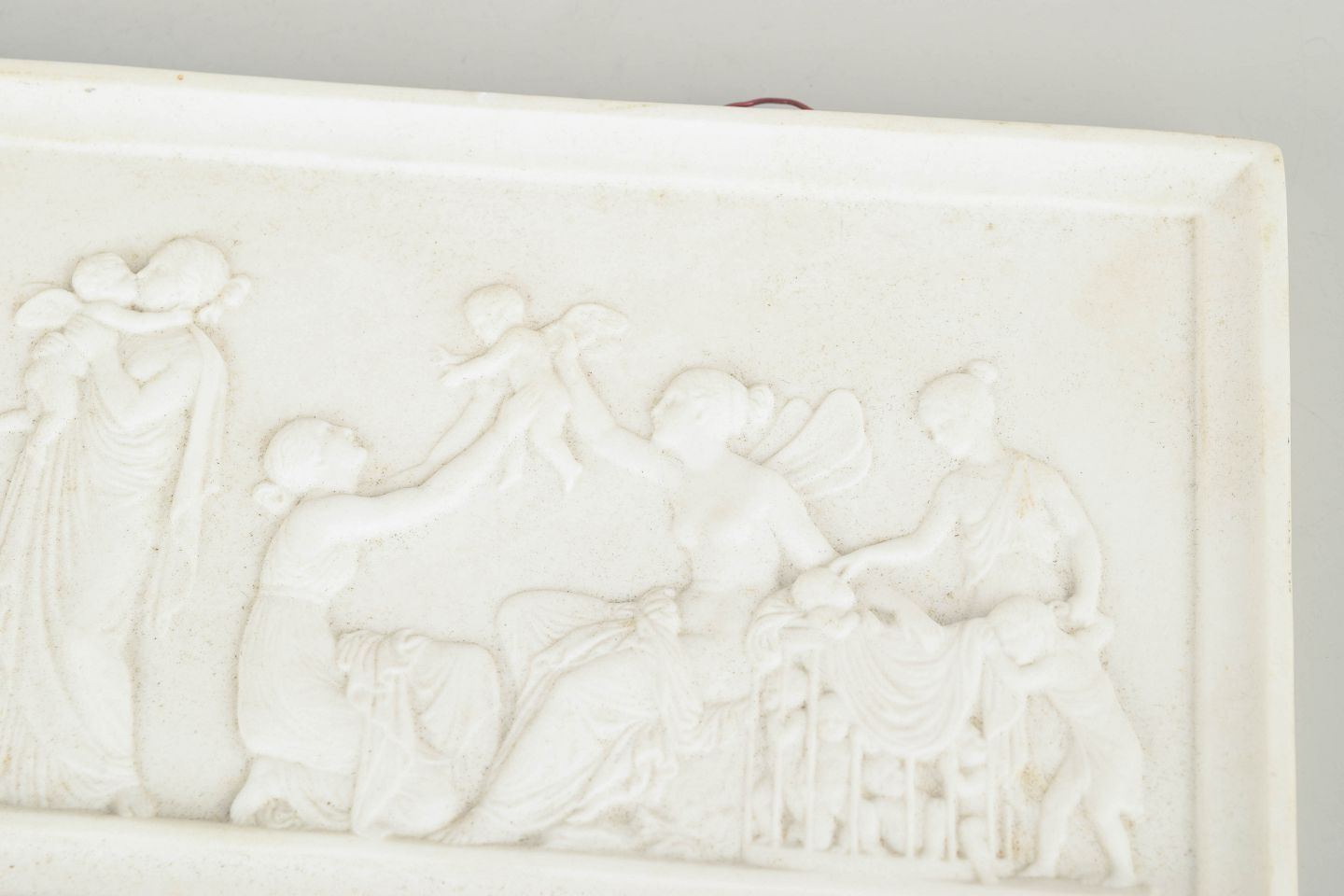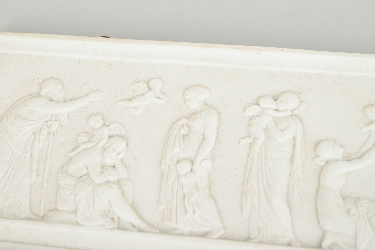 Royal Copenhagen bisquit relief efter Thorvaldsen, vægrelief.Rektangulært vægrelief i hvidt bisquitporcelæn med klassicistisk figurfrise efter Bertel Thorvaldsen, udført med fine detaljer og harmonisk komposition inspireret af antikkens formsprog.