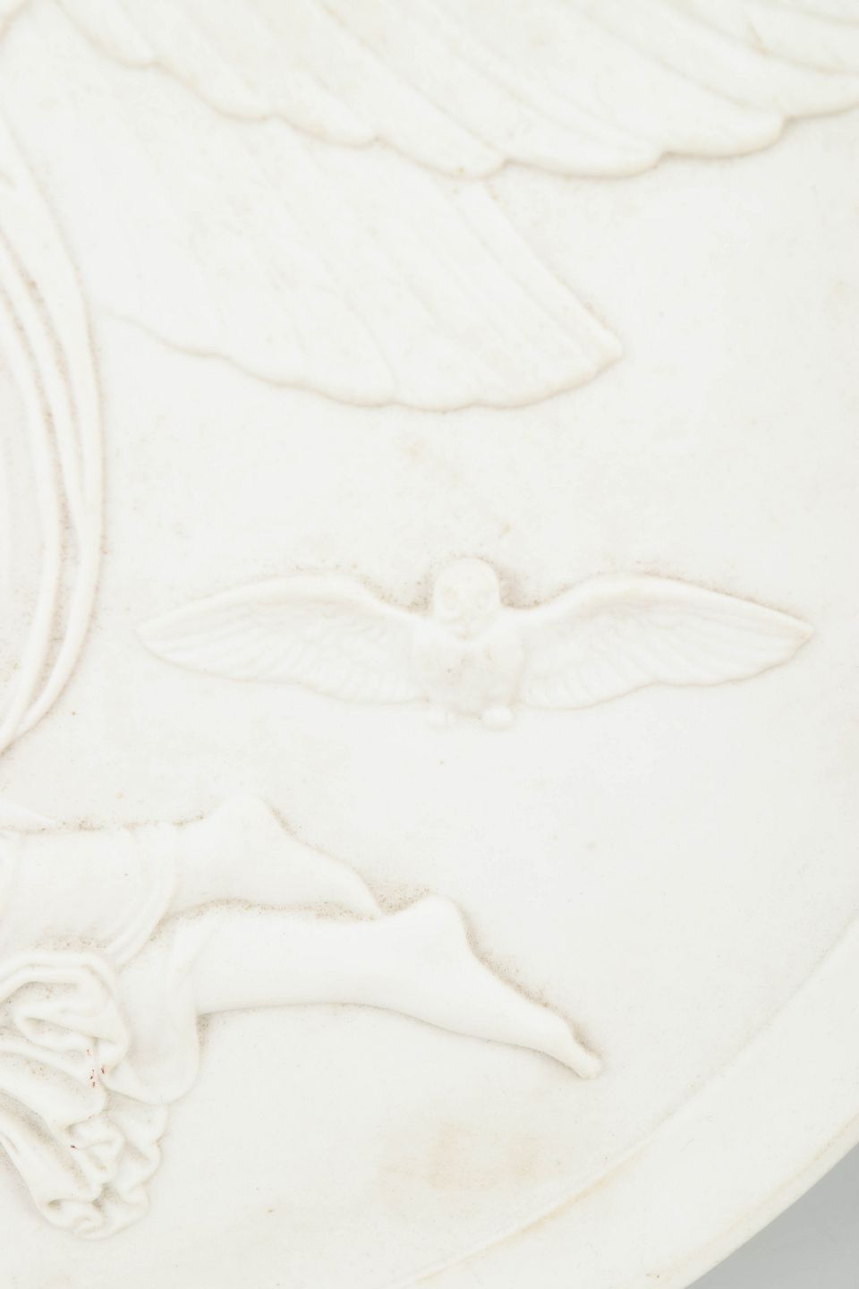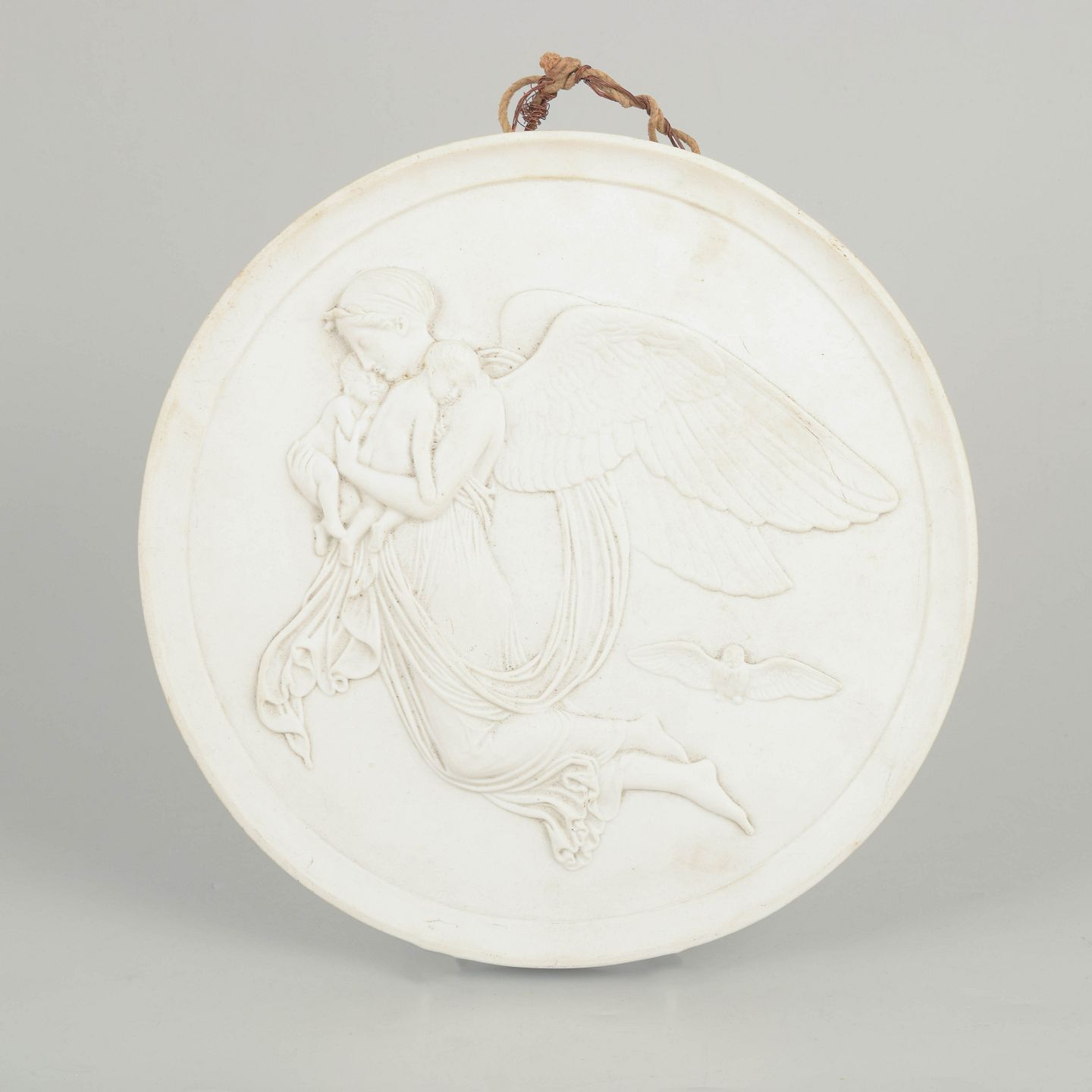 Royal Copenhagen bisquit relief efter Thorvaldsen, vægplakette.Rund vægplakette i hvidt bisquitporcelæn med relief af engelmotiv efter Bertel Thorvaldsen, udført med fine klassicistiske detaljer og blød modellering.
