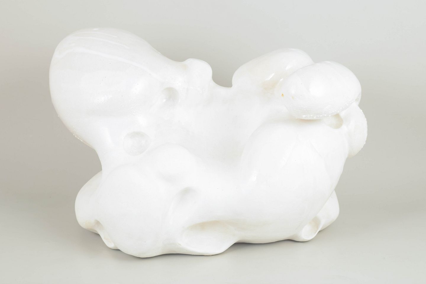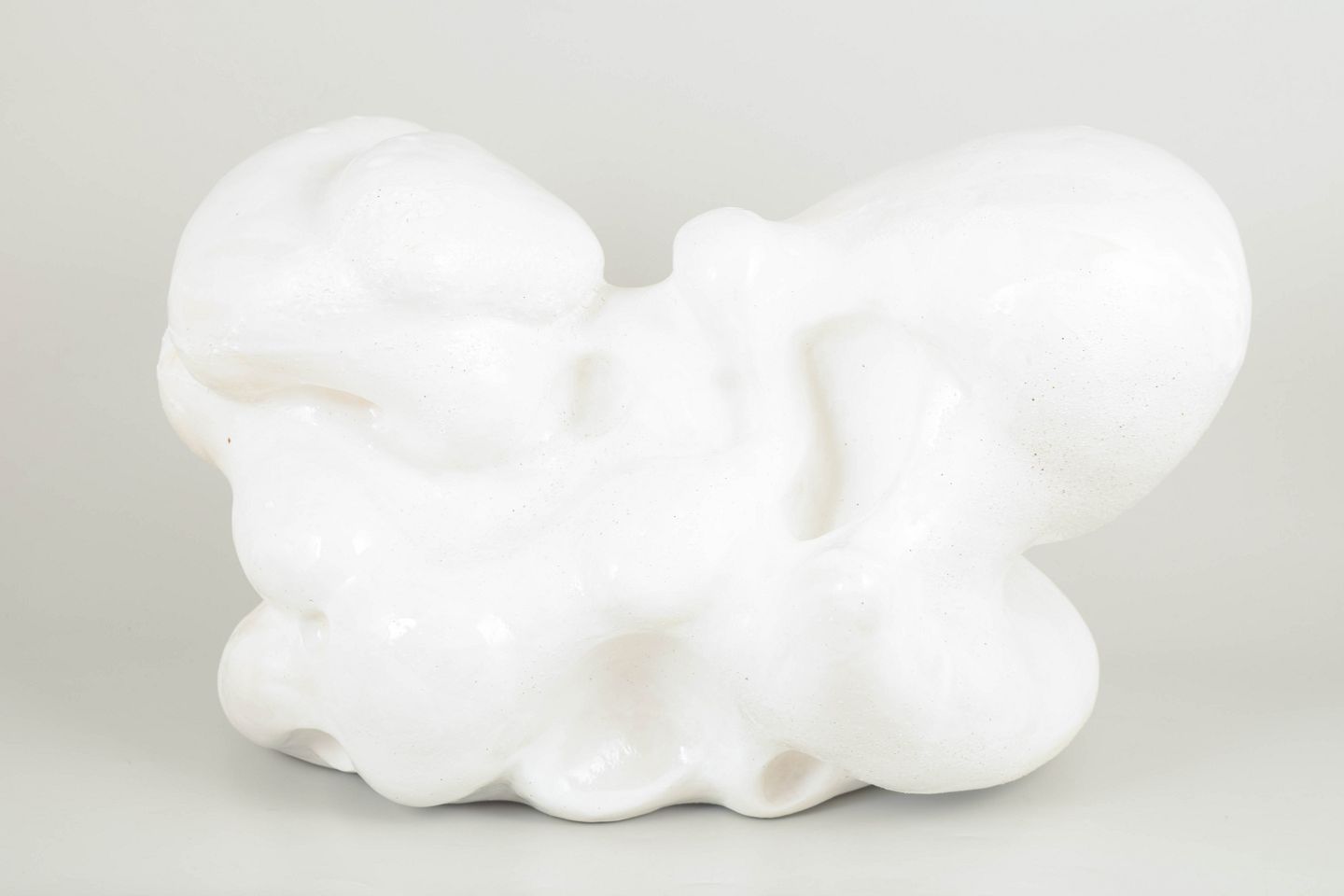 Unika stentøjsskulptur, organisk formet. Værket er dækket af et tyndt lag mat hvid porcelæn og pletvist penselglaseret med hvid, blank glasur, matte hvide glasurer og hvide glasurer med specielle effekter.