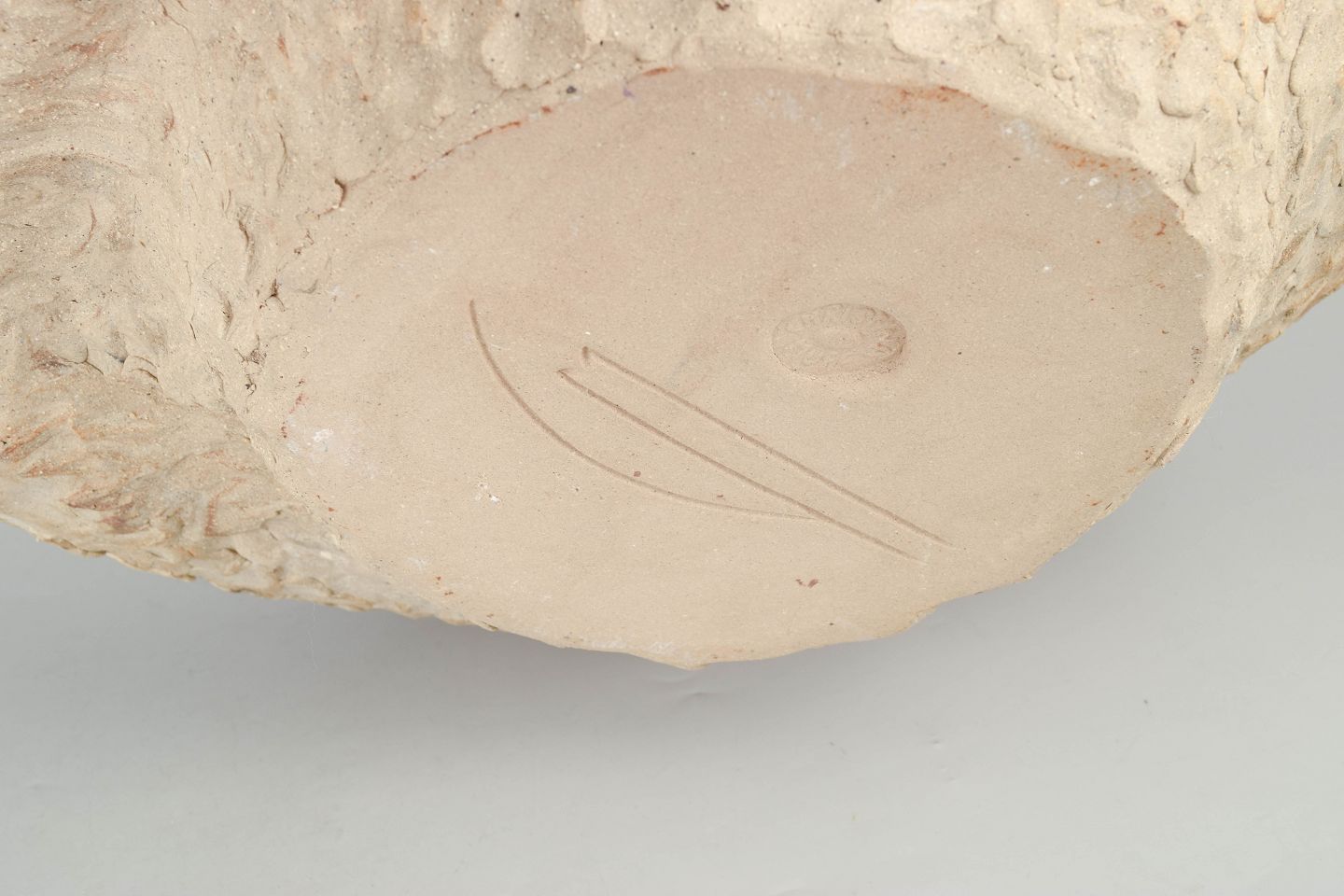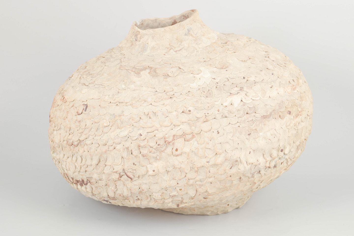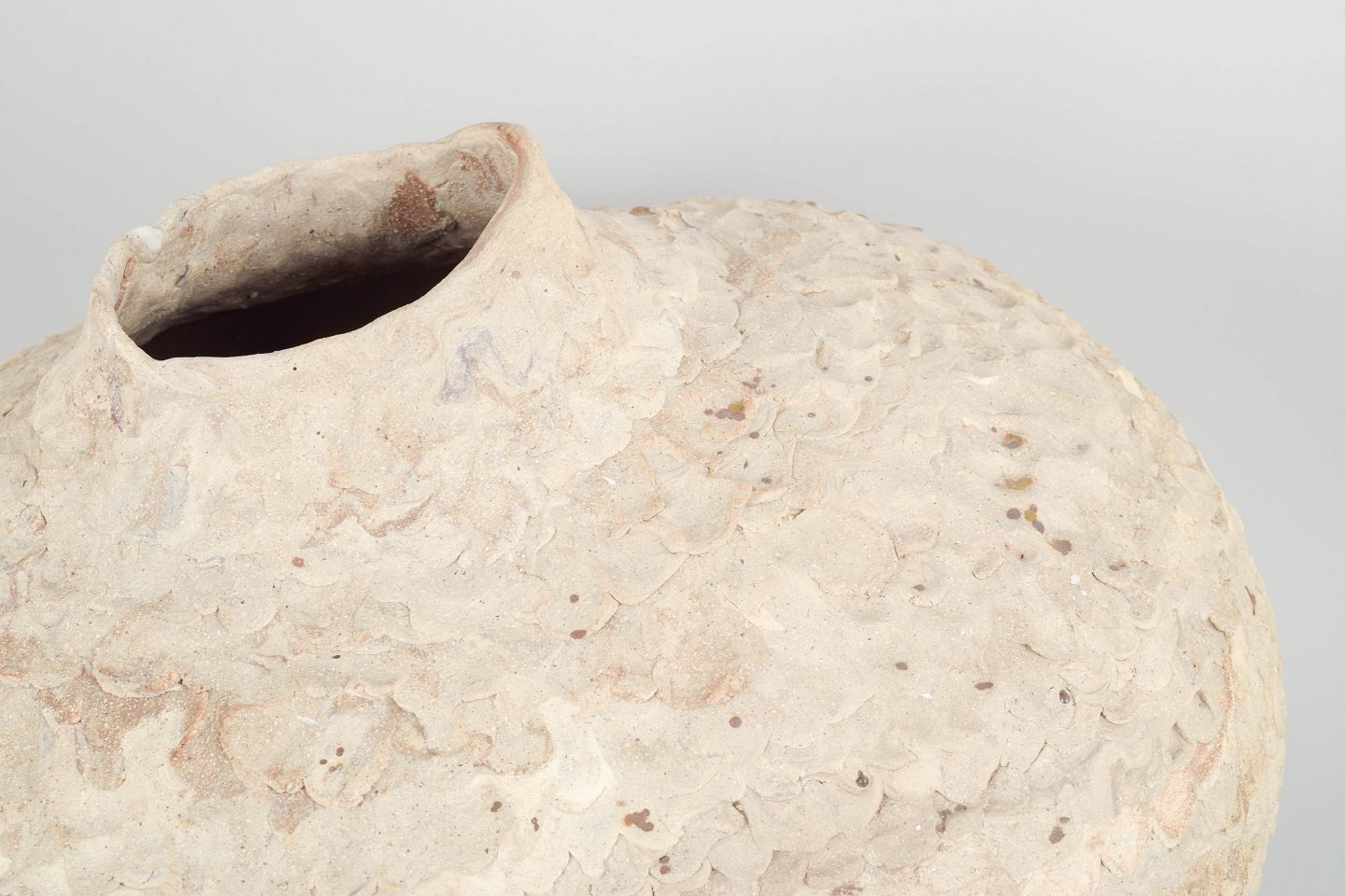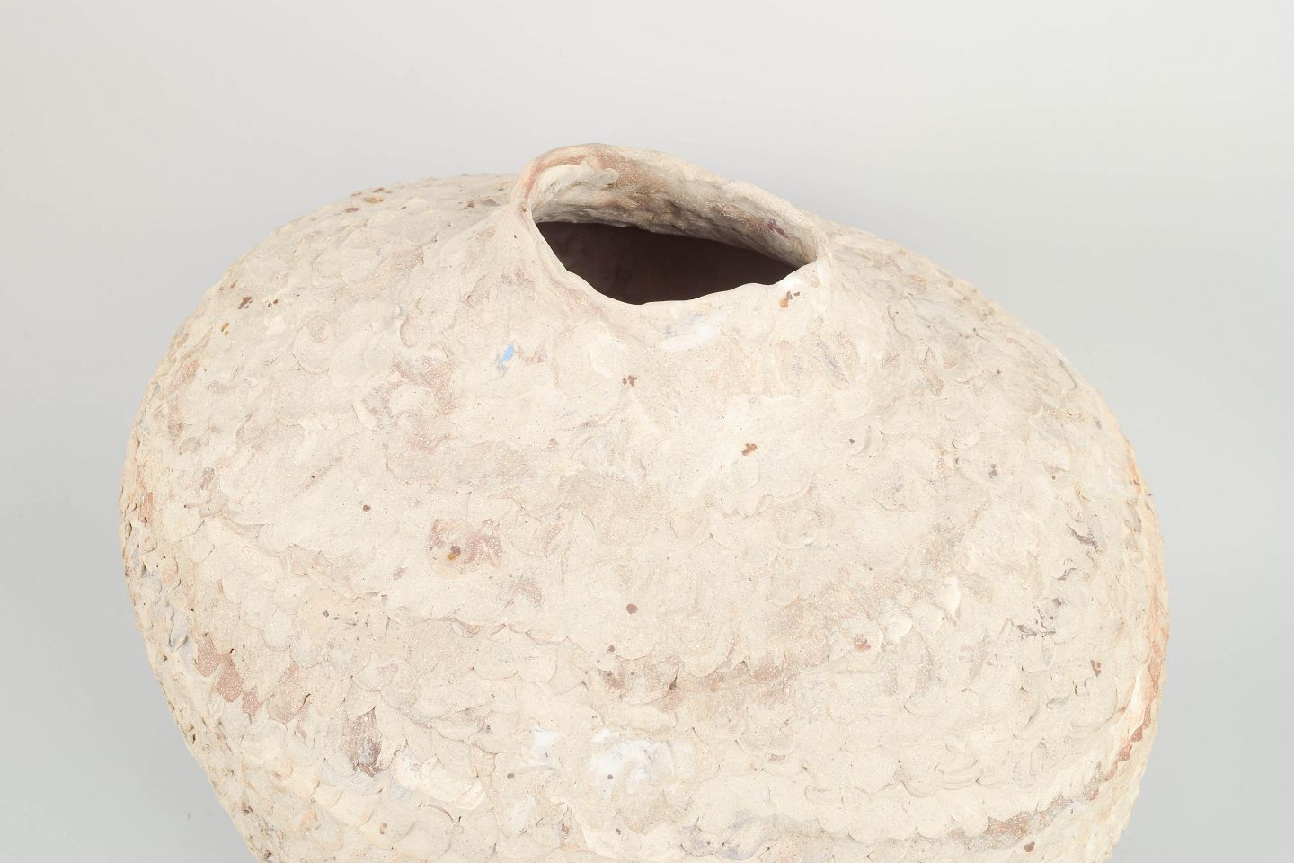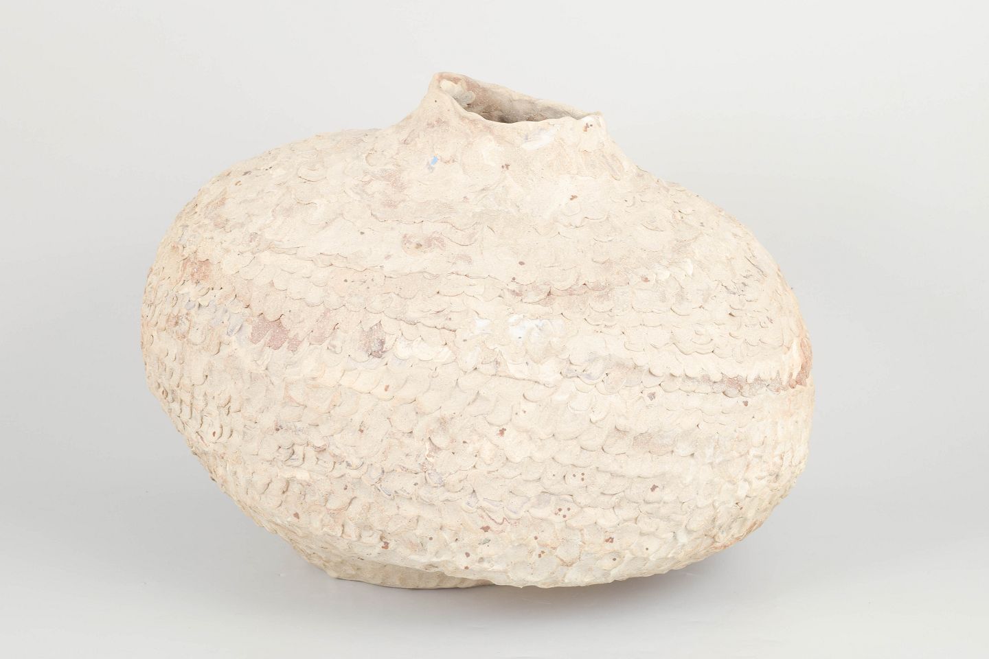 Christina Muff, dansk samtidskeramiker (f. 1971).Stor unika rund stentøjsvase. Værket er uglaseret i kunstnerens signaturstil med blandede lertyper. Leret er genbrugsler, der er sammensat med tusindvis af kunstnerens tryk med fingrene, dette giver værket et taktilt, organisk og blødt udtryk. Kan ikke holde væske.