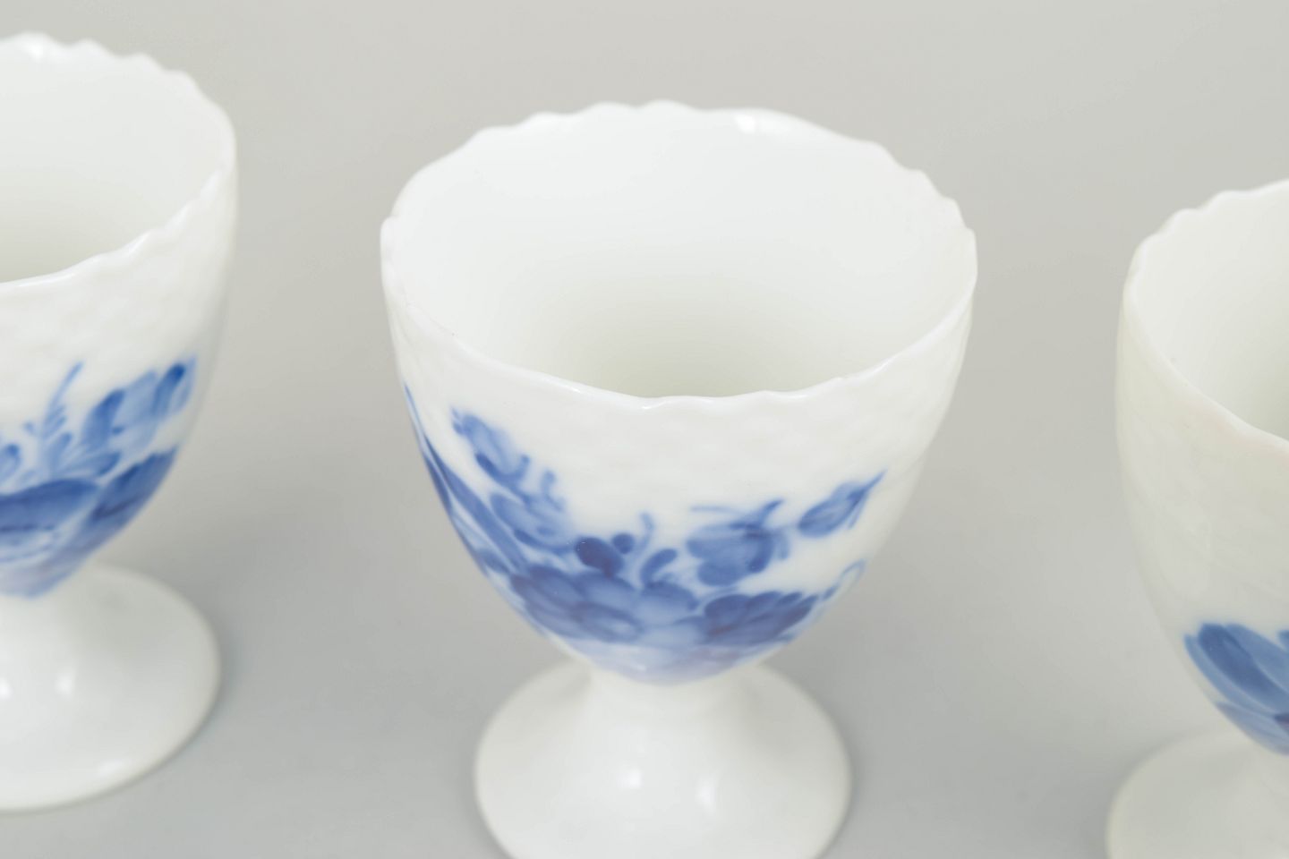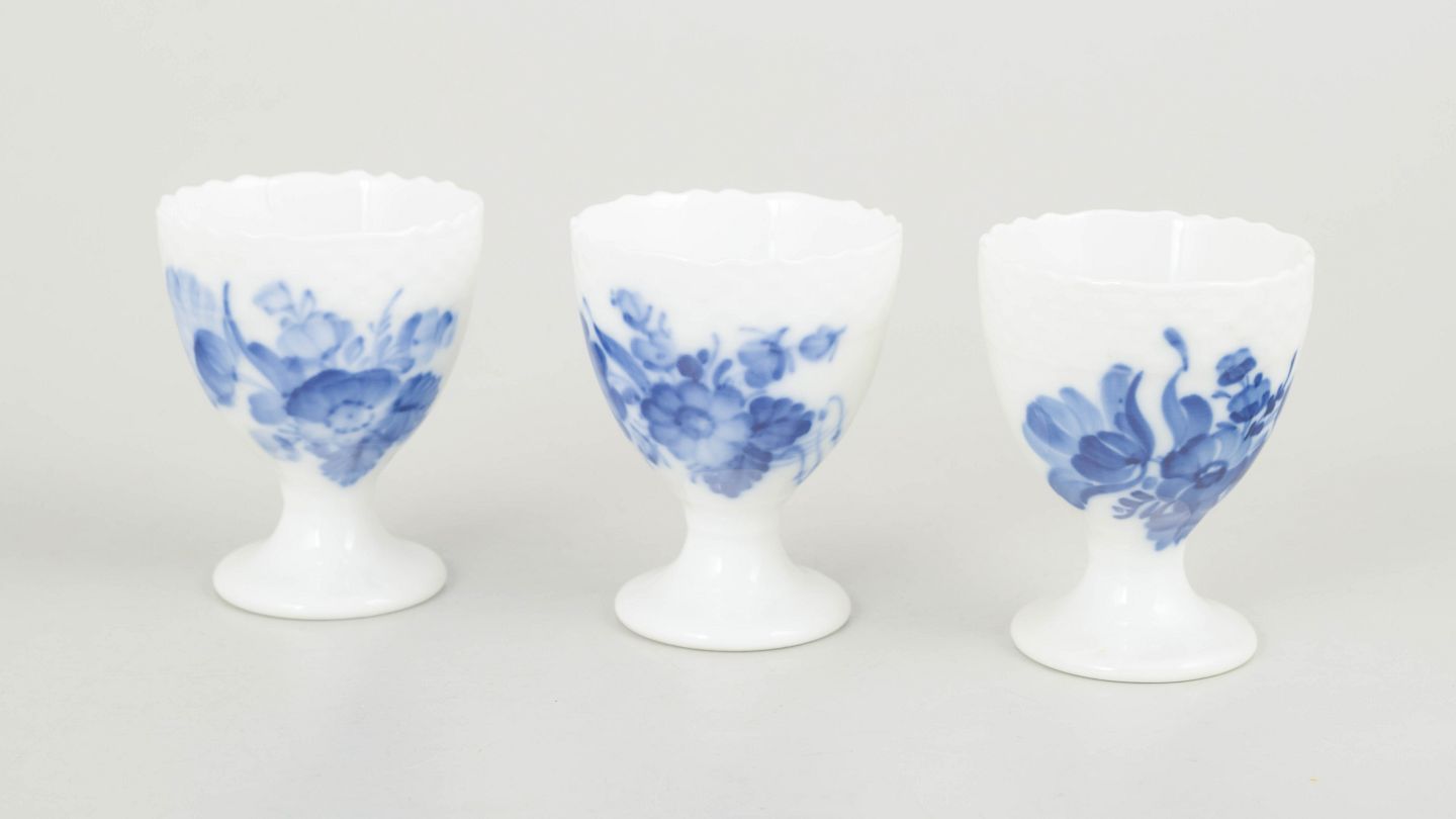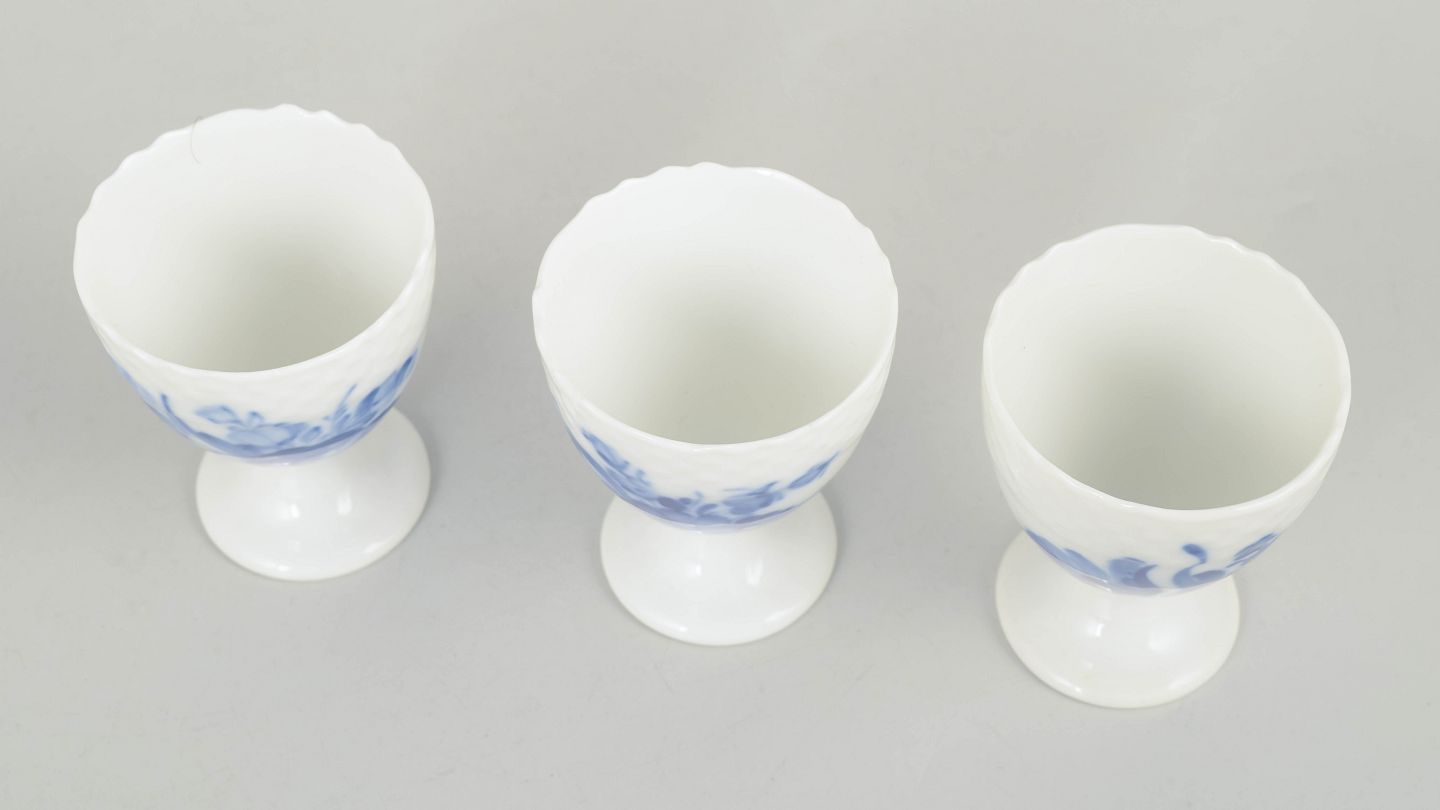 Royal Copenhagen, Blå Blomst Svejset sæt af tre æggebægre.Sæt bestående af tre æggebægre i porcelæn med håndmalet blå blomsterdekoration i relief. Modelnummer 10/1568, 1. sortering, fra tidligt 1900-tal.