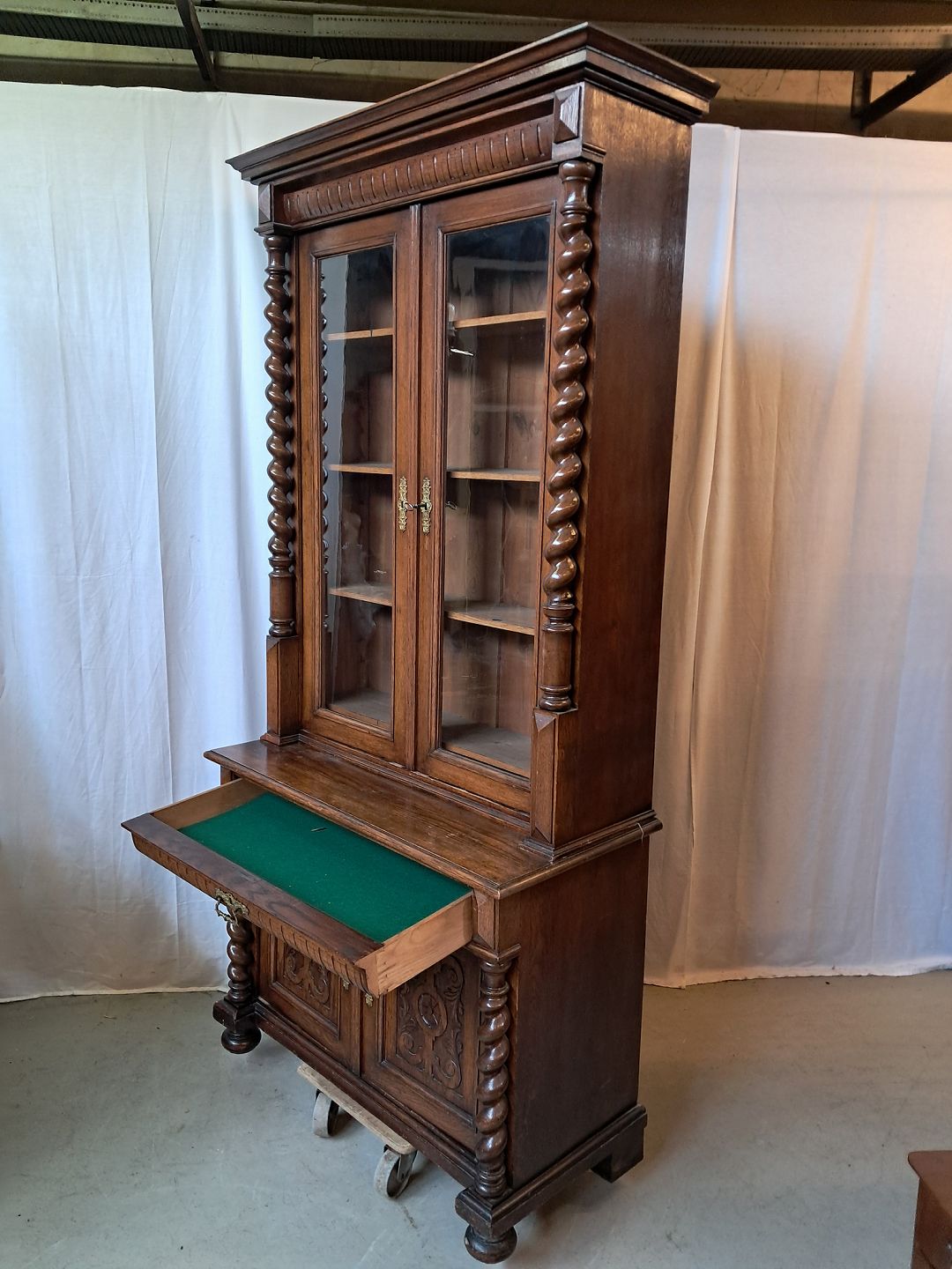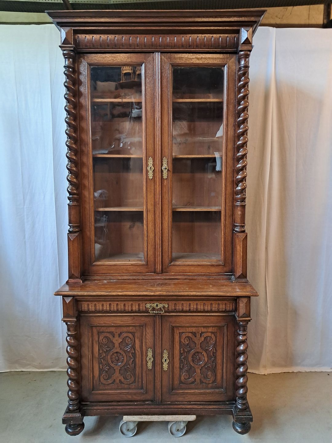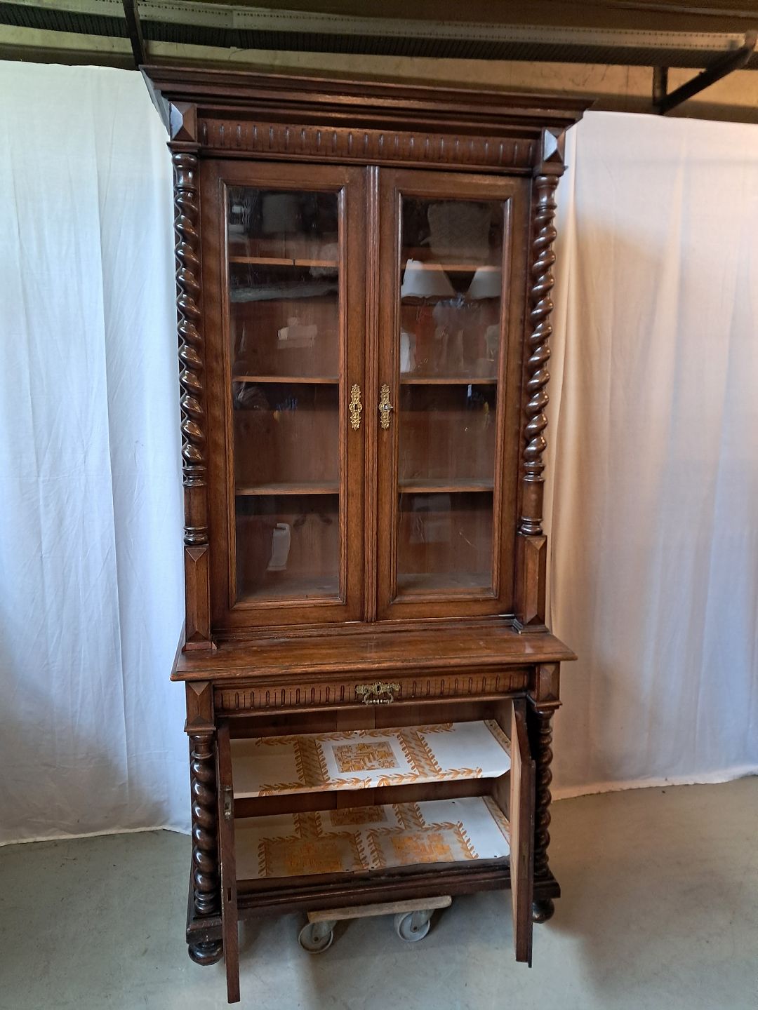 Skab med vitrineoverdel i massivt og fineret egetræ, fra 1900erne.De har brugsspor og mangler et par lister. (se foto)