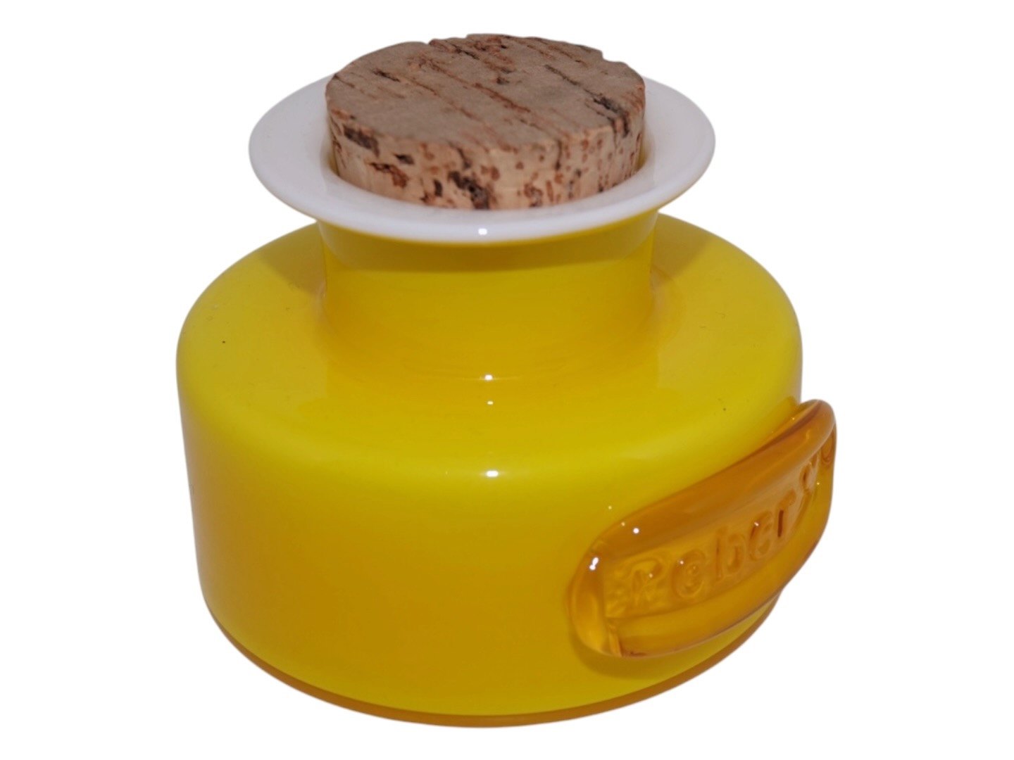 Holmegaard Palet gul krydderikrukke med teksten "Peber".Designet af Michael Bang i 1970.
