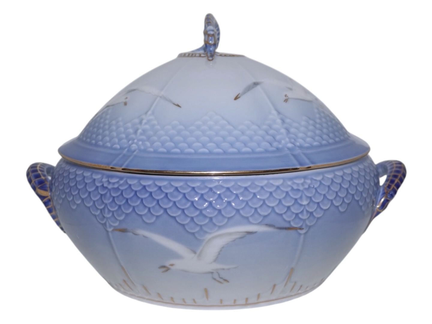 Bing & Grøndahl Måge med guldkant, skål med låg (lille terrin).Af fabriksmærket kan det udledes, at denne er produceret mellem 1958 og 1962.
