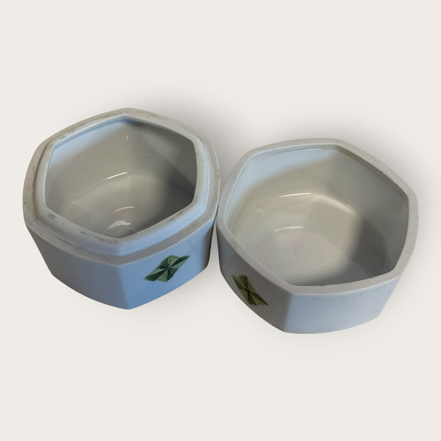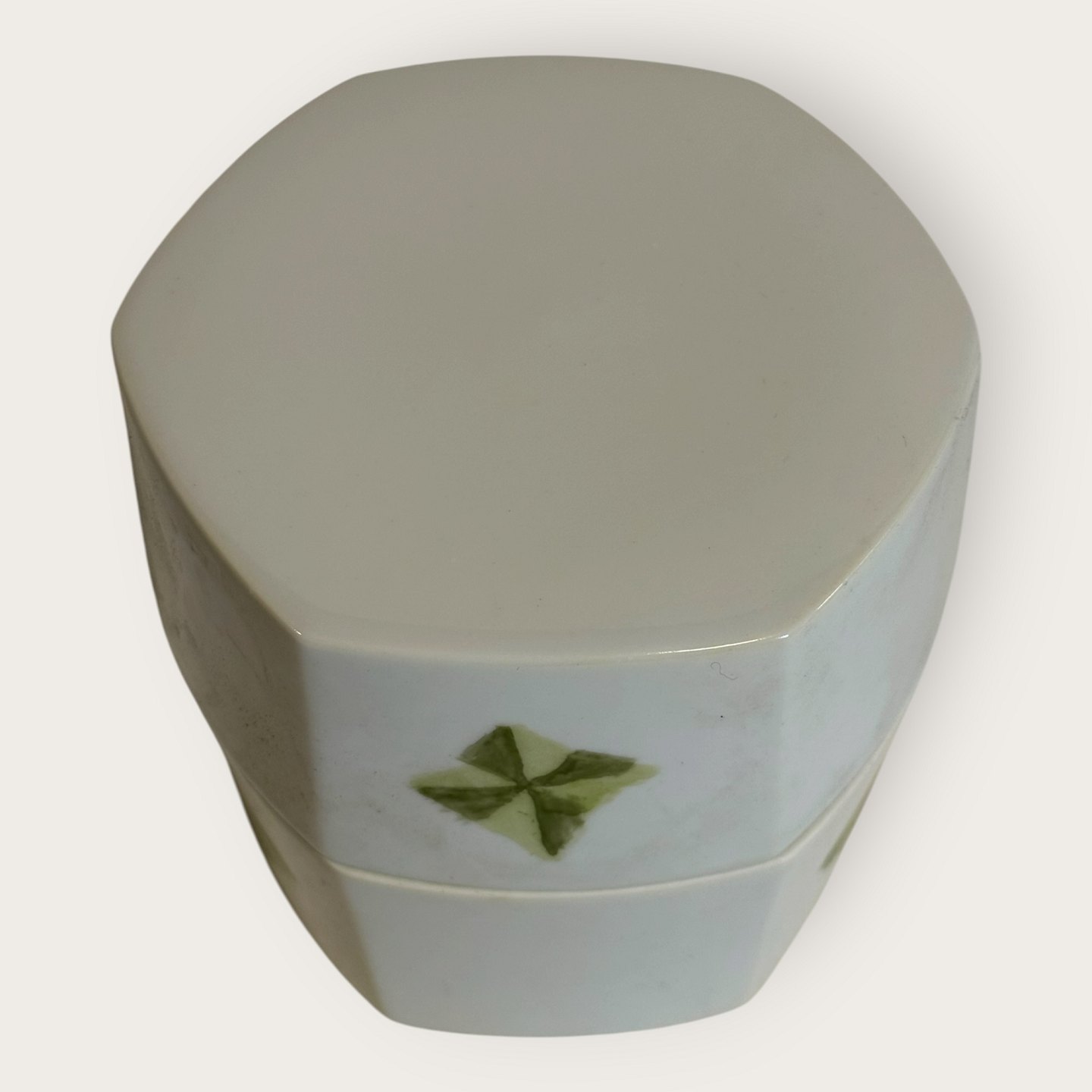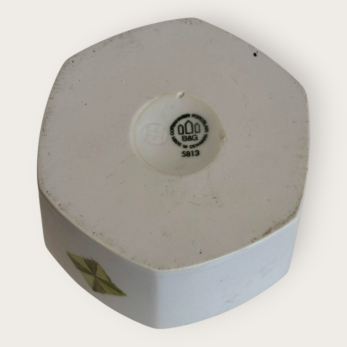 Bing & Grøndahl, Lågkrukke med grøn dekoration, # 5813, ca. 11x11cm, *Nogle meget små skrammer på kanten (se foto) ellers fin stand*Lager: 1