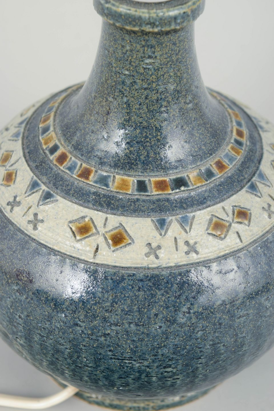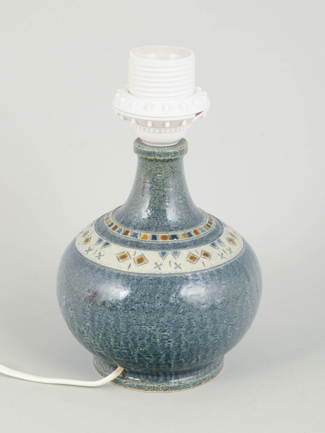 Yngve Blixt for Höganäs, bordlampe.Dekorativ bordlampe i stentøj med karakteristisk reliefmønster og grøn glasur, monteret med lys fatning. Kort ledning uden stik.