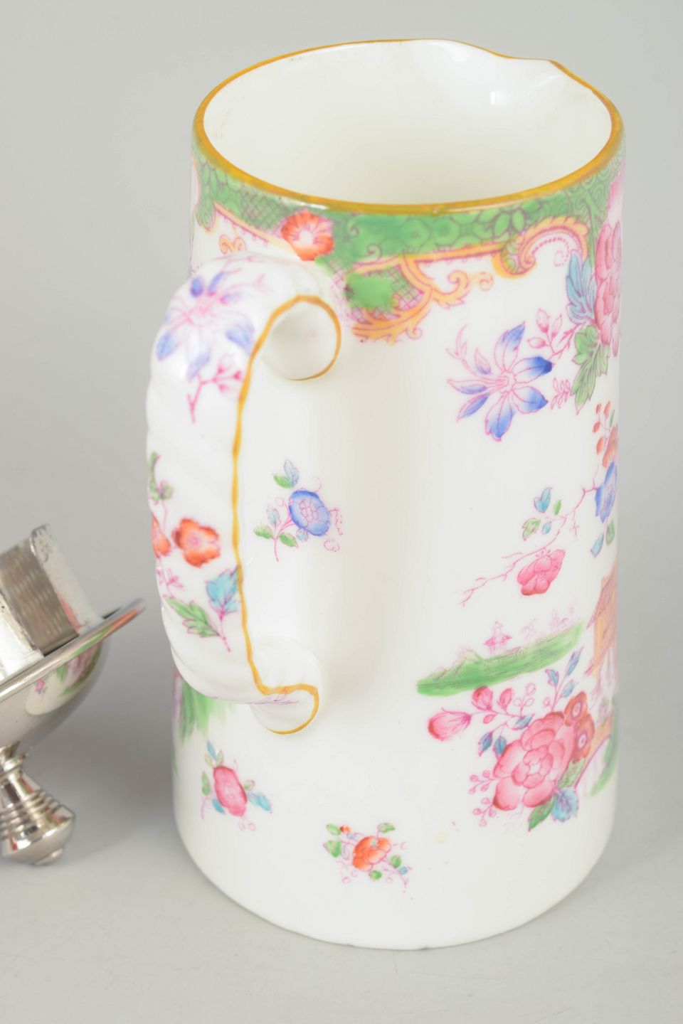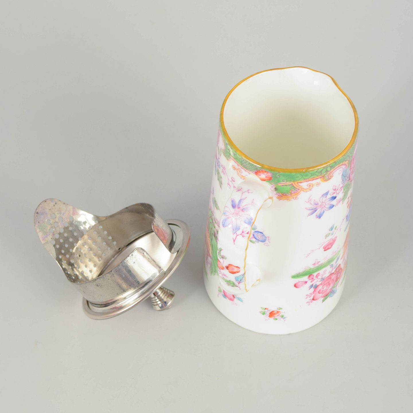 Dekorativ kande i porcelæn med farverig blomsterdekoration i Temple mønster, med låg i rustfrit stål og elegant buet hank.