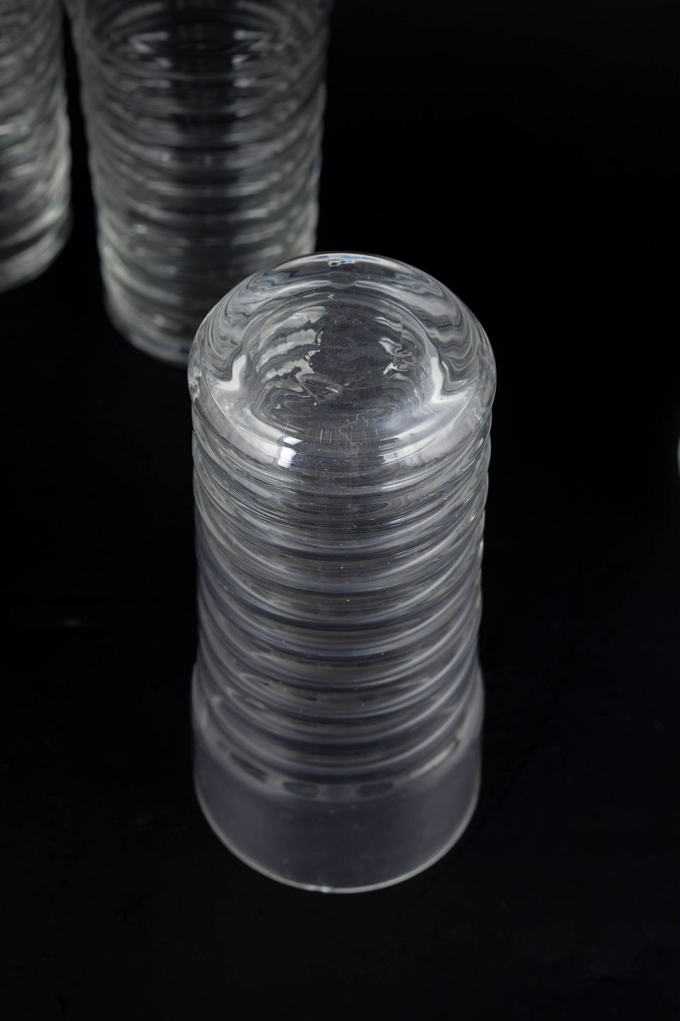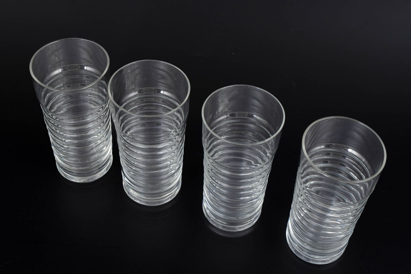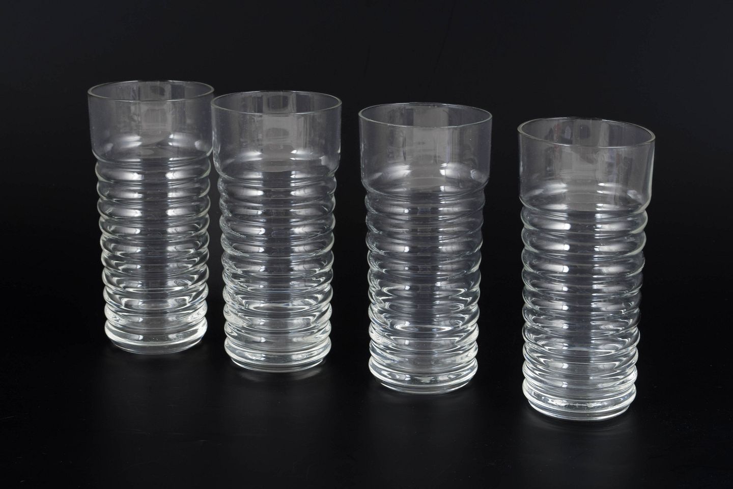 Nanny Still for Riihimäen Lasi, sæt af fire drikkeglas.Klar glas i Perpetum Mobile serien med karakteristisk rillet struktur og cylindrisk form.