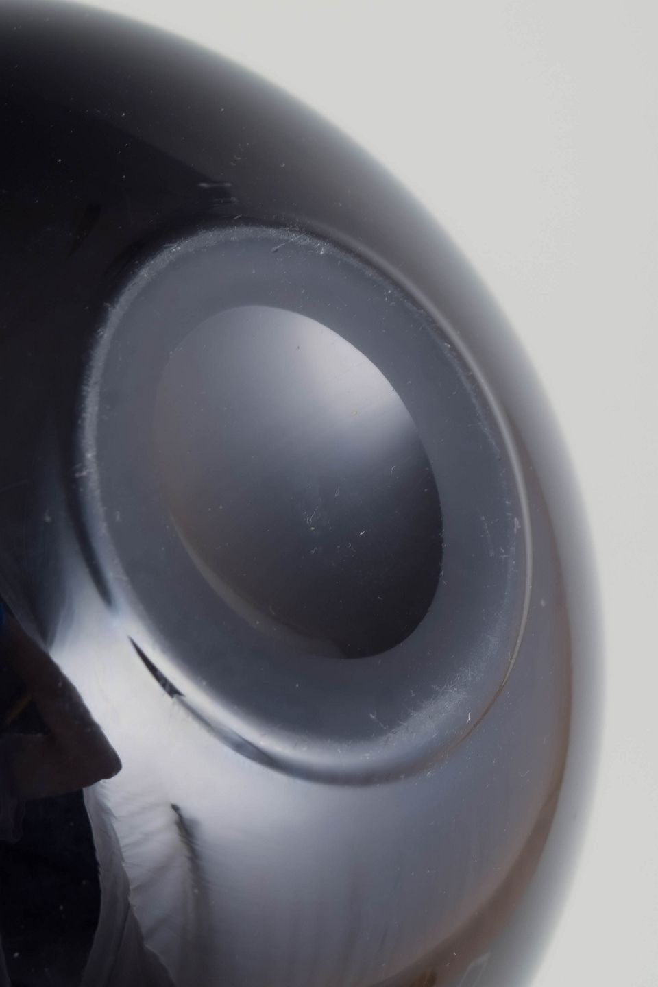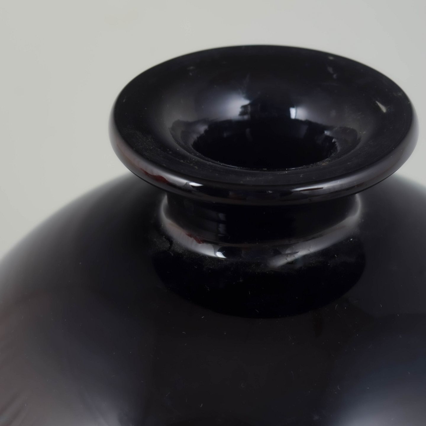 Elegant kugleformet vase med kort hals udført i mørktonet glas med højglans overflade, typisk for art deco perioden.