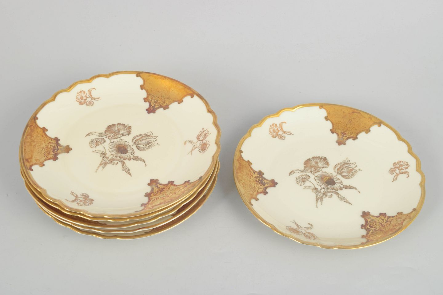 Rosenthal "Elfenbein" serie, sæt af seks tallerkener med gulddekor.Elegante porcelænstallerkener med reliefpræget elfenbensfarvet glasur og rigt forgyldt rand samt klassisk blomsterdekoration, produceret i Tyskland i mellemkrigstiden.