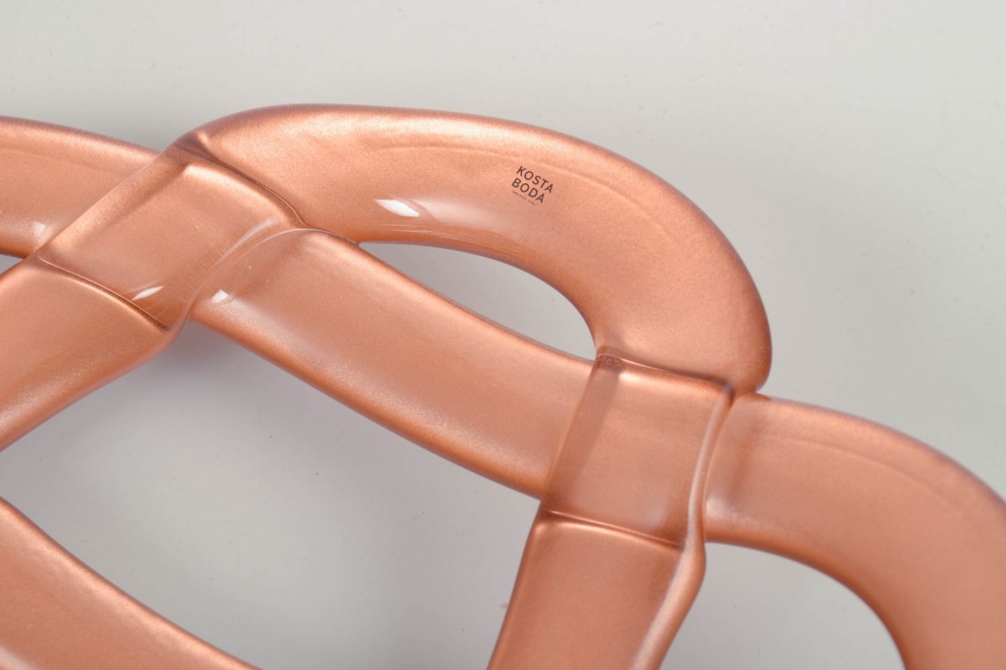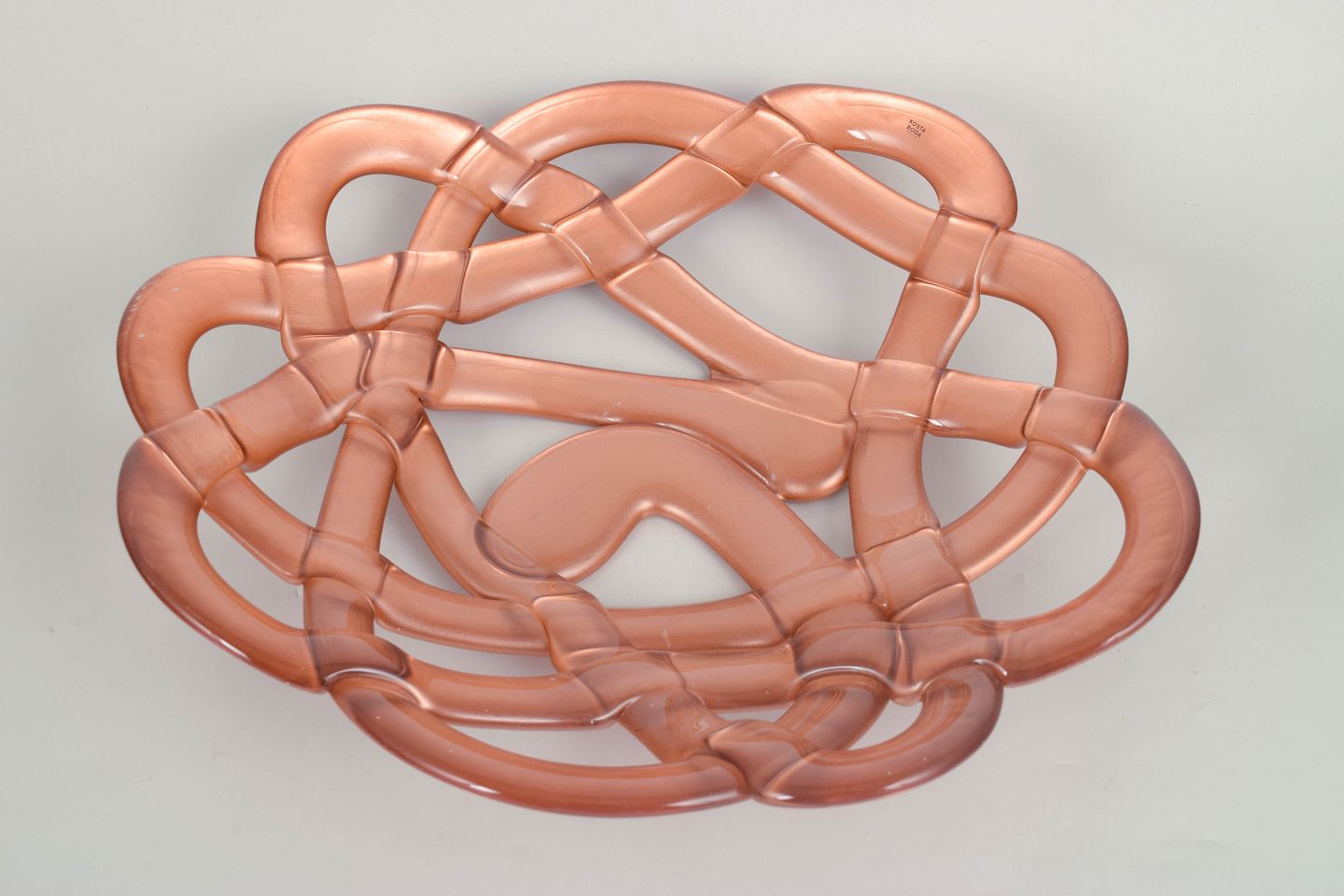 Anna Ehrner for Kosta Boda, skål i flettet form.Organisk formet skål i mundblæst glas med sammenflettet struktur i transparent rosa nuance, model “Basket”.