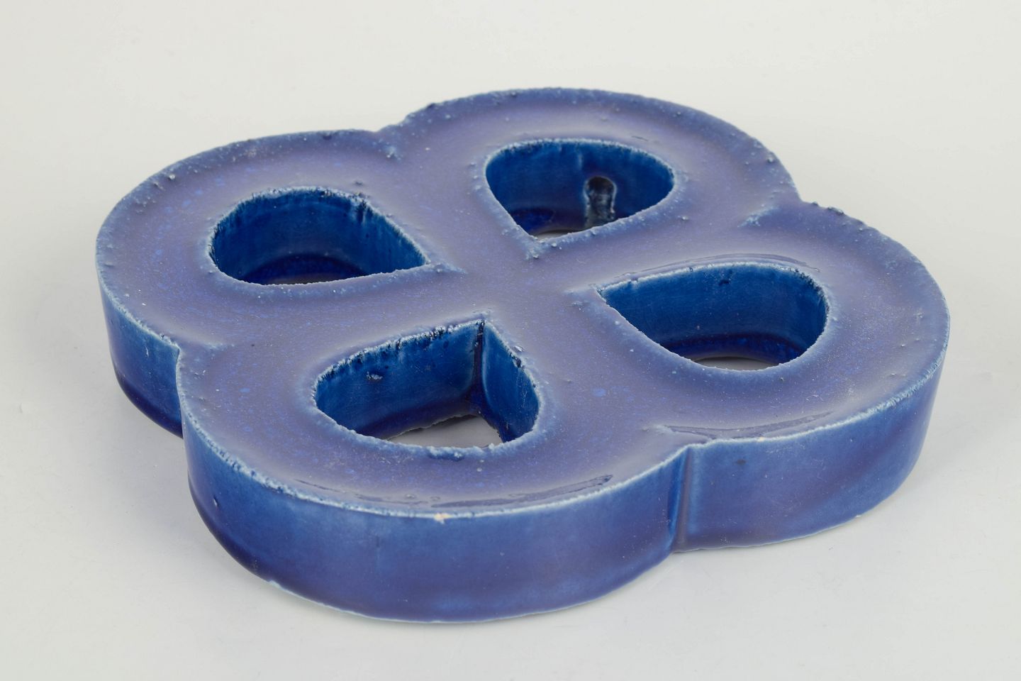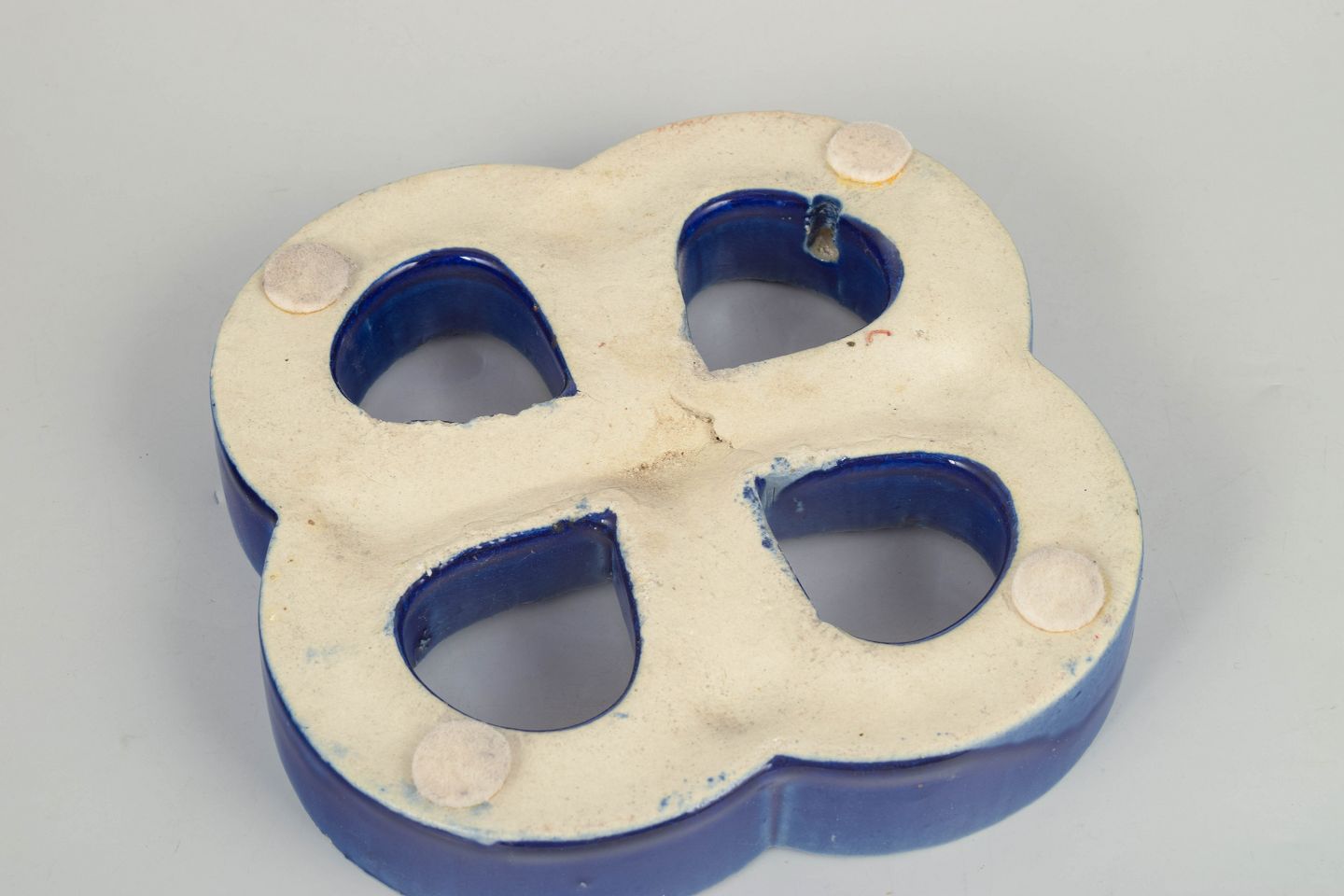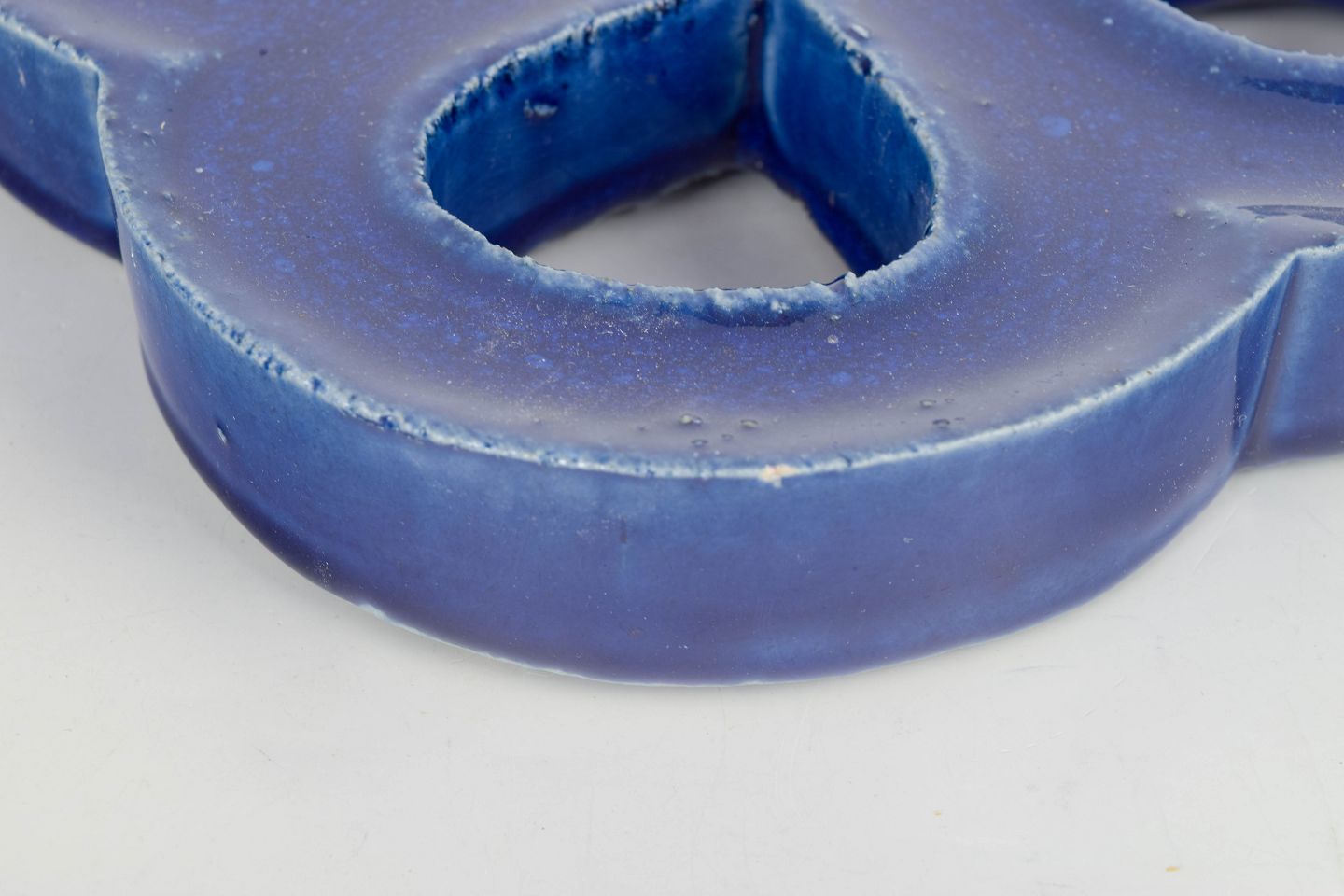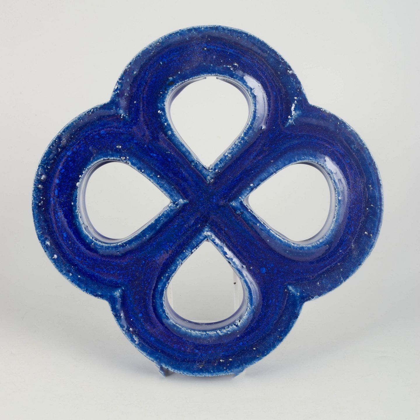 Gustavsberg vægrelief med ophæng.Dekorativt vægrelief i stentøj med organisk firkløverform og gennemgående åbninger. Udført med dyb blå, levende glasur med bobleeffekt og variation i overfladen. Bagside med hul til ophæng.