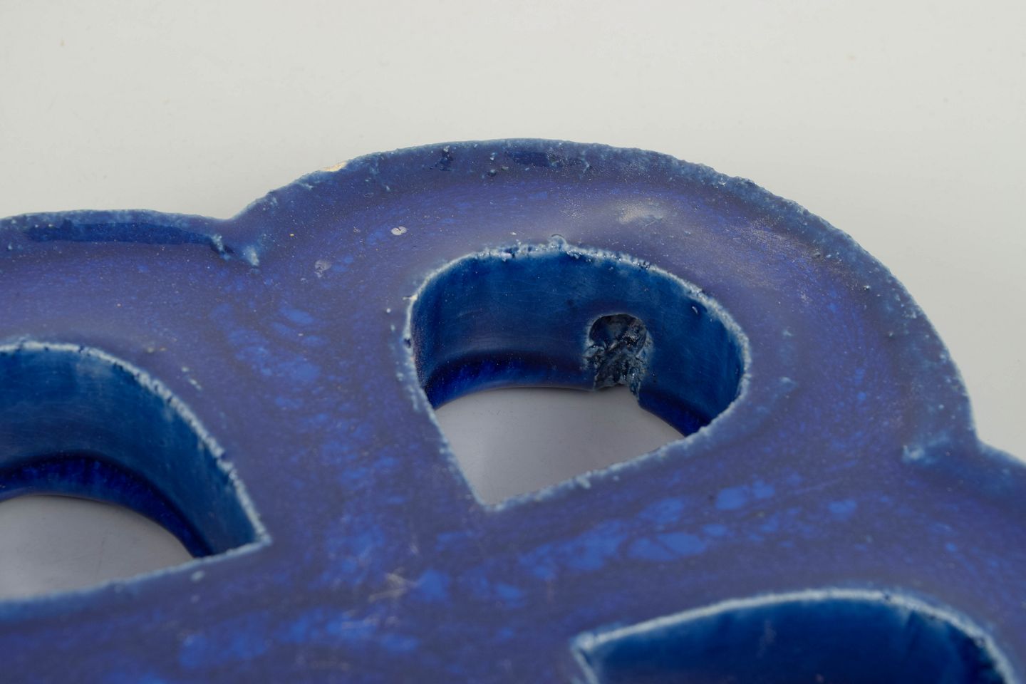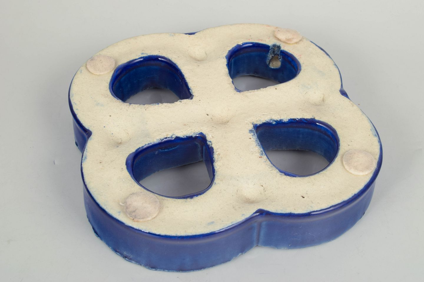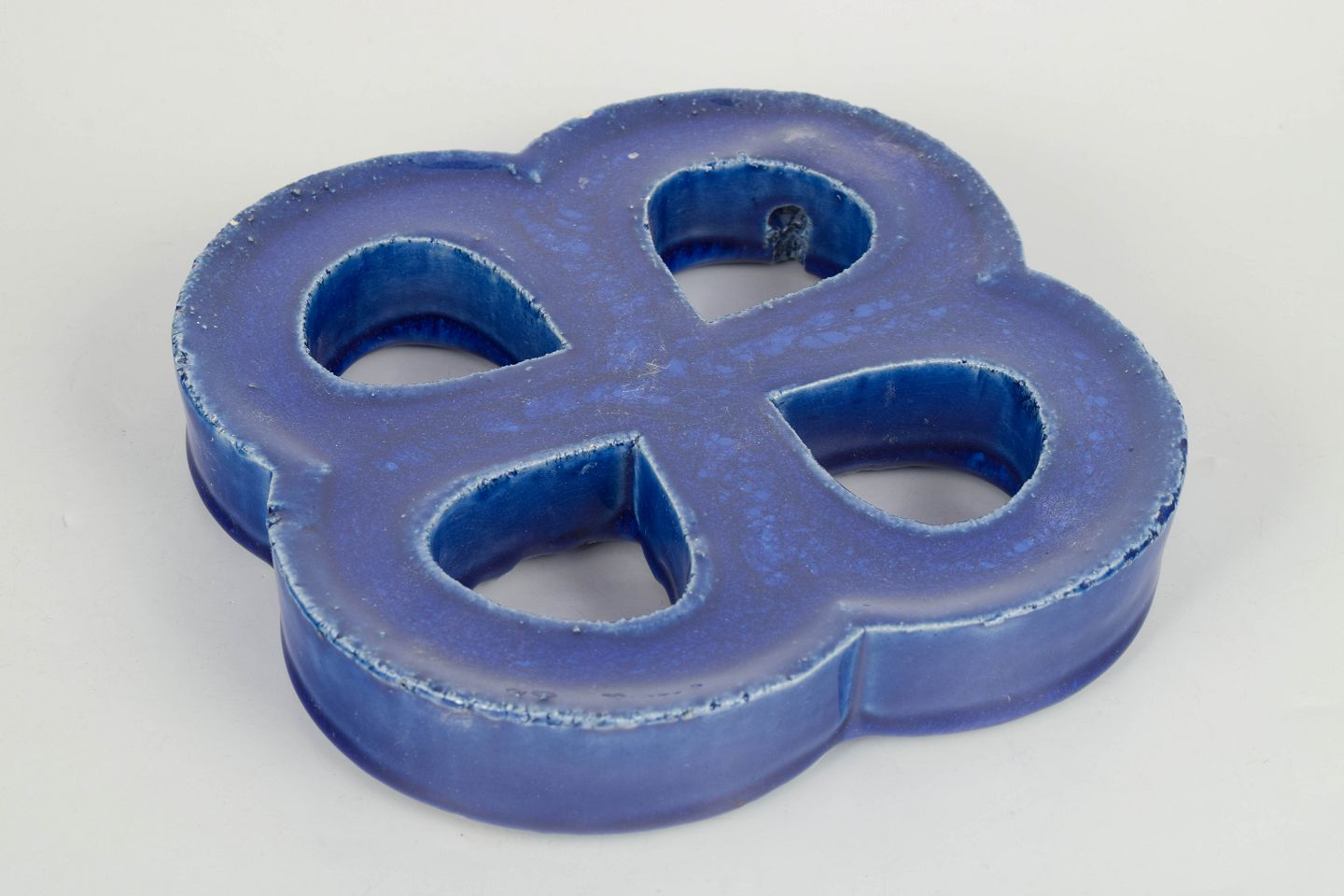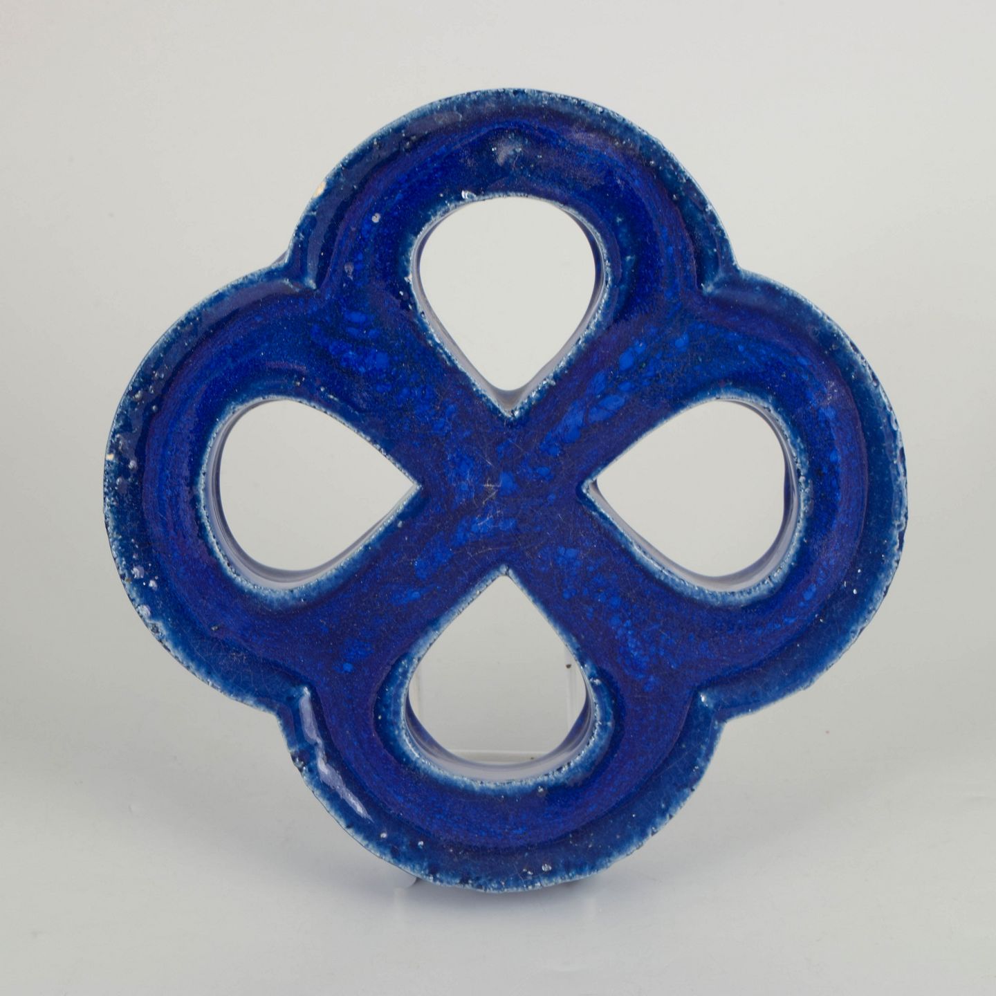 Gustavsberg vægrelief med ophæng.Dekorativt vægrelief i stentøj med organisk firkløverform og gennemgående åbninger. Udført med dyb blå, levende glasur med bobleeffekt og variation i overfladen. Bagside med hul til ophæng.