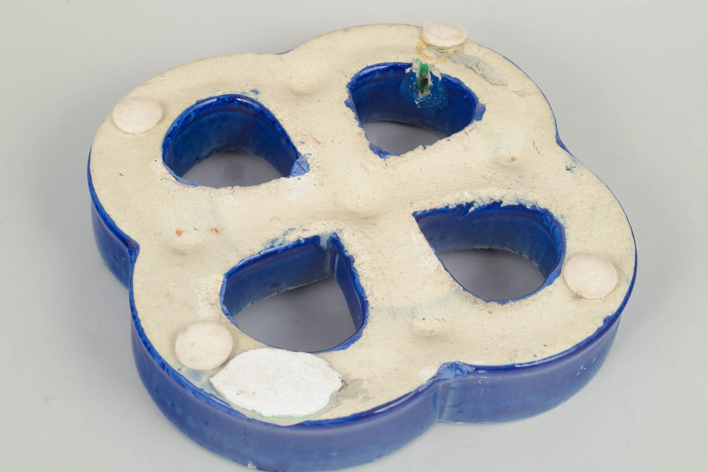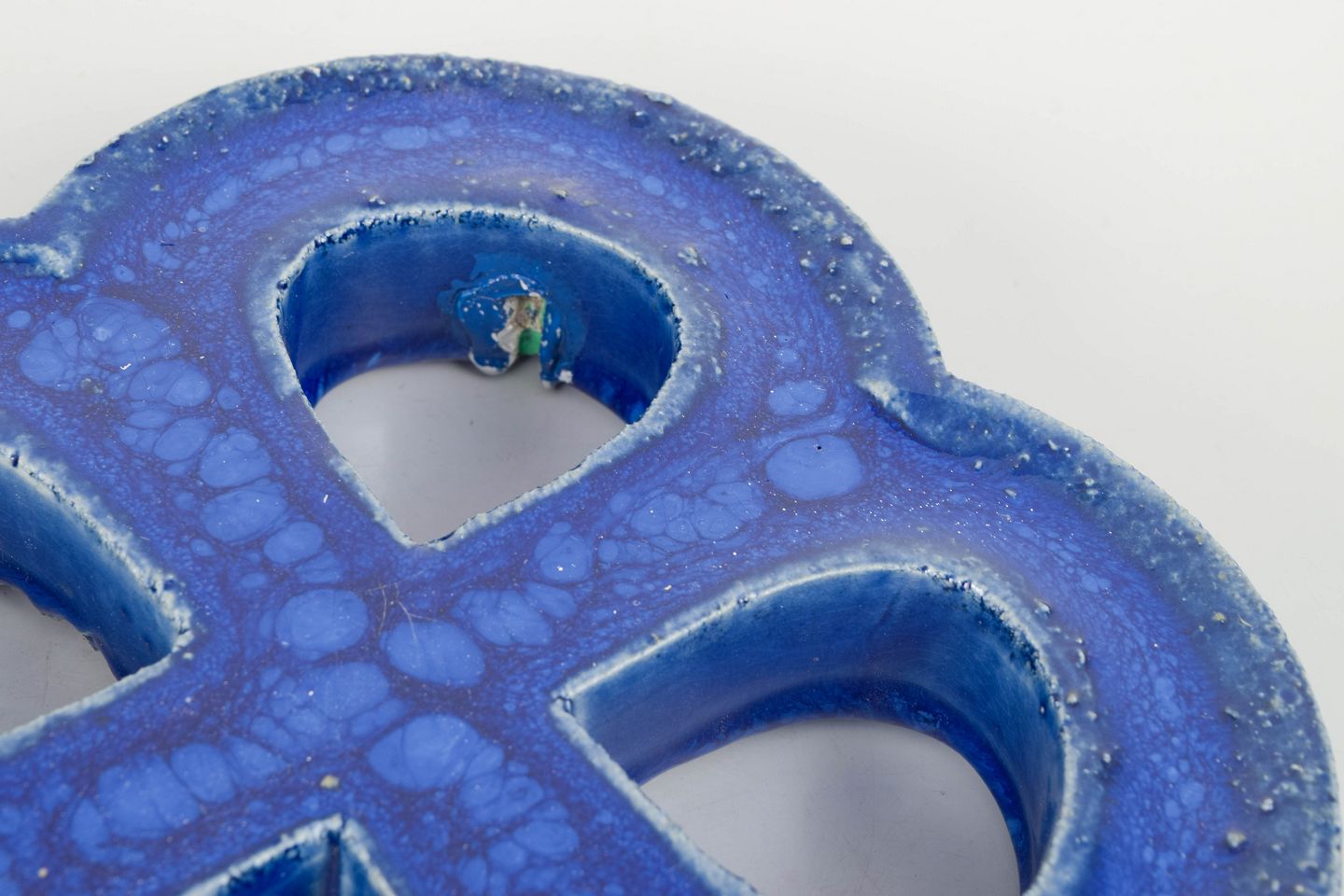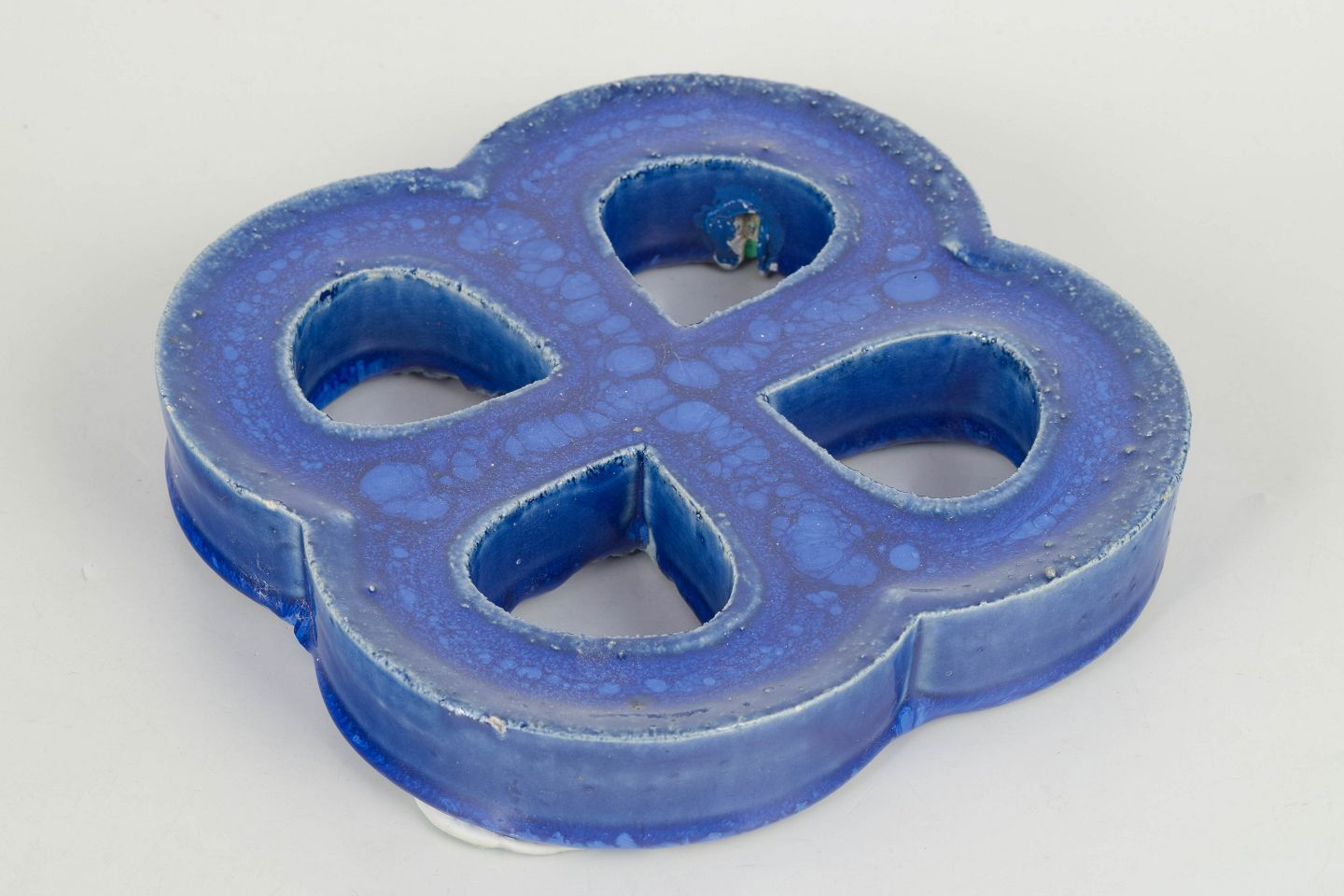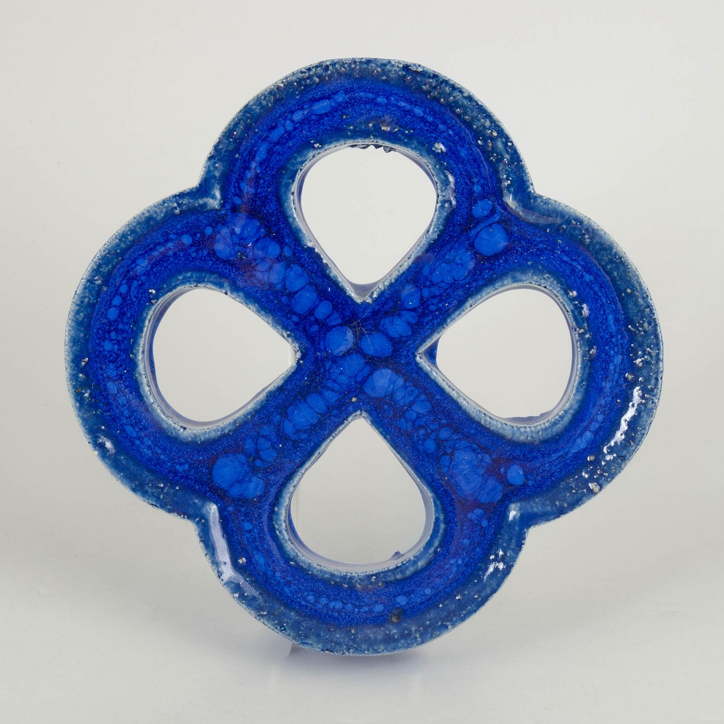 Gustavsberg vægrelief med ophæng.Dekorativt vægrelief i stentøj med organisk firkløverform og gennemgående åbninger. Udført med dyb blå, levende glasur med bobleeffekt og variation i overfladen. Bagside med hul til ophæng.