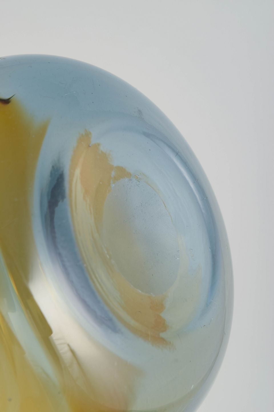 Murano glasvase.Kompakt vase i mundblæst glas med afrundet form og lagdelte farver i varme orange og gyldne toner over lys blå bund.